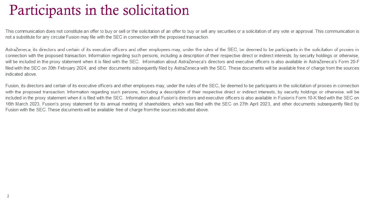 Neither AstraZeneca nor Fusion undertakes any obligation to publicly update any forward-looking statement, whether as a result of new information, future events or otherwise, except to the extent required by law. Additional factors that could cause results to differ materially from those described in the forward-looking statements can be found in AstraZeneca’s Annual Report on Form 20 F for the year ended 31st December 2023 and Fusion’s Annual Report on Form 10 K for the year ended 31st December 2023, in each case as amended by any subsequent filings made with the SEC. These and other filings made by AstraZeneca and Fusion with the SEC are available at www.sec.gov.