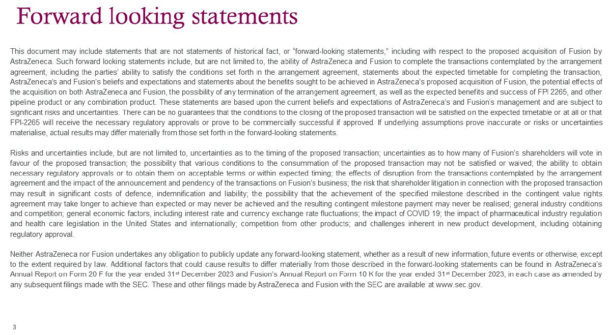 This document may include statements that are not statements of historical fact, or “forward-looking statements,” including with respect to the proposed acquisition of Fusion by AstraZeneca. Such forward looking statements include, but are not limited to, the ability of AstraZeneca and Fusion to complete the transactions contemplated by the arrangement agreement, including the parties’ ability to satisfy the conditions set forth in the arrangement agreement, statements about the expected timetable for completing the transaction, AstraZeneca’s and Fusion’s beliefs and expectations and statements about the benefits sought to be achieved in AstraZeneca’s proposed acquisition of Fusion, the potential effects of the acquisition on both AstraZeneca and Fusion, the possibility of any termination of the arrangement agreement, as well as the expected benefits and success of FPI 2265, and other pipeline product or any combination product. These statements are based upon the current beliefs and expectations of AstraZeneca’s and Fusion’s management and are subject to significant risks and uncertainties. There can be no guarantees that the conditions to the closing of the proposed transaction will be satisfied on the expected timetable or at all or that FPI-2265 will receive the necessary regulatory approvals or prove to be commercially successful if approved. If underlying assumptions prove inaccurate or risks or uncertainties materialise, actual results may differ materially from those set forth in the forward-looking statements.