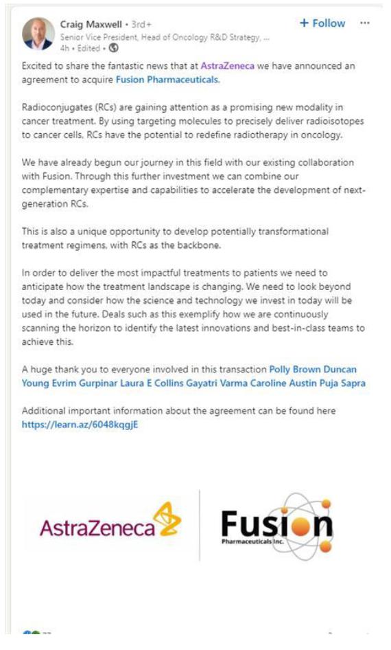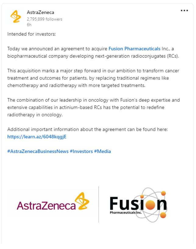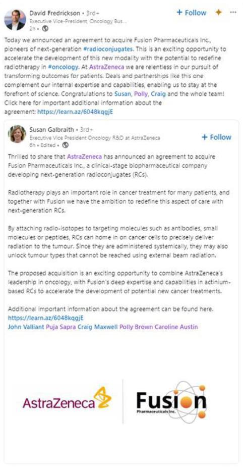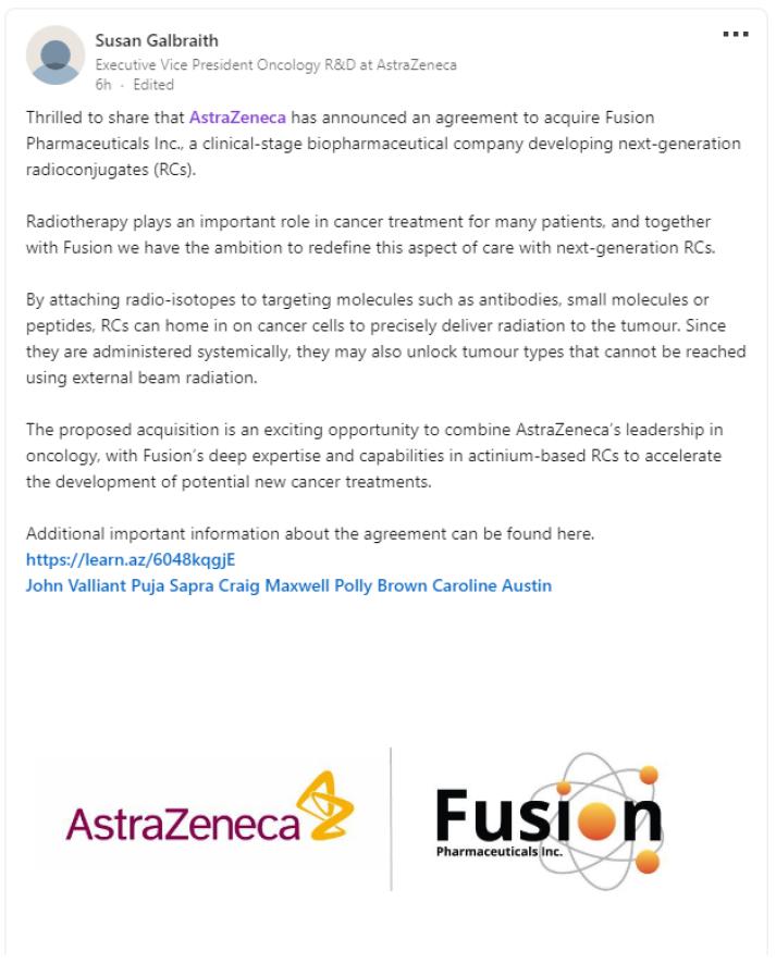 Thrilled to share that @AstraZeneca has announced an agreement to acquire Fusion Pharmaceuticals Inc., a clinical-stage biopharmaceutical company developing next-generation radioconjugates (RCs).