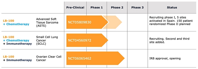 Based on the observations in ovarian clear cell carcinoma, the Company has initiated a clinical trial in this disease combining LB-100 with a monoclonal antibody blocking PD-1, a protein found on T-cells (NCT06065462). Further, in an ongoing Phase 1b clinical trial in previously untreated patients with small cell lung cancer, LB-100 is being escalated with a combination of full dose carboplatin, etoposide, and atezolizumab (NCT04560972). This clinical trial is being sponsored and conducted at the City of Hope National Medical Center in Duarte, California.