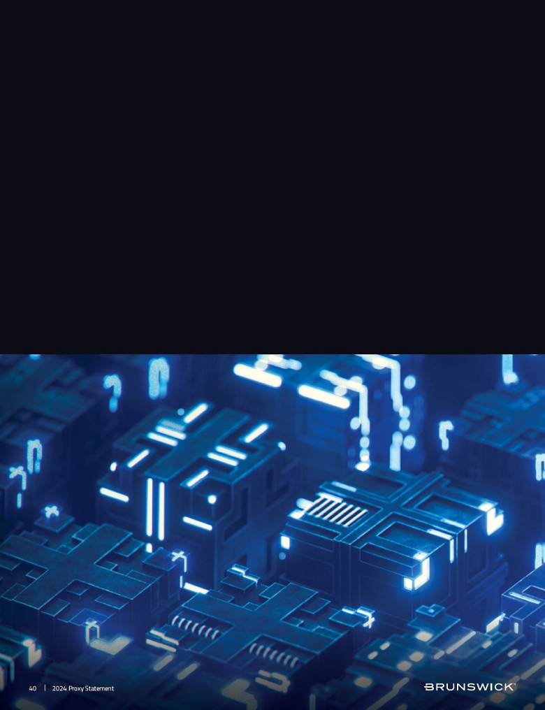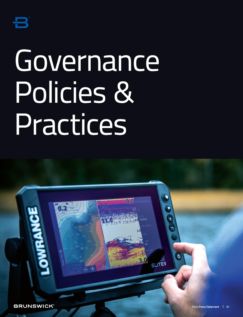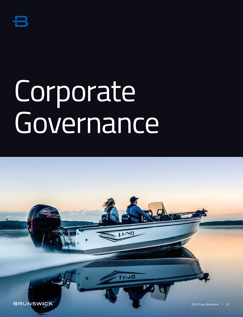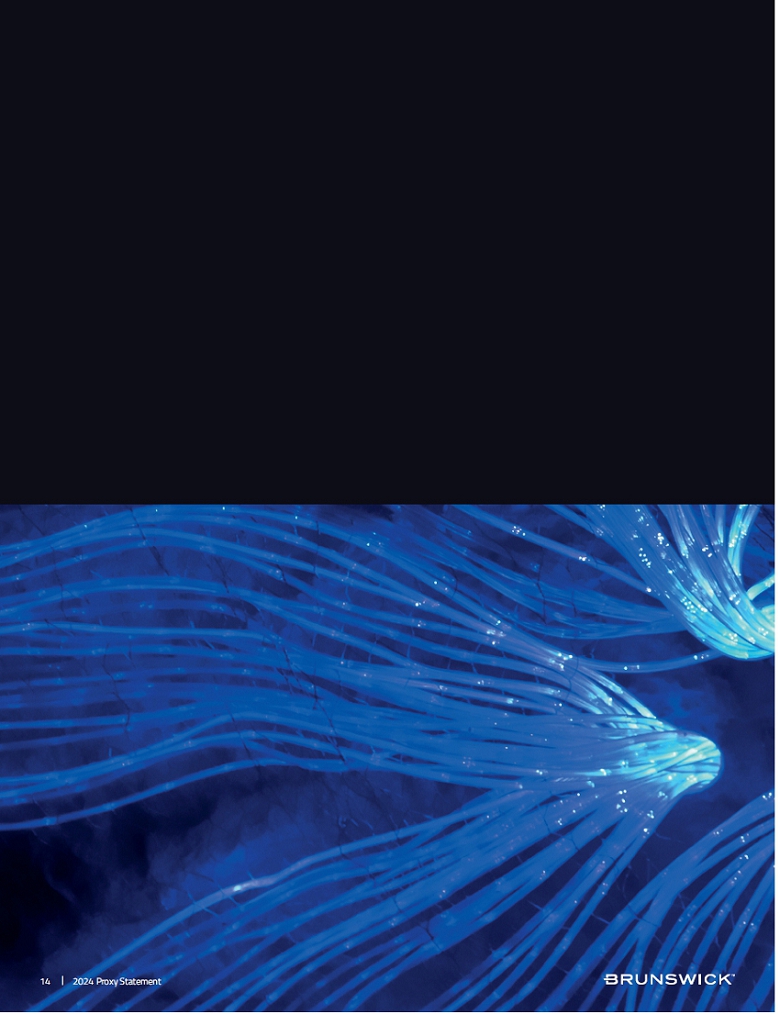 | The Nominating and Corporate Governance Committee of the Board of Directors oversees our ESG programming and reviews the strategy and progress at each of its regular meetings because we understand the impact our business has on the world. Brunswick has a unique opportunity to lead with sustainable, responsible initiatives and seeks to comply with applicable regulations. We strive to continually improve energy efficiency and minimize the | carbon emissions of our operations, supply chain, and product portfolio and deliver more cost-effective and lower carbon technology products and solutions to our customers. We do our best to ensure the well-being of our employees, customers, and the public. These efforts are integrated into our business strategy and operations.