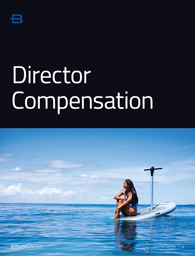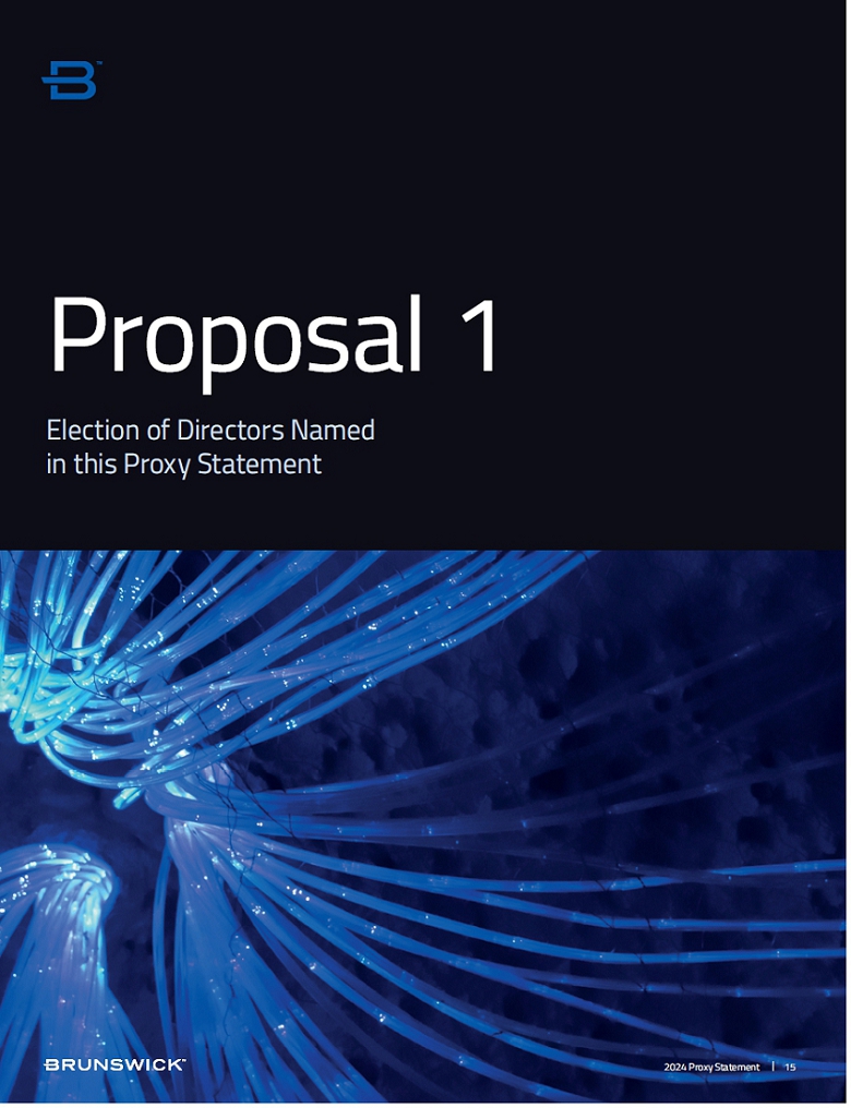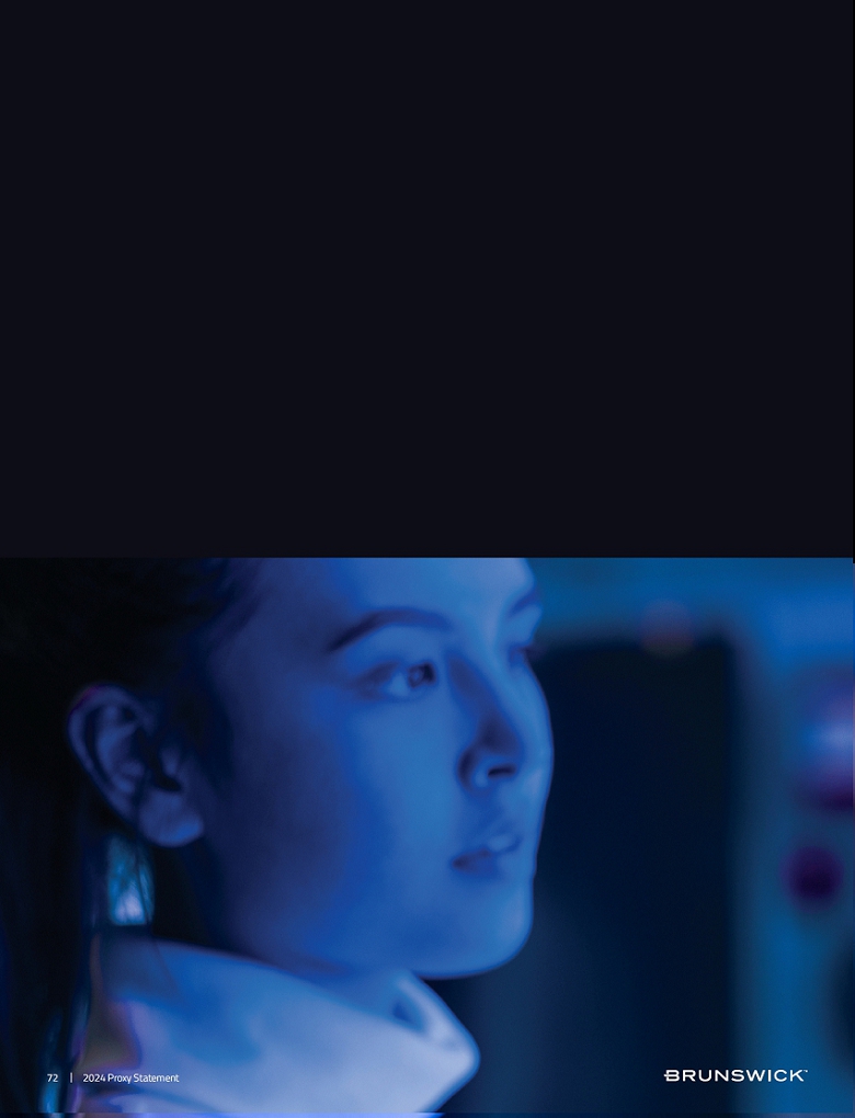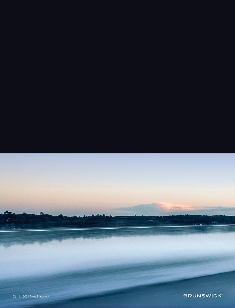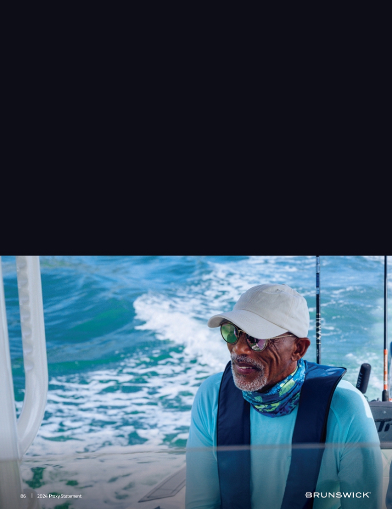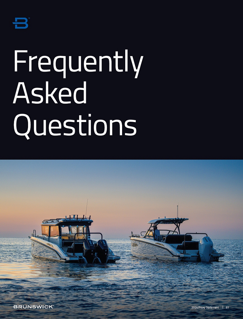 | Certain statements in this Proxy Statement are forward-looking statements as defined in the Private Securities Litigation Reform Act of 1995. Forward-looking statements are based on current expectations, estimates, and projections and by their nature address matters that are, to different degrees, uncertain. Words such as “may,” “could,” “should,” “expect,” “believe” and similar expressions are intended to identify forward-looking statements. Forward-looking statements are not guarantees of future performance and involve certain risks that may cause actual results to differ materially from expectations as of the date of this Proxy Statement. These risks include, but are not limited to, those set forth in Brunswick’s Annual Report on Form 10-K for the fiscal year ended December 31, 2023 and subsequent reports filed with the Securities and Exchange Commission. |