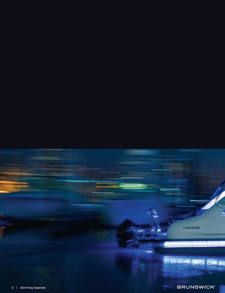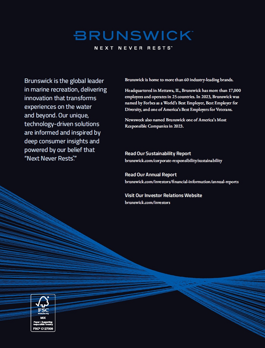 ● The launch of a powerful Brunswick brand update and new tagline, Next Never Rests™, reflecting our commitment to continuously challenging ourselves to move Brunswick and the marine industry forward through customer-driven, technology-enabled solutions across our portfolio of category-leading brands and businesses. ● The introduction of our first electrified products, including Mercury Marine’s Avator electric outboard product line, now with five models, and the introduction of Veer, an award-winning brand designed to support electric propulsion and appeal to the next generation of boaters. ● The acquisition of Fliteboard, a world leader in electric foiling technology, with the most respected brand and product line in this growing and exciting activity. ● Freedom Boat Club’s continued, rapid, global expansion with additional locations in the US, Europe, and its first locations in Australia for more than 410 locations worldwide. ● The launch of Mercury Racing’s 500R outboard engine, raising the bar again in propulsion solutions for high-performance boating. ● Brunswick Boat Group’s launch of 70 new or refreshed products in 2023, yielding numerous awards and driving market share gains in many categories. |