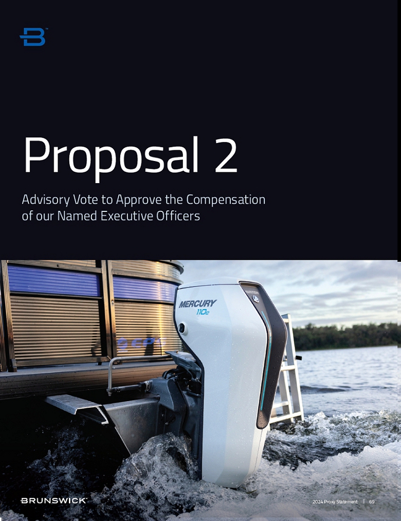 | Signature [PLEASE SIGN WITHIN BOX] Date Signature (Joint Owners) Date TO VOTE, MARK BLOCKS BELOW IN BLUE OR BLACK INK AS FOLLOWS: KEEP THIS PORTION FOR YOUR RECORDS DETACH AND RETURN THIS PORTION ONLY THIS PROXY CARD IS VALID ONLY WHEN SIGNED AND DATED. V32133-P02442 ! ! ! ! ! ! ! ! ! ! ! ! ! ! ! ! ! ! ! ! ! ! ! ! ! ! ! BRUNSWICK CORPORATION 26125 N. RIVERWOODS BLVD., SUITE 500 METTAWA, IL 60045-3420 1. The Election to Brunswick’s Board of Directors of the ten nominees named in the Proxy Statement. The Board of Directors recommends you vote FOR all of the following nominees: 1b. David C. Everitt 1g. David V. Singer 1c. Reginald Fils-Aimé 1h. J. Steven Whisler 1d. Lauren P. Flaherty 1i. Roger J. Wood 1f. Joseph W. McClanathan 1a. Nancy E. Cooper 1e. David M. Foulkes 1j. MaryAnn Wright BRUNSWICK CORPORATION For Against Abstain The Board of Directors recommends you vote FOR the following proposals: 2. Advisory vote to approve the compensation of our Named Executive Officers. 3. The ratification of the Audit and Finance Committee’s appointment of Deloitte & Touche LLP as the Company’s independent registered public accounting firm for the fiscal year ending December 31, 2024. NOTE: In their discretion, on such other business as may properly come before the meeting. Please sign exactly as your name(s) appear(s) hereon. When signing as attorney, executor, administrator or other fiduciary, please give full title as such. Joint owners should each sign personally. All holders must sign. If a corporation or partnership, please sign in full corporate or partnership name by authorized officer. For Against Abstain ! ! ! ! ! ! ! ! ! VOTE BY INTERNET Before The Meeting - Go to www.proxyvote.com or scan the QR Barcode above Use the Internet to transmit your voting instructions and for electronic delivery of information until 11:59 P.M. Eastern Time on Tuesday, April 30, 2024 for shares held directly and until 11:59 P.M. Eastern Time on April 26, 2024 for the Trustee to vote the employee plan shares. Have your proxy card in hand when you access the website and follow the instructions to obtain your records and to create an electronic voting instruction form. During The Meeting - Go to www.virtualshareholdermeeting.com/BC2024 You may attend the meeting via the Internet and vote during the meeting. Have the information that is printed in the box marked by the arrow available and follow the instructions. VOTE BY PHONE - 1-800-690-6903 Use any touch-tone telephone to transmit your voting instructions until 11:59 P.M. Eastern Time on Tuesday, April 30, 2024 for shares held directly and until 11:59 P.M. Eastern Time on April 26, 2024 for the Trustee to vote the employee plan shares. Have your proxy card in hand when you call and follow the instructions. VOTE BY MAIL Mark, sign, and date your proxy card and return it in the postage-paid envelope we have provided or return it to Vote Processing, c/o Broadridge, 51 Mercedes Way, Edgewood, NY 11717 to arrive by April 30, 2024. ELECTRONIC DELIVERY OF FUTURE PROXY MATERIALS You can consent to receive all future proxy statements, proxy cards, and annual reports electronically via e-mail or the Internet. To sign up for electronic delivery, please follow the instructions above to vote using the Internet and indicate that you agree to receive or access proxy materials electronically in future years. SCAN TO VIEW MATERIALS & VOTEw |