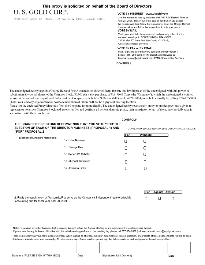 NOTICE IS HEREBY GIVEN that the Annual Meeting of Stockholders (the “Annual Meeting”) of U.S. Gold Corp., a Nevada corporation (the “Company”), will be held at 9:00 a.m. Mountain Time on April 26, 2024, or such later date or dates as such Annual Meeting date may be adjourned, in a virtual format only via live website at www.usgold.vote. The Annual Meeting will be held for the following purposes: