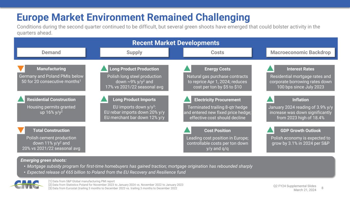 7 Forecasted Construction Starts – inflation adjusted (% change compared to average of 2019 to 20222) – 5% 10% 15% 20% 25% 2023 2024 2025 2026 – 20% 40% 60% 80% 2023 2024 2025 2026 – 5% 10% 15% 20% 25% 30% 2023 2024 2025 2026 Estimated Potential Impact on Rebar Demand1 Government Support for Investment Structural Trends Expected to Support North America Construction RESHORING AND SUPPLY CHAIN REALIGNMENT ENERGY TRANSITION AND LNG INVESTMENTS Significant structural investment is expected to power domestic construction and rebar consumption over a multi-year period. In addition to direct investments, the follow-on indirect impact should also be meaningful as many large-scale projects will require local investments in infrastructure, non-residential structures, and residential dwellings. [1] Company estimates; potential increase to demand is at full run-rate of programs and relative to current annual domestic demand of ~9 million tons [2] Dodge Analytics Construction Starts Forecast – Q4 2023 Edition INFRASTRUCTURE INVESTMENT $550B from Infrastructure Investment and Jobs Act $52B CHIPS Act $250B Inflation Reduction Act $12B DOE loans Funding from IRA Q2 FY24 Supplemental Slides March 21, 2024 +15% to 17% +3% to 5% +2% to 4% Public Works Manufacturing Power & Utilities