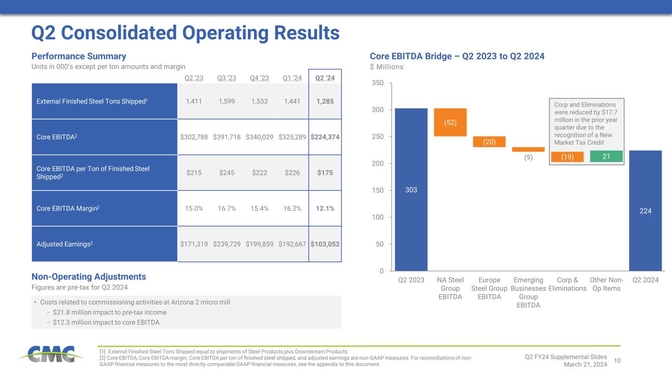 9 • North America Steel Group finished steel shipments expected to increase sequentially on typical seasonality; adjusted EBITDA margin should be largely stable on a sequential basis • Conditions for Europe Steel Group expected to remain challenging, but adjusted EBITDA should approach breakeven during the third quarter • Financial results for Emerging Businesses Group anticipated to improve meaningfully in the third quarter • Spring and summer construction activity expected to be robust in North America, which should benefit financial results for both the North America Steel Group and the Emerging Businesses Group during the second half of fiscal 2024 • Demand conditions in North America remained supportive though impacted by seasonality and severe weather − Finished steel shipments increased 3.6% y/y, while rebar shipments (mill direct rebar and downstream) improved 4.9% from the prior year period • North America Steel Group steel product margin declined $113 per ton from the prior year period − Improved sequentially throughout the quarter and ended at a high point • Downstream product margins over scrap1 remained near record levels, but declined roughly $81 per ton from the prior year period • North America Steel Group controllable costs per ton decreased on y/y basis, driven by lower per unit costs for freight and consumables − Adjusted EBITDA in second quarter of fiscal 2024 included $12.3 million related to Arizona 2 commissioning costs compared to $6.8 million during the second quarter of fiscal 2023 • Market conditions for Europe Steel Group remained challenging, but showed improvement compared to recent quarters as supply and demand moved into better balance − Margins over scrap cost increased by $11 per ton from the sequential quarter − Shipments decreased by 20% from the sequential quarter • Emerging Businesses Group grew net sales by 1.6% y/y, driven by the acquisition of CMC Anchoring Systems, while adjusted EBITDA margin declined by 580 basis points − Positive impacts from the addition of CMC Anchoring Systems and strong profitability within heat-treating operations were more than offset by weather disruptions in the U.S. and project delays in regions outside the U.S. P e rf o rm a n c e D ri v e rs O u tl o o k Q2 Operational Update [1] Downstream Product Margin Over Scrap equals Average Selling Price minus cost of ferrous scrap utilized during the prior quarter Q2 FY24 Supplemental Slides March 21, 2024