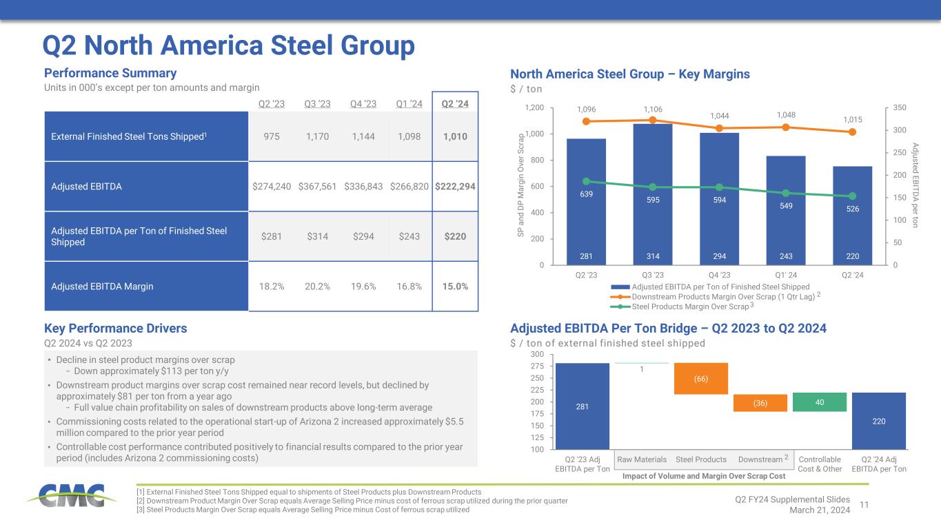 10 Corp and Eliminations were reduced by $17.7 million in the prior year quarter due to the recognition of a New Market Tax Credit 303 224 (52) (20) (9) (19) 21 0 50 100 150 200 250 300 350 Q2 2023 NA Steel Group EBITDA Europe Steel Group EBITDA Emerging Businesses Group EBITDA Corp & Eliminations Other Non- Op Items Q2 2024 Q2 Consolidated Operating Results Q2 ’23 Q3 ’23 Q4 ’23 Q1 ’24 Q2 ’24 External Finished Steel Tons Shipped1 1,411 1,599 1,533 1,441 1,285 Core EBITDA2 $302,788 $391,718 $340,029 $325,289 $224,374 Core EBITDA per Ton of Finished Steel Shipped2 $215 $245 $222 $226 $175 Core EBITDA Margin2 15.0% 16.7% 15.4% 16.2% 12.1% Adjusted Earnings2 $171,319 $239,729 $199,859 $192,667 $103,052 Performance Summary Units in 000’s except per ton amounts and margin • Costs related to commissioning activities at Arizona 2 micro mill − $21.8 million impact to pre-tax income − $12.3 million impact to core EBITDA Non-Operating Adjustments Figures are pre-tax for Q2 2024 [1] External Finished Steel Tons Shipped equal to shipments of Steel Products plus Downstream Products [2] Core EBITDA, Core EBITDA margin, Core EBITDA per ton of finished steel shipped, and adjusted earnings are non-GAAP measures. For reconciliations of non- GAAP financial measures to the most directly comparable GAAP financial measures, see the appendix to this document. Core EBITDA Bridge – Q2 2023 to Q2 2024 $ Millions Q2 FY24 Supplemental Slides March 21, 2024