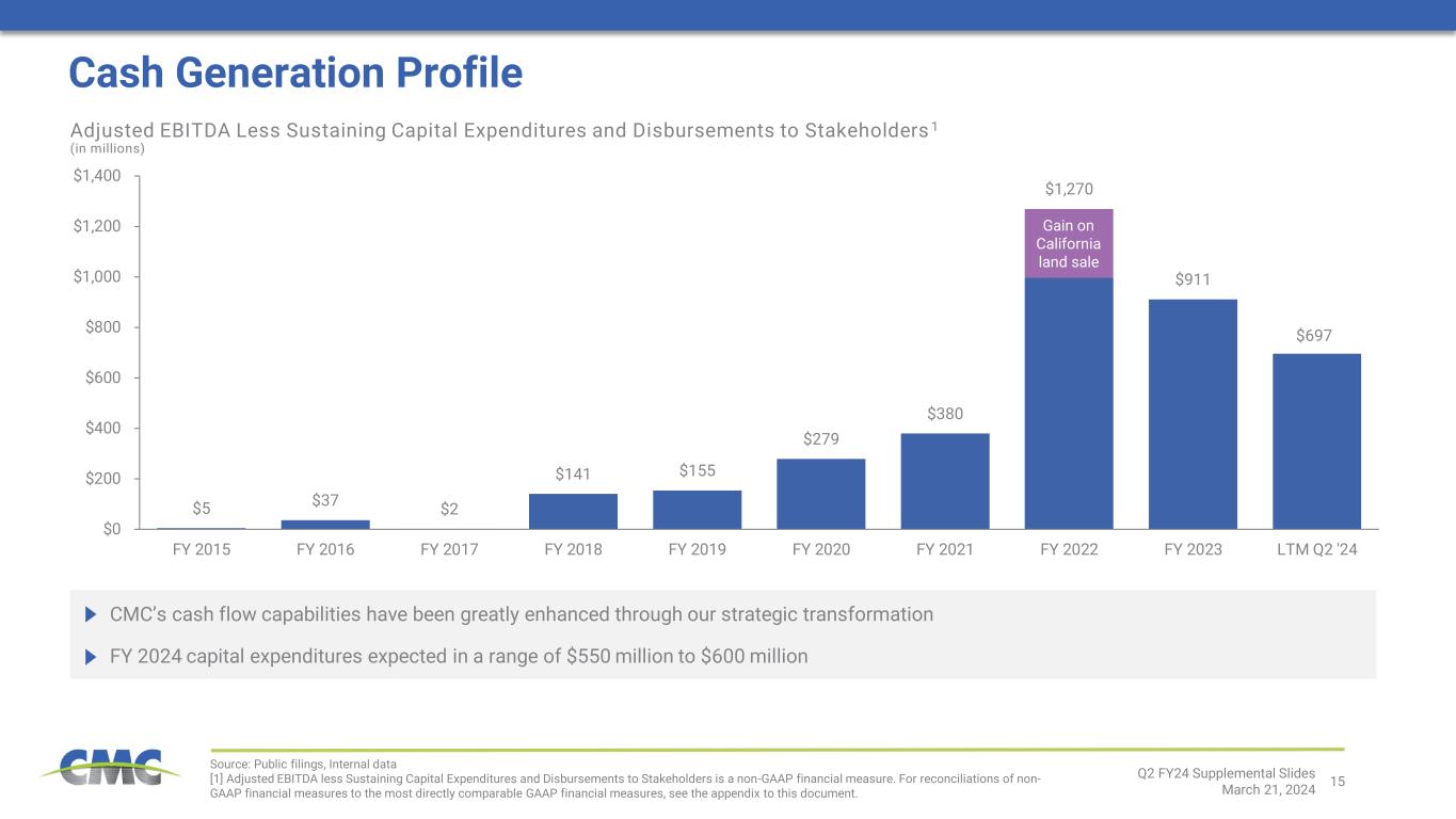 14 • Sustaining capital expenditures • Growth − Completion of Arizona 2 − Construction of CMC Steel West Virginia − Organic growth in EBG − Opportunistic M&A • Cash distributions to shareholders − Share repurchases − Cash dividends 2 31 Disciplined Capital Allocation Strategy CMC Capital Allocation Priorities: $850 million share repurchase program ($510 million remaining1) Quarterly dividend of $0.18 per share (increased 13% this quarter; up 50% since end of fiscal 2021) Shareholder Cash Distribution Programs in Place Value-Generating Growth Shareholder Distributions Debt Management CMC will prudently allocate capital while maintaining a strong and flexible balance sheet Q2 FY24 Supplemental Slides March 21, 2024 • Cash flow from earnings • Working capital release 2024 Sources and Potential Sources of Cash 2024 Uses and Potential Uses of Cash [1] As of February 29, 2024