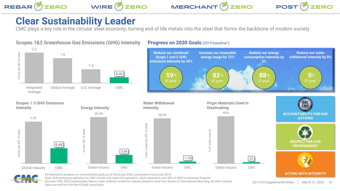 17 4 5 % 4 6 % 4 2 % 3 7 % 3 3 % 3 2 % 2 4 % 1 8 % 2 1 % 2 2 % 2 0 % 1 7 % 1 8 % 1 4 % 2 4 % 1 7 % 1 5 % 1 5 % 1 3 % 1 1 % 8 % 1 0 % 0% 5% 10% 15% 20% 25% 30% 35% 40% 45% 50% 3 .8 x 3 .9 x 3 .2 x 2 .5 x 1 .9 x 1 .6 x 1 .2 x 0 .9 x 1 .1 x 1 .2 x 1 .0 x 0 .8 x 0 .7 x 0 .5 x 0 .7 x 0 .5 x 0 .4 x 0 .5 x 0 .5 x 0 .4 x 0 .3 x 0 .4 x NM 0.5x 1.0x 1.5x 2.0x 2.5x 3.0x 3.5x 4.0x 4.5x Source: Public filings, Internal data Notes: 1. Total debt is defined as long-term debt plus current maturities of long-term debt and short-term borrowings. 2. Net Debt is defined as total debt less cash & cash equivalents. 3. EBITDA depicted is adjusted EBITDA from continuing operations on a trailing 12-month basis. 4. Net debt-to-capitalization is defined as net debt on CMC’s balance sheet divided by the sum of total debt and stockholders’ equity. For a reconciliation of non-GAAP financial measures to the most directly comparable GAAP financial measures, see the appendix to this document. Leverage Profile Financial strength gives us the flexibility to fund our announced projects, pursue opportunistic M&A, and distribute cash to shareholders Net Debt1,2 / EBITDA3 Net Debt-to-Capitalization4 Transformational rebar asset acquisition Tensar acquisition Construction of Arizona 2 Transformational rebar asset acquisition Tensar acquisition Construction of Arizona 2 Q2 FY24 Supplemental Slides March 21, 2024