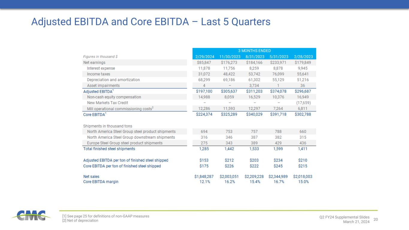 During the second quarter of fiscal 2024, the Company recorded a net after-tax charge of $17.2 million related to commissioning efforts at the Arizona 2 micro mill. Excluding this item, second quarter adjusted earnings were $103.1 million, or $0.88 per diluted share, compared to adjusted earnings of $171.3 million, or $1.44 per diluted share, in the prior year period. Prior year period adjustments included a $5.5 million after-tax charge related to commissioning efforts at the Arizona 2 micro mill, as well as a $14.0 million after-tax benefit that was reflected within Corporate and Other related to a New Market Tax Credit Settlement associated with CMC's Steel Oklahoma micro mill. "Adjusted EBITDA," "core EBITDA," "core EBITDA margin," "adjusted earnings" and "adjusted earnings per diluted share" are non-GAAP financial measures. Details, including a reconciliation of each such non-GAAP financial measure to the most directly comparable measure prepared and presented in accordance with GAAP, can be found in the financial tables that follow.