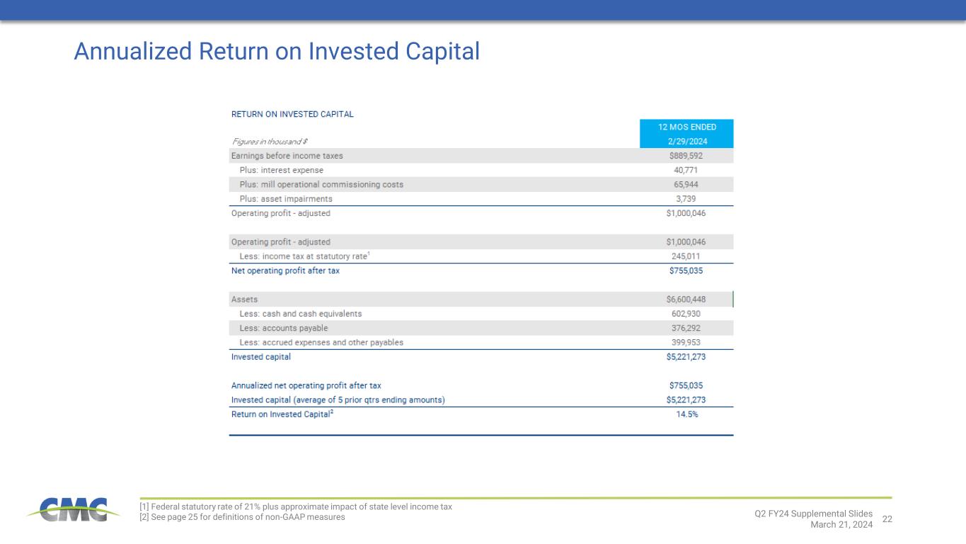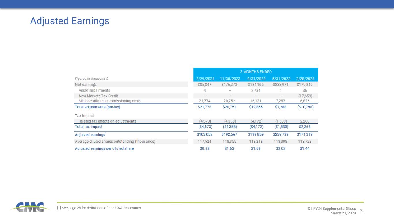 21 Adjusted Earnings [1] See page 25 for definitions of non-GAAP measures Q2 FY24 Supplemental Slides March 21, 2024