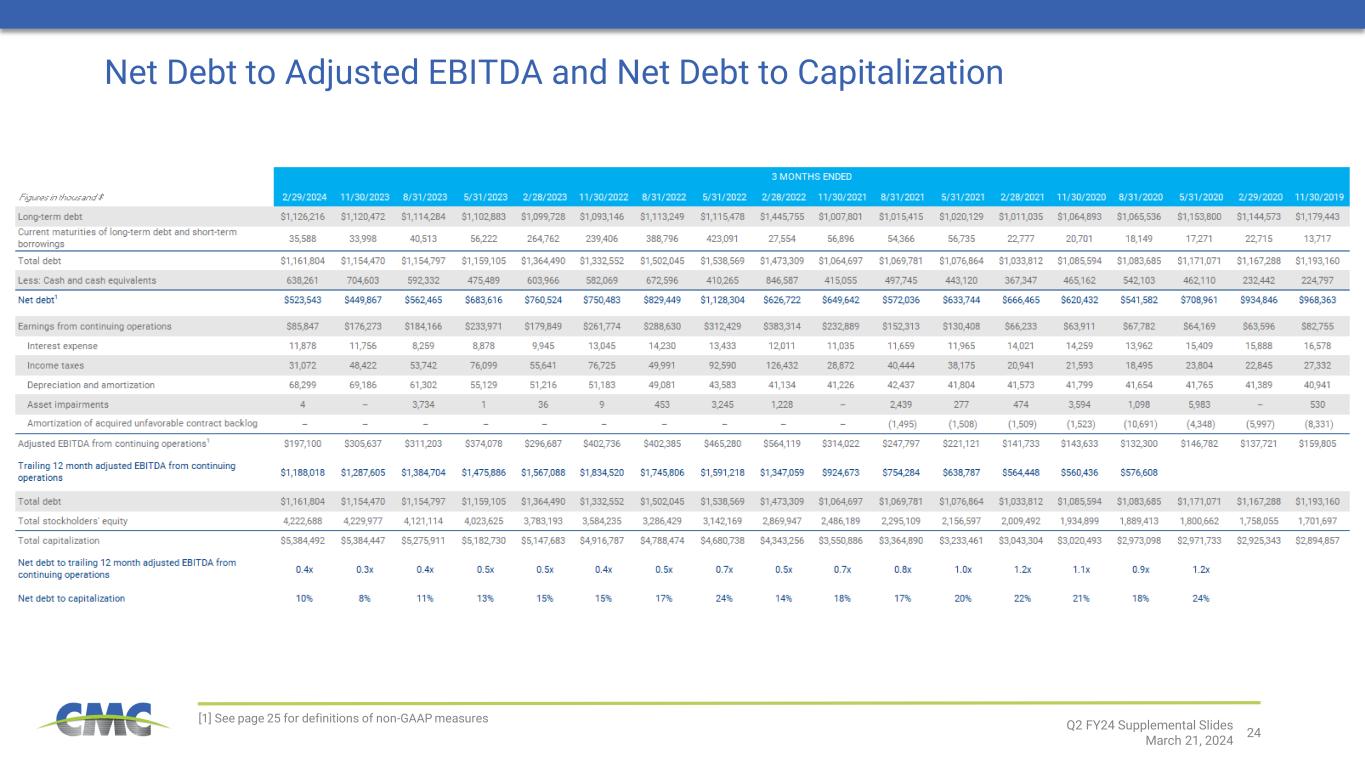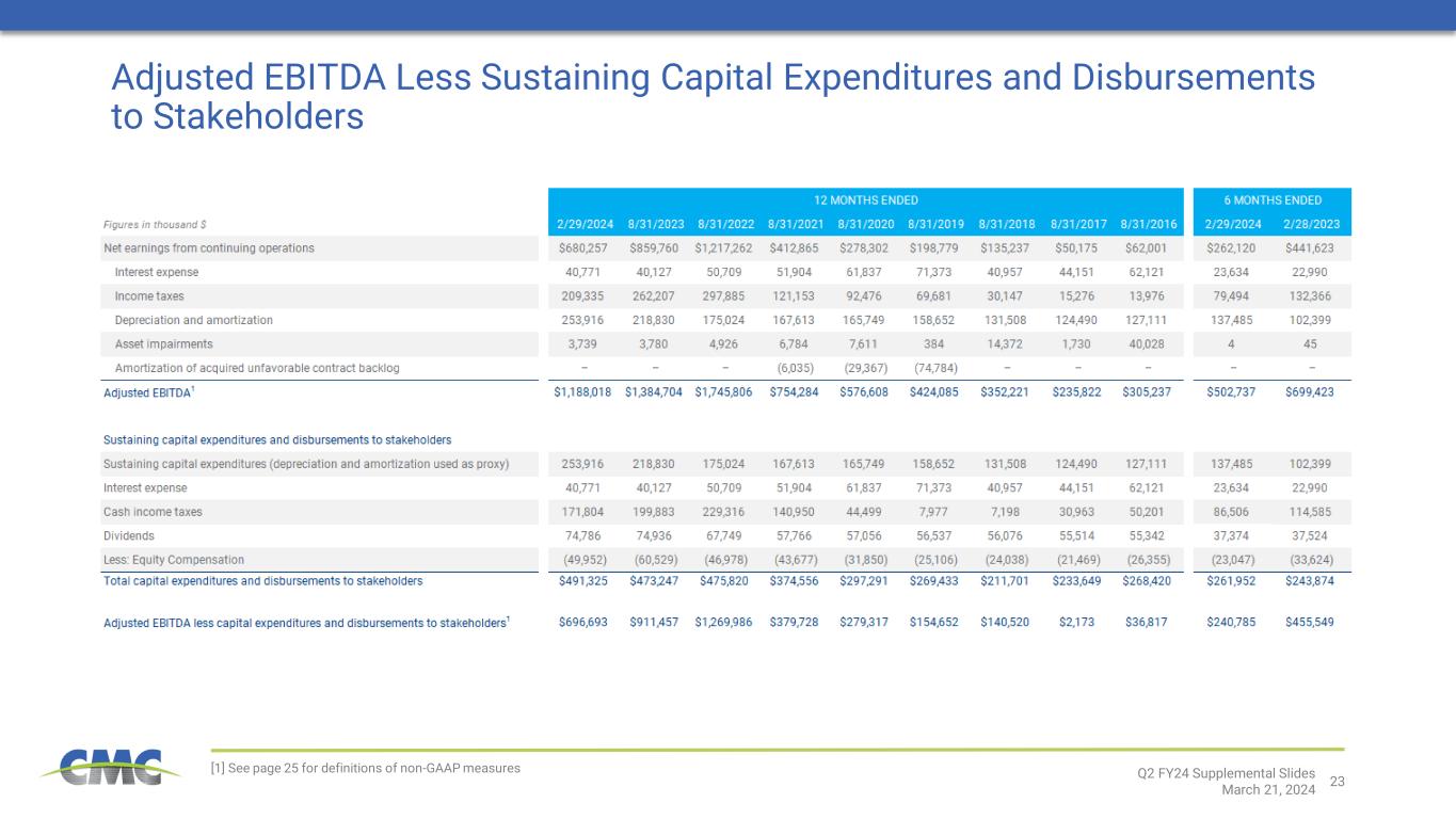 23 [1] See page 25 for definitions of non-GAAP measures Adjusted EBITDA Less Sustaining Capital Expenditures and Disbursements to Stakeholders Q2 FY24 Supplemental Slides March 21, 2024
