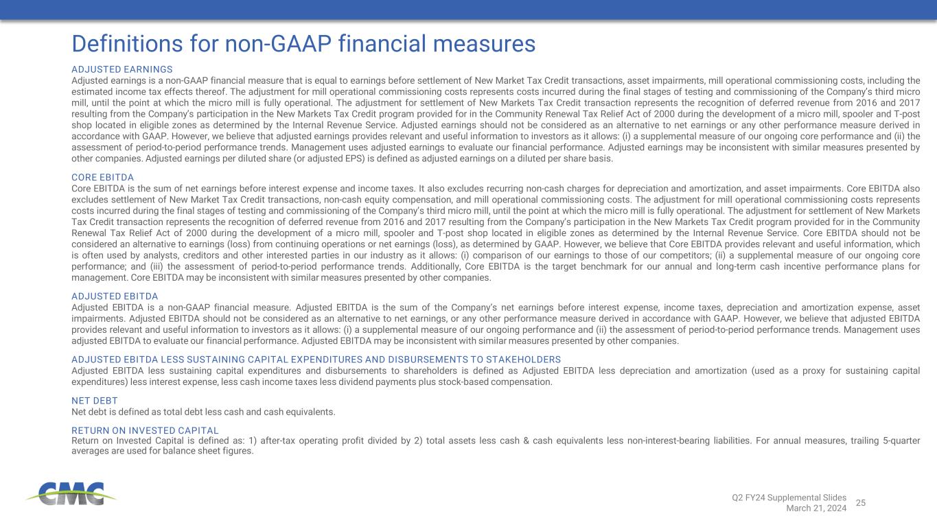 25 Definitions for non-GAAP financial measures ADJUSTED EARNINGS Adjusted earnings is a non-GAAP financial measure that is equal to earnings before settlement of New Market Tax Credit transactions, asset impairments, mill operational commissioning costs, including the estimated income tax effects thereof. The adjustment for mill operational commissioning costs represents costs incurred during the final stages of testing and commissioning of the Company’s third micro mill, until the point at which the micro mill is fully operational. The adjustment for settlement of New Markets Tax Credit transaction represents the recognition of deferred revenue from 2016 and 2017 resulting from the Company’s participation in the New Markets Tax Credit program provided for in the Community Renewal Tax Relief Act of 2000 during the development of a micro mill, spooler and T-post shop located in eligible zones as determined by the Internal Revenue Service. Adjusted earnings should not be considered as an alternative to net earnings or any other performance measure derived in accordance with GAAP. However, we believe that adjusted earnings provides relevant and useful information to investors as it allows: (i) a supplemental measure of our ongoing core performance and (ii) the assessment of period-to-period performance trends. Management uses adjusted earnings to evaluate our financial performance. Adjusted earnings may be inconsistent with similar measures presented by other companies. Adjusted earnings per diluted share (or adjusted EPS) is defined as adjusted earnings on a diluted per share basis. CORE EBITDA Core EBITDA is the sum of net earnings before interest expense and income taxes. It also excludes recurring non-cash charges for depreciation and amortization, and asset impairments. Core EBITDA also excludes settlement of New Market Tax Credit transactions, non-cash equity compensation, and mill operational commissioning costs. The adjustment for mill operational commissioning costs represents costs incurred during the final stages of testing and commissioning of the Company’s third micro mill, until the point at which the micro mill is fully operational. The adjustment for settlement of New Markets Tax Credit transaction represents the recognition of deferred revenue from 2016 and 2017 resulting from the Company’s participation in the New Markets Tax Credit program provided for in the Community Renewal Tax Relief Act of 2000 during the development of a micro mill, spooler and T-post shop located in eligible zones as determined by the Internal Revenue Service. Core EBITDA should not be considered an alternative to earnings (loss) from continuing operations or net earnings (loss), as determined by GAAP. However, we believe that Core EBITDA provides relevant and useful information, which is often used by analysts, creditors and other interested parties in our industry as it allows: (i) comparison of our earnings to those of our competitors; (ii) a supplemental measure of our ongoing core performance; and (iii) the assessment of period-to-period performance trends. Additionally, Core EBITDA is the target benchmark for our annual and long-term cash incentive performance plans for management. Core EBITDA may be inconsistent with similar measures presented by other companies. ADJUSTED EBITDA Adjusted EBITDA is a non-GAAP financial measure. Adjusted EBITDA is the sum of the Company’s net earnings before interest expense, income taxes, depreciation and amortization expense, asset impairments. Adjusted EBITDA should not be considered as an alternative to net earnings, or any other performance measure derived in accordance with GAAP. However, we believe that adjusted EBITDA provides relevant and useful information to investors as it allows: (i) a supplemental measure of our ongoing performance and (ii) the assessment of period-to-period performance trends. Management uses adjusted EBITDA to evaluate our financial performance. Adjusted EBITDA may be inconsistent with similar measures presented by other companies. ADJUSTED EBITDA LESS SUSTAINING CAPITAL EXPENDITURES AND DISBURSEMENTS TO STAKEHOLDERS Adjusted EBITDA less sustaining capital expenditures and disbursements to shareholders is defined as Adjusted EBITDA less depreciation and amortization (used as a proxy for sustaining capital expenditures) less interest expense, less cash income taxes less dividend payments plus stock-based compensation. NET DEBT Net debt is defined as total debt less cash and cash equivalents. RETURN ON INVESTED CAPITAL Return on Invested Capital is defined as: 1) after-tax operating profit divided by 2) total assets less cash & cash equivalents less non-interest-bearing liabilities. For annual measures, trailing 5-quarter averages are used for balance sheet figures. Q2 FY24 Supplemental Slides March 21, 2024