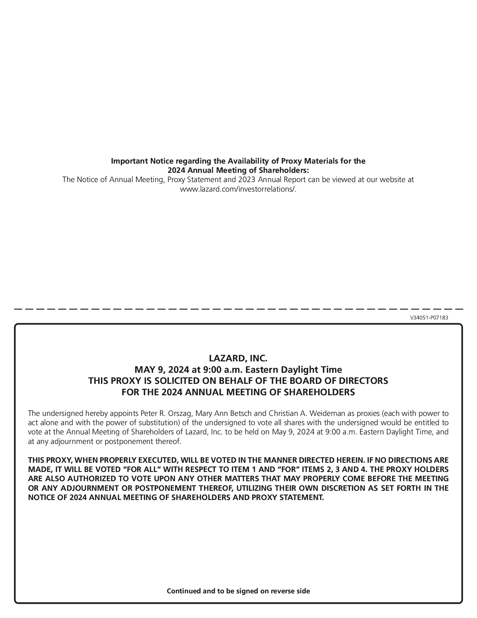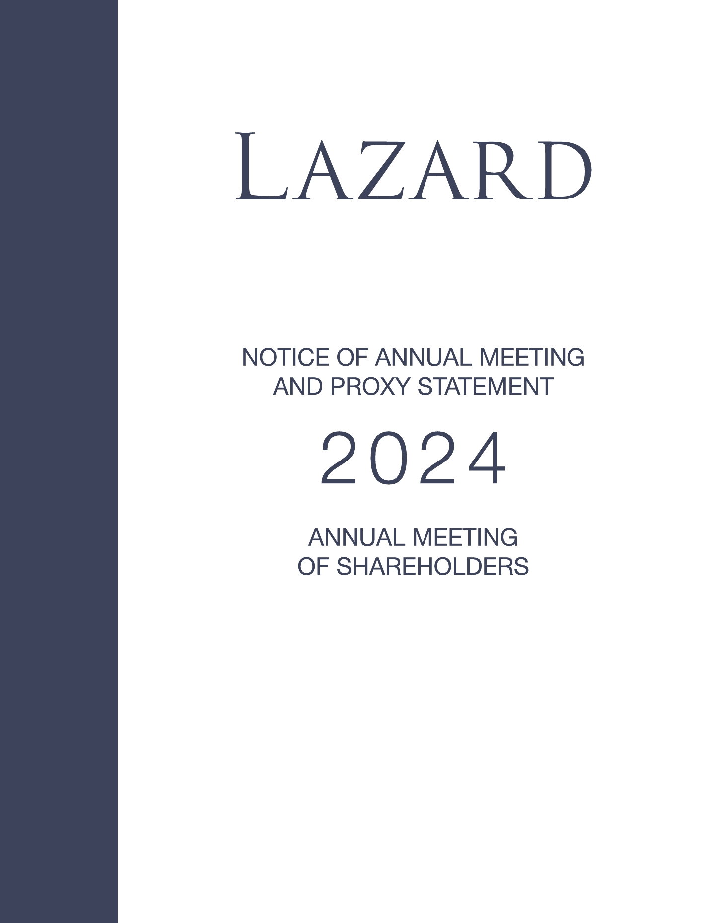Pursuant to the Deferred Compensation Retirement Policy, outstanding and unvested PIPRs, RSUs, PRUs, restricted stock and LFIs will vest (and in the case of members of Lazard Group who report income from Lazard Group and its affiliates on Schedule K-1 to Lazard Group’s federal income tax return, RSUs and certain PRSUs will be settled in restricted stock) as long as (i) the holder is at least 56 years old, (ii) the holder has completed at least five years of service with the Company, (iii) the sum of the holder’s actual age and years of service is at least 70, and (iv) commencing with the relevant deferred compensation granted in 2021, the holder has completed a service period following the date of grant and ending in the year of the applicable grant on August 31st, in the case of awards granted to Managing Directors, unless another date is set forth in the applicable award agreement. Similarly, following the retirement eligibility date, the service-based vesting criteria of the PRUs will no longer apply, but the performance-based vesting criteria will continue to apply through the end of the applicable performance period, including following the executive’s retirement during the performance period. Following retirement, the PIPRs, RSUs, PRUs, restricted stock and LFIs remain subject to all restrictive covenants, including continued compliance with non-compete, non-solicit and other provisions contained in the original award agreement through the original vesting date of the relevant deferred compensation, notwithstanding any expiration date specified therein. Any dividends payable with respect to the PIPRs, RSUs, PRUs and restricted stock are held in escrow until the forfeiture provisions lapse. A recipient of restricted stock is required to make an election under Section 83(b) of the Internal Revenue Code, which subjects him or her to taxation on such restricted stock on the date of grant. With the consent of the compliance department of the Company, a recipient may dispose of a portion of the restricted stock granted to him or her to pay such taxes.