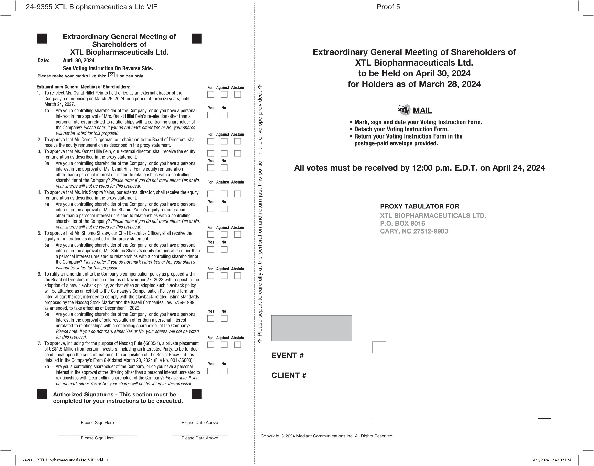 On March 21, 2024, XTL Biopharmaceuticals Ltd. (the “Company”) announced that it will hold an Extraordinary General Meeting of Shareholders on April 30, 2024 at 4:00 p.m. (Israel time) at the offices of the Company’s attorneys, Doron Tikotzky Kantor Gutman & Amit Gross., 7 Metsada St., B.S.R Tower 4, 33 Floor, Bnei Brak, Israel. In connection with the meeting, the Company furnishes the following documents: