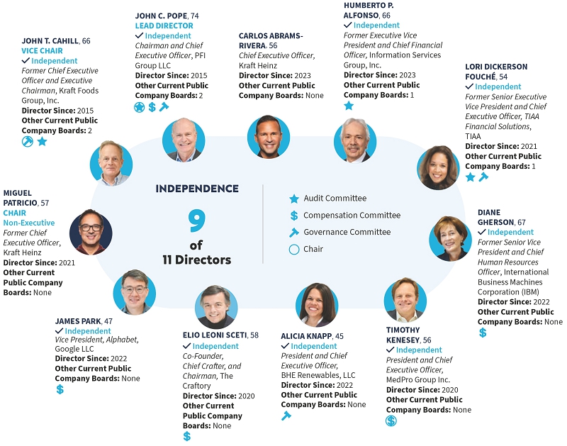 In December 2023, the Board added Carlos Abrams-Rivera to the Board and named John Cahill as Chair of the Nominating and Corporate Governance Committee. The Board believes Carlos brings deep consumer goods, brand building, and global markets experience and valuable insight as the Company’s CEO. The Board believes John’s deep governance experience gained from years as a public company executive and board member make him a valuable asset as Chair of the Governance Committee. John has been on the Kraft Heinz Board and served as Vice Chair since 2015.