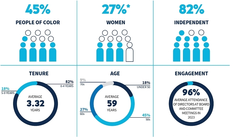 COMMITTED ENGAGEMENT AND RESPONSIVENESS As a Board, we value the relationships built with our stockholders. We continue to enhance the engagement program we launched in 2019. In 2023, we solicited input on topics including our CEO succession; governance policies and practices; executive compensation program; ESG efforts; and diversity, equity, inclusion, and belonging practices, including Board diversity.