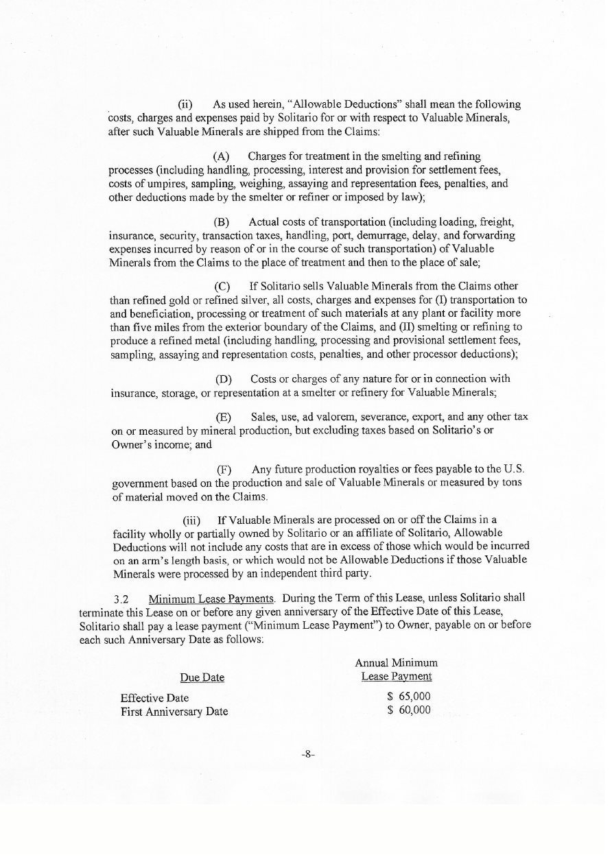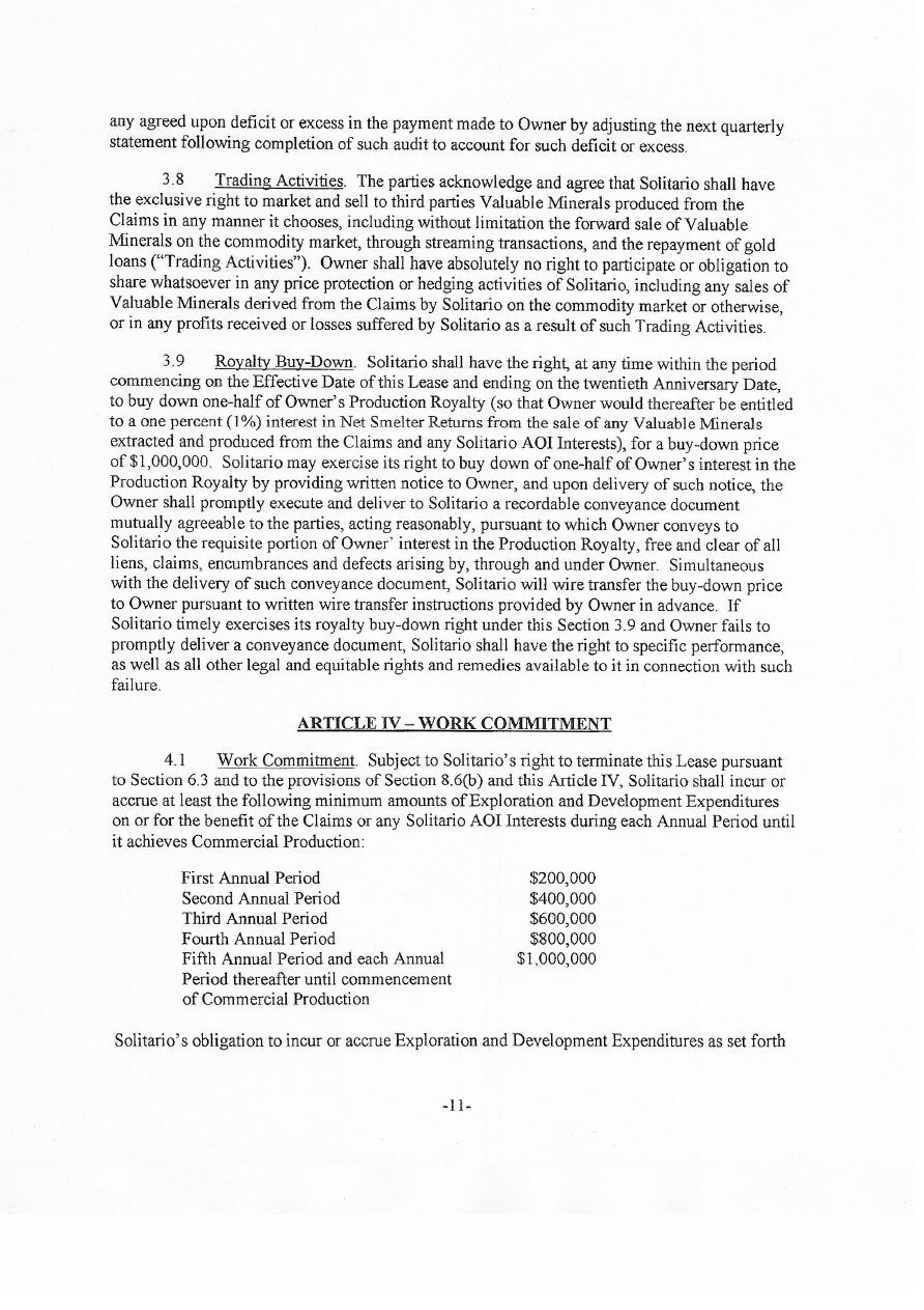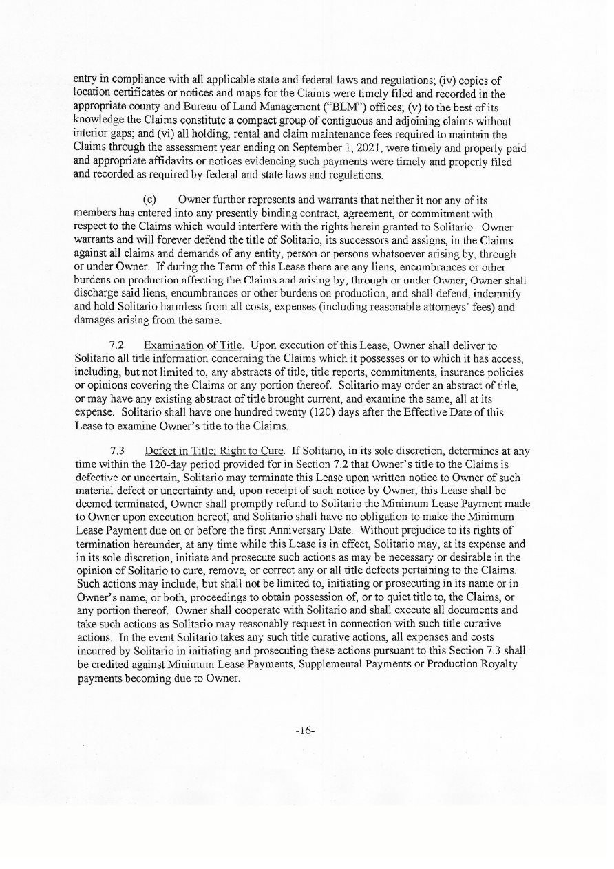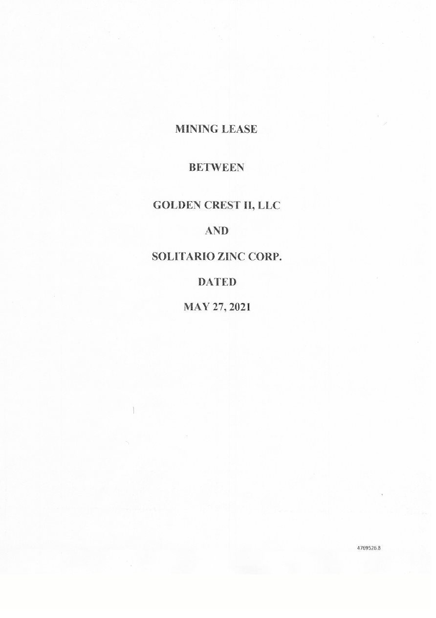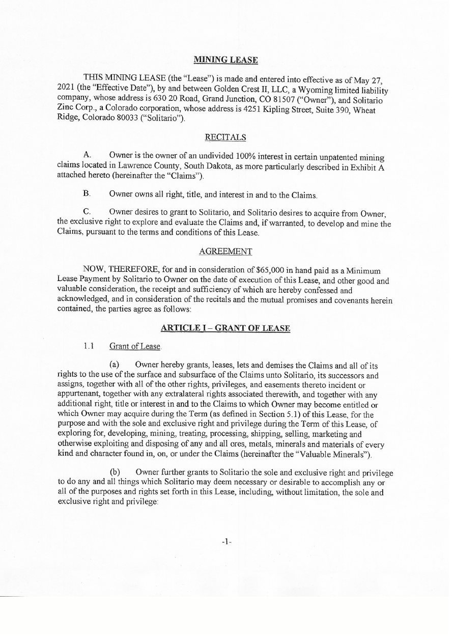 During 2021 Solitario entered into a lease agreement with Golden Crest II, LLC, a Wyoming limited liability company (the “GC Agreement”) whereby Solitario acquired exclusive exploration rights in certain claims (the “GC Claims”) in the Black Hills region of South Dakota. The GC Claims are part of Solitario’s Golden Crest project. Terms of the GC Agreement include required scheduled payments by Solitario to the underlying owner of $65,000 (paid upon signing) and an obligation to pay the underlying owner $60,000 at the first anniversary date which was paid in June 2022. Solitario recorded an initial acquisition cost of $125,000 during 2021 related to these required payments. In addition, to continue the lease, Solitario has agreed to pay, at its option, the underlying owner escalating annual payments that over five years total $340,000 and annual payments of $150,000 thereafter, which will be expensed as paid. Solitario has agreed to pay the underlying owner an additional success fee of $1.00 per ounce of gold in the event Solitario files a 43-101 qualified resource of up to 1.5 million ounces of gold or a maximum of $1,500,000. In order to maintain the lease in good standing, Solitario has agreed to escalating work commitments, on the GC Claims and a related area of interest around the GC Claims totaling $3,000,000 during the first five years of the lease, with the first and second-year minimum expenditures totaling $600,000 ending June 2022. Solitario has exceeded the minimum exploration expenditures required through 2023. The term of the GC Agreement is for twenty years and is automatically extended as long as Solitario is performing any exploration, development or mining activities on the GC Claims. The underlying owner retained a 2.0% Net Smelter Return royalty. Solitario will have the option, but not the obligation, to reduce the Net Smelter Return royalty to 1.0% by paying the owner $1,000,000.