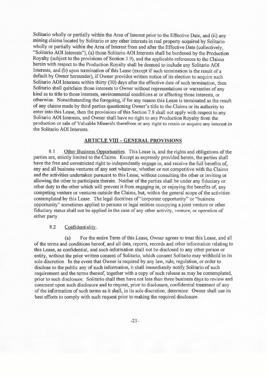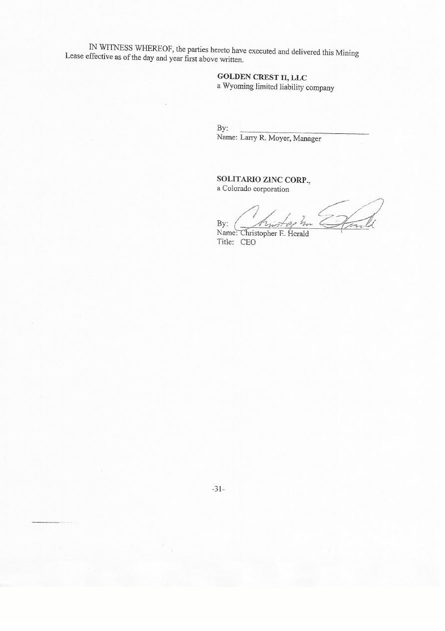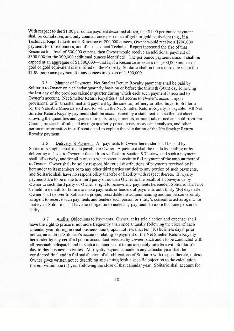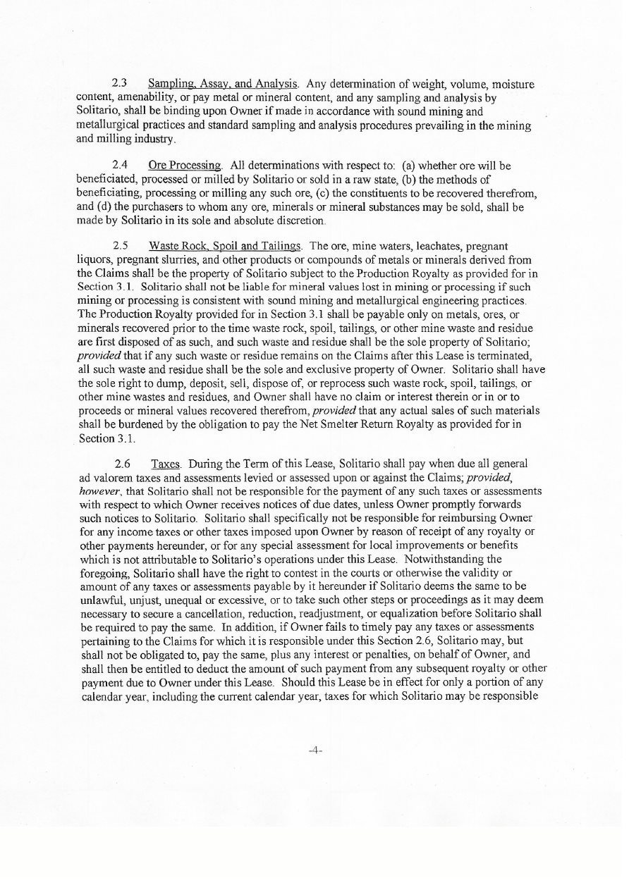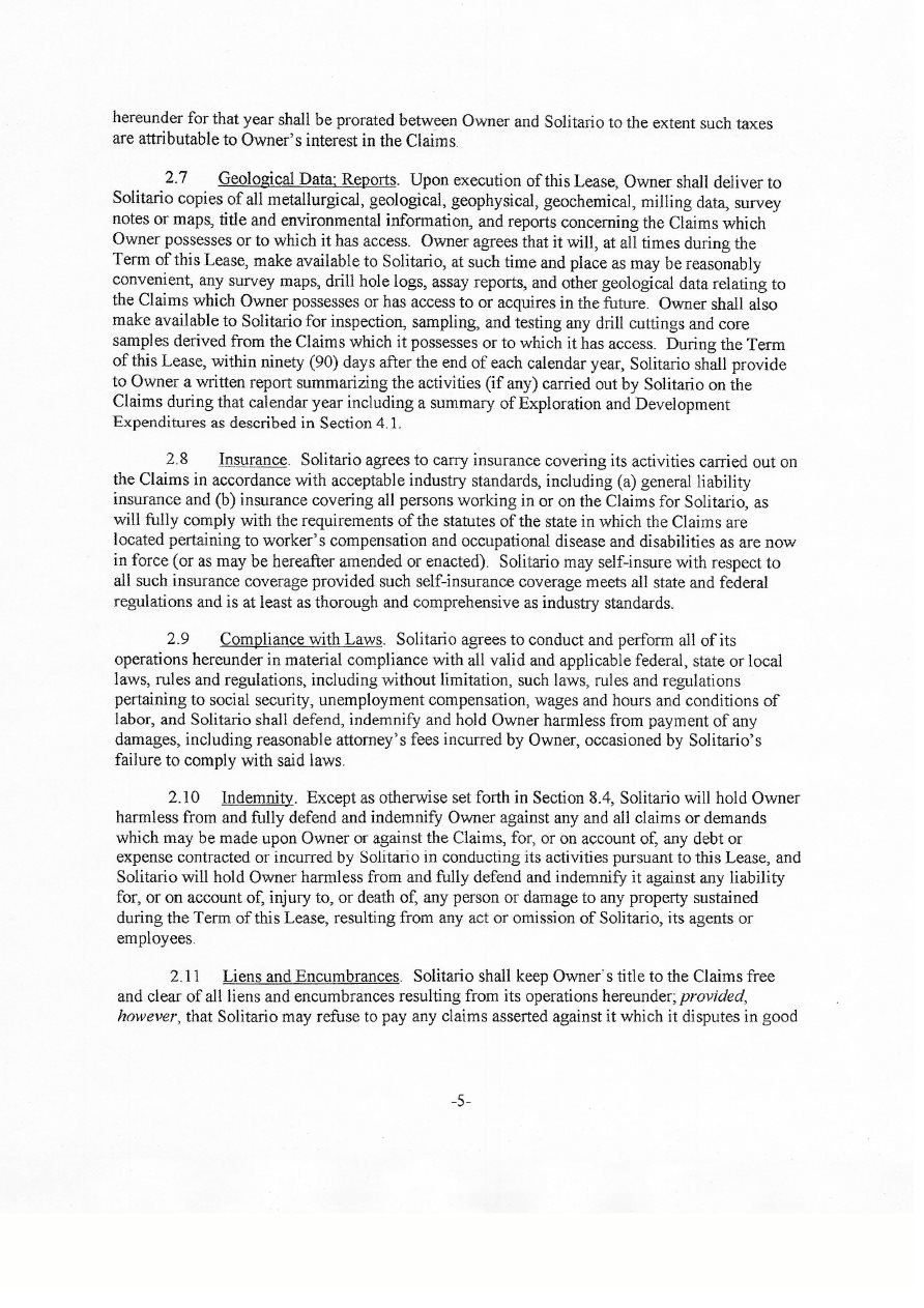 During 2021 Solitario entered into a lease agreement with Golden Crest II, LLC, a Wyoming limited liability company (the “GC Agreement”) whereby Solitario acquired exclusive exploration rights in certain claims (the “GC Claims”) in the Black Hills region of South Dakota. The GC Claims are part of Solitario’s Golden Crest project. Terms of the GC Agreement include required scheduled payments by Solitario to the underlying owner of $65,000 (paid upon signing) and an obligation to pay the underlying owner $60,000 at the first anniversary date which was paid in June 2022. Solitario recorded an initial acquisition cost of $125,000 during 2021 related to these required payments. In addition, to continue the lease, Solitario has agreed to pay, at its option, the underlying owner escalating annual payments that over five years total $340,000 and annual payments of $150,000 thereafter, which will be expensed as paid. Solitario has agreed to pay the underlying owner an additional success fee of $1.00 per ounce of gold in the event Solitario files a 43-101 qualified resource of up to 1.5 million ounces of gold or a maximum of $1,500,000. In order to maintain the lease in good standing, Solitario has agreed to escalating work commitments, on the GC Claims and a related area of interest around the GC Claims totaling $3,000,000 during the first five years of the lease, with the first and second-year minimum expenditures totaling $600,000 ending June 2022. Solitario has exceeded the minimum exploration expenditures required through 2023. The term of the GC Agreement is for twenty years and is automatically extended as long as Solitario is performing any exploration, development or mining activities on the GC Claims. The underlying owner retained a 2.0% Net Smelter Return royalty. Solitario will have the option, but not the obligation, to reduce the Net Smelter Return royalty to 1.0% by paying the owner $1,000,000.
