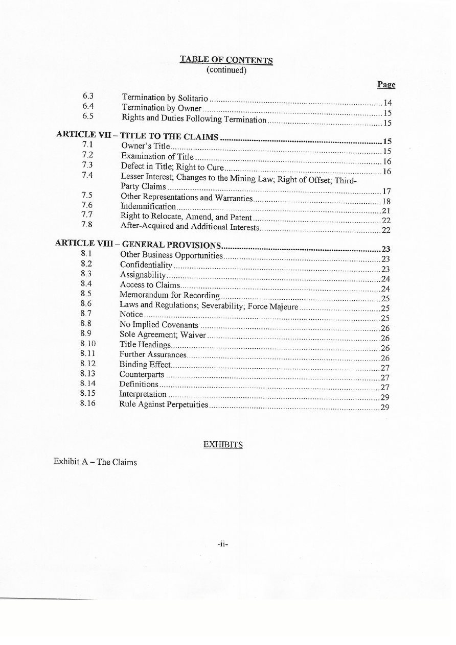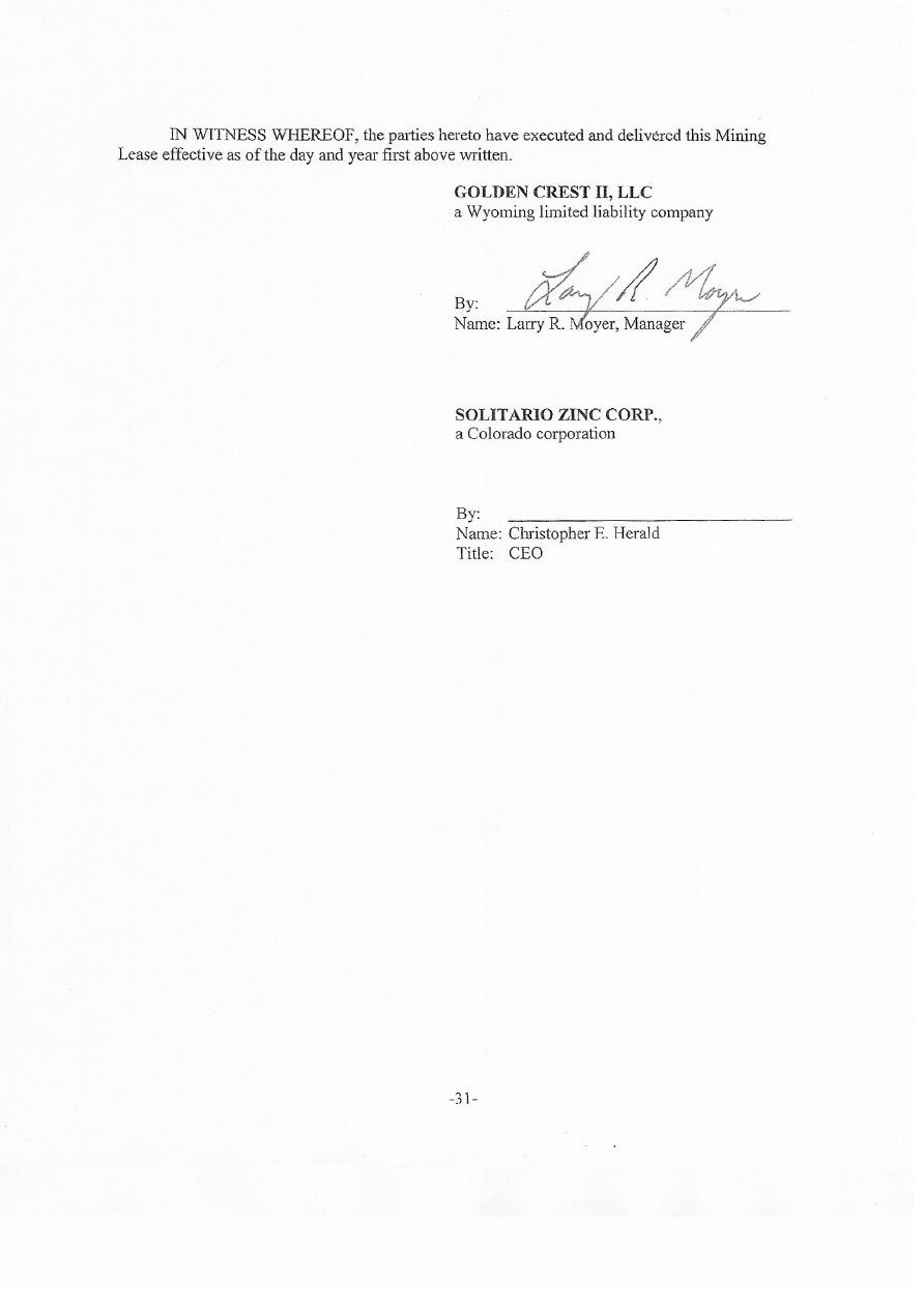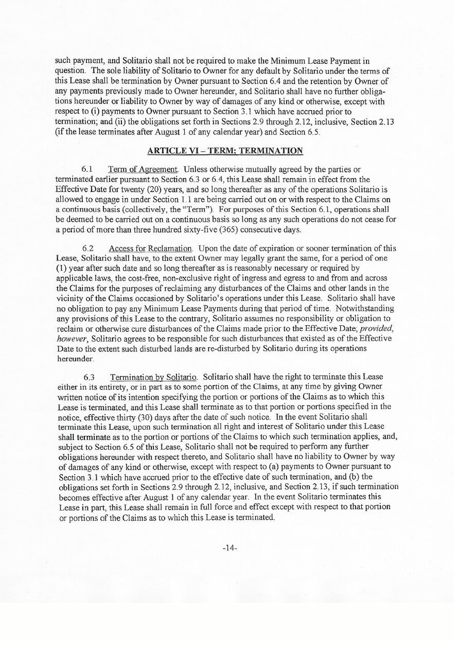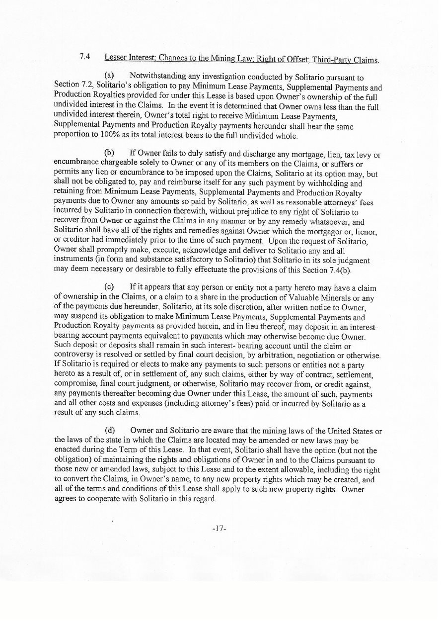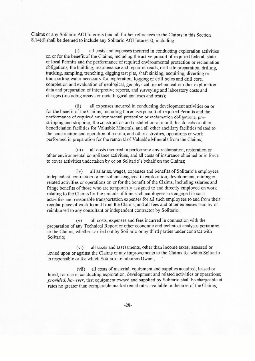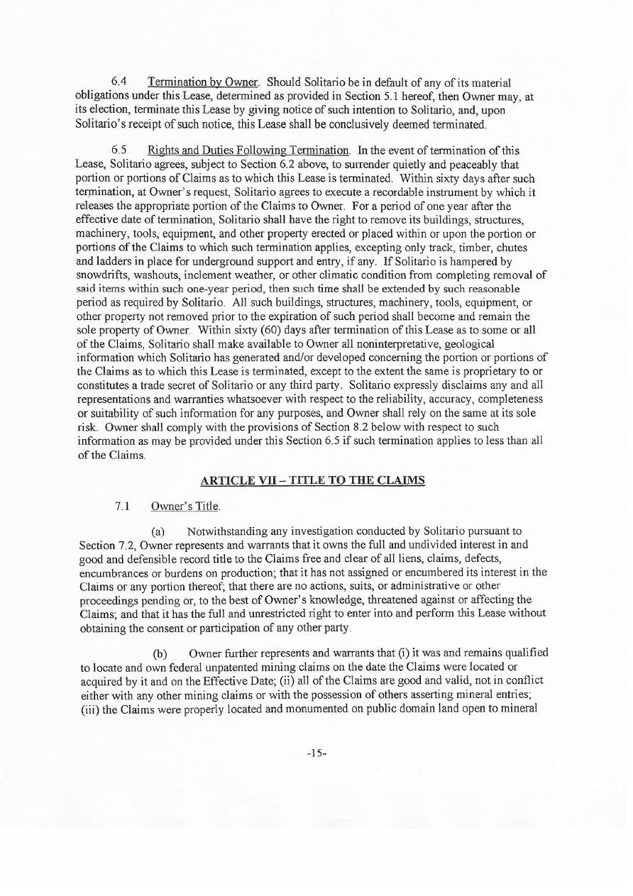 During 2021 Solitario entered into a lease agreement with Golden Crest II, LLC, a Wyoming limited liability company (the “GC Agreement”) whereby Solitario acquired exclusive exploration rights in certain claims (the “GC Claims”) in the Black Hills region of South Dakota. The GC Claims are part of Solitario’s Golden Crest project. Terms of the GC Agreement include required scheduled payments by Solitario to the underlying owner of $65,000 (paid upon signing) and an obligation to pay the underlying owner $60,000 at the first anniversary date which was paid in June 2022. Solitario recorded an initial acquisition cost of $125,000 during 2021 related to these required payments. In addition, to continue the lease, Solitario has agreed to pay, at its option, the underlying owner escalating annual payments that over five years total $340,000 and annual payments of $150,000 thereafter, which will be expensed as paid. Solitario has agreed to pay the underlying owner an additional success fee of $1.00 per ounce of gold in the event Solitario files a 43-101 qualified resource of up to 1.5 million ounces of gold or a maximum of $1,500,000. In order to maintain the lease in good standing, Solitario has agreed to escalating work commitments, on the GC Claims and a related area of interest around the GC Claims totaling $3,000,000 during the first five years of the lease, with the first and second-year minimum expenditures totaling $600,000 ending June 2022. Solitario has exceeded the minimum exploration expenditures required through 2023. The term of the GC Agreement is for twenty years and is automatically extended as long as Solitario is performing any exploration, development or mining activities on the GC Claims. The underlying owner retained a 2.0% Net Smelter Return royalty. Solitario will have the option, but not the obligation, to reduce the Net Smelter Return royalty to 1.0% by paying the owner $1,000,000.