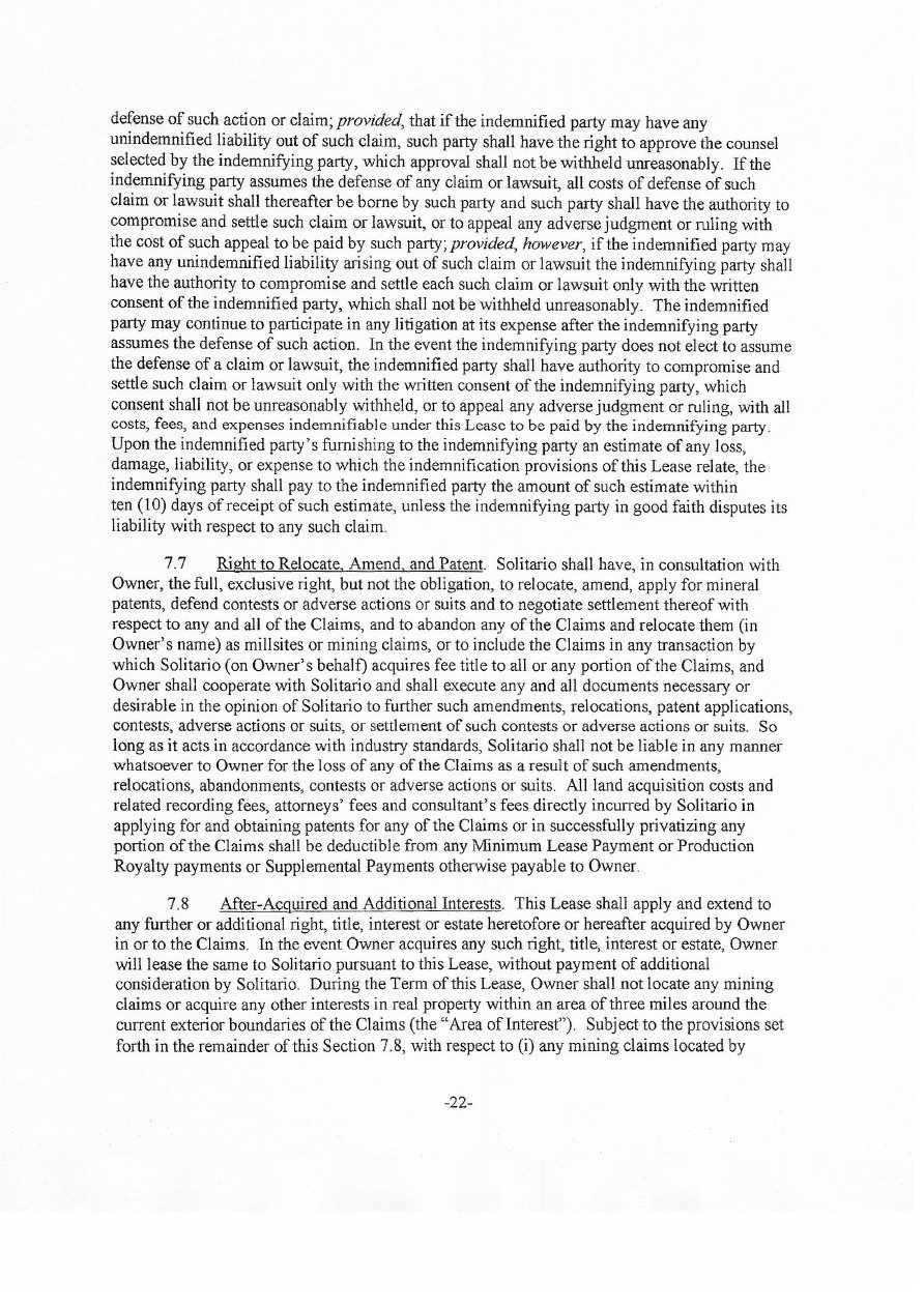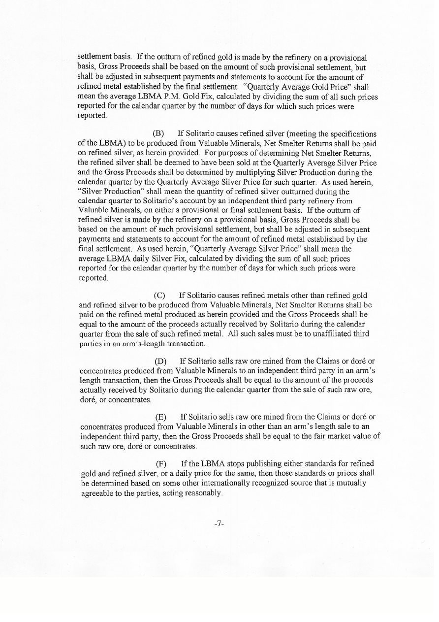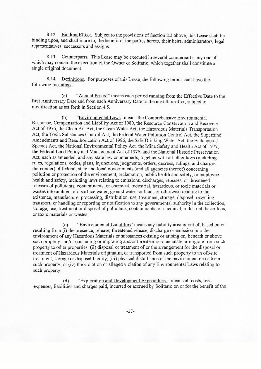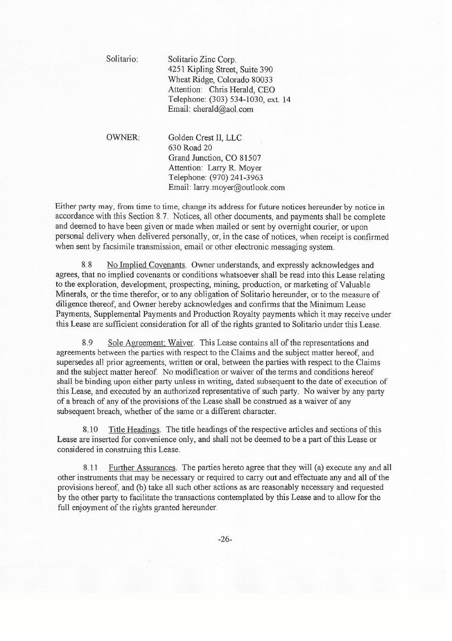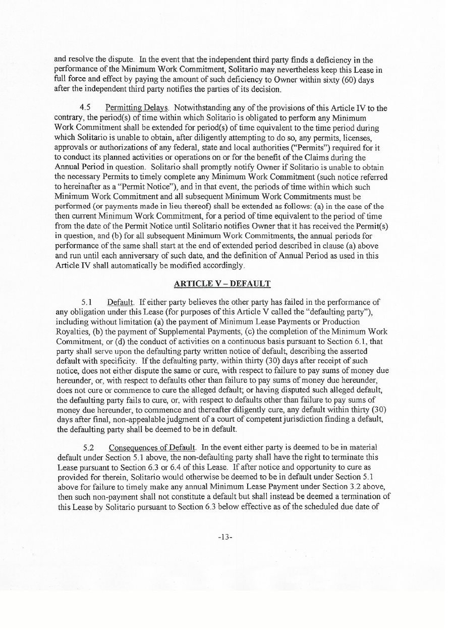 During 2021 Solitario entered into a lease agreement with Golden Crest II, LLC, a Wyoming limited liability company (the “GC Agreement”) whereby Solitario acquired exclusive exploration rights in certain claims (the “GC Claims”) in the Black Hills region of South Dakota. The GC Claims are part of Solitario’s Golden Crest project. Terms of the GC Agreement include required scheduled payments by Solitario to the underlying owner of $65,000 (paid upon signing) and an obligation to pay the underlying owner $60,000 at the first anniversary date which was paid in June 2022. Solitario recorded an initial acquisition cost of $125,000 during 2021 related to these required payments. In addition, to continue the lease, Solitario has agreed to pay, at its option, the underlying owner escalating annual payments that over five years total $340,000 and annual payments of $150,000 thereafter, which will be expensed as paid. Solitario has agreed to pay the underlying owner an additional success fee of $1.00 per ounce of gold in the event Solitario files a 43-101 qualified resource of up to 1.5 million ounces of gold or a maximum of $1,500,000. In order to maintain the lease in good standing, Solitario has agreed to escalating work commitments, on the GC Claims and a related area of interest around the GC Claims totaling $3,000,000 during the first five years of the lease, with the first and second-year minimum expenditures totaling $600,000 ending June 2022. Solitario has exceeded the minimum exploration expenditures required through 2023. The term of the GC Agreement is for twenty years and is automatically extended as long as Solitario is performing any exploration, development or mining activities on the GC Claims. The underlying owner retained a 2.0% Net Smelter Return royalty. Solitario will have the option, but not the obligation, to reduce the Net Smelter Return royalty to 1.0% by paying the owner $1,000,000.