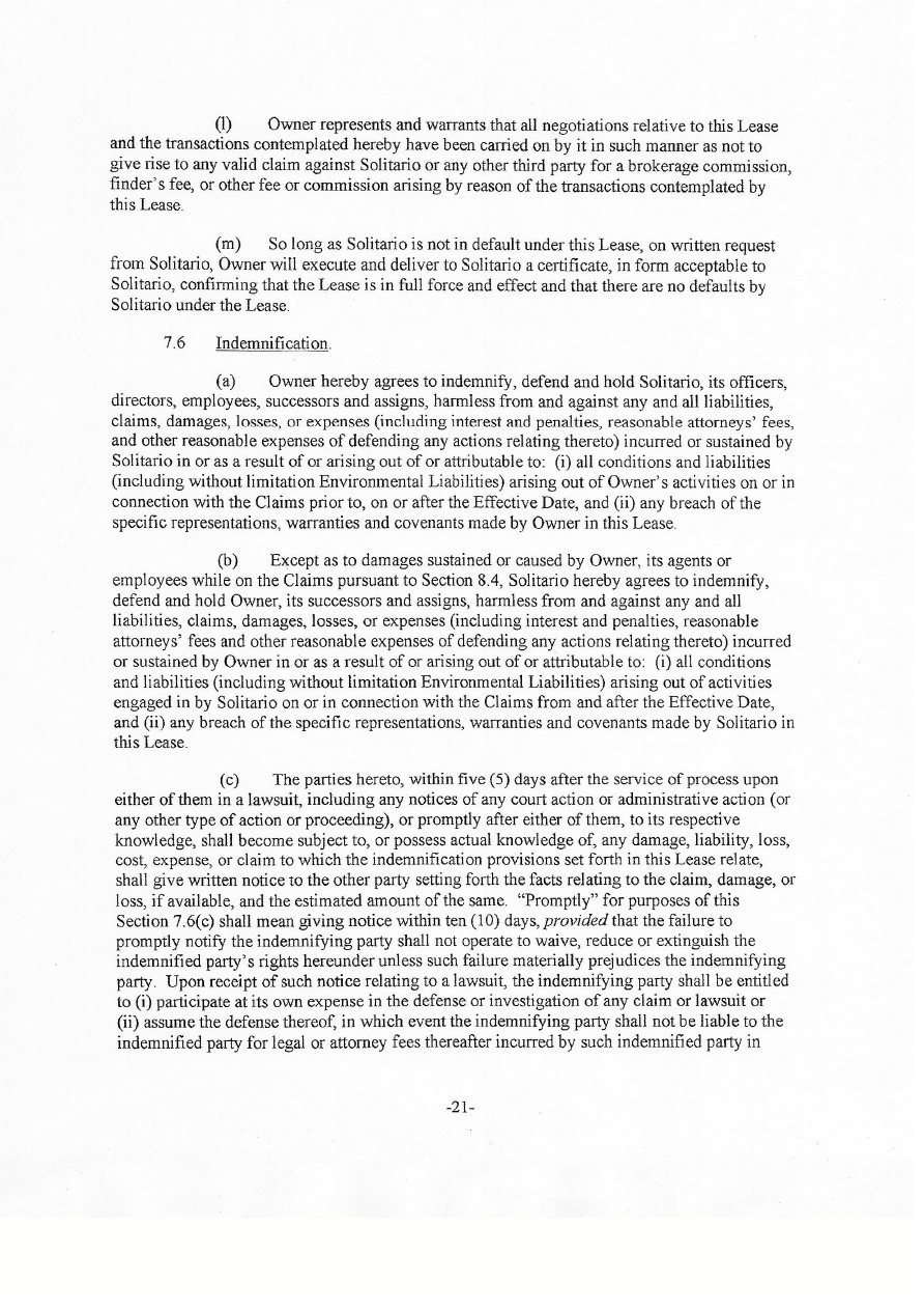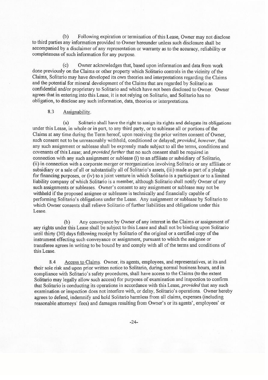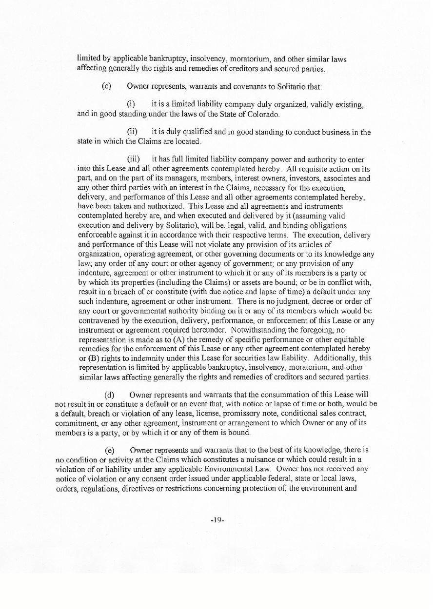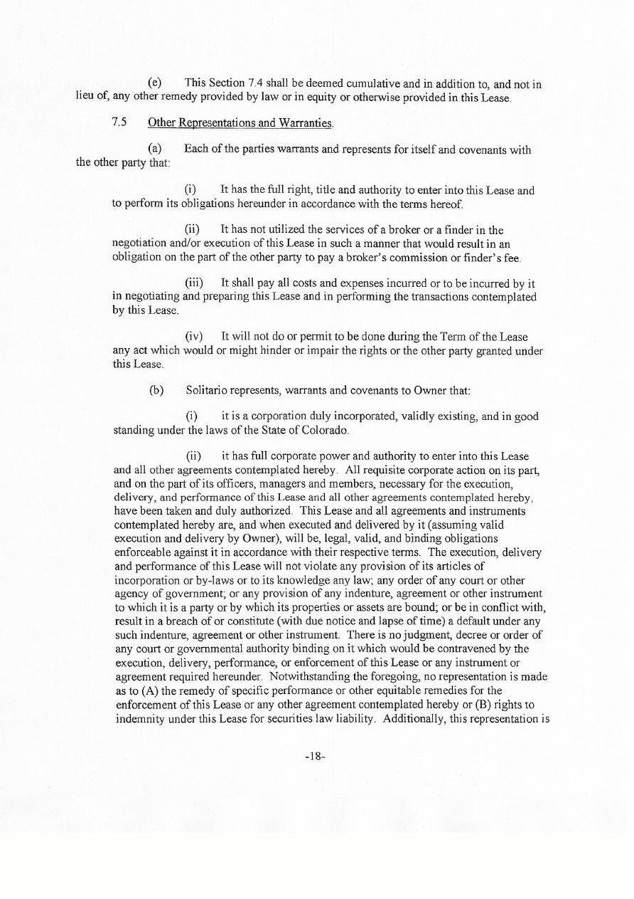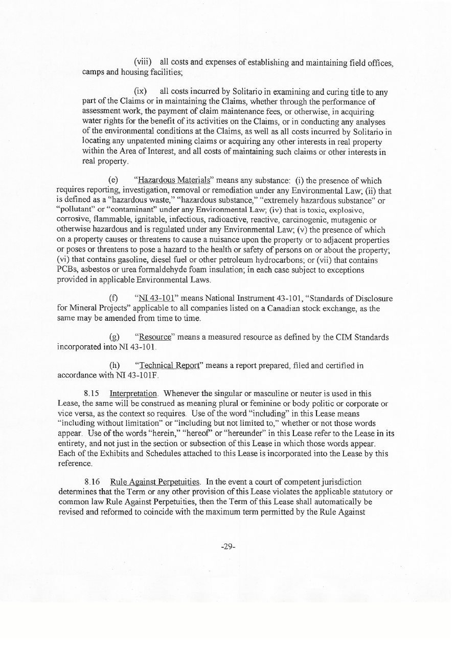 During 2021 Solitario entered into a lease agreement with Golden Crest II, LLC, a Wyoming limited liability company (the “GC Agreement”) whereby Solitario acquired exclusive exploration rights in certain claims (the “GC Claims”) in the Black Hills region of South Dakota. The GC Claims are part of Solitario’s Golden Crest project. Terms of the GC Agreement include required scheduled payments by Solitario to the underlying owner of $65,000 (paid upon signing) and an obligation to pay the underlying owner $60,000 at the first anniversary date which was paid in June 2022. Solitario recorded an initial acquisition cost of $125,000 during 2021 related to these required payments. In addition, to continue the lease, Solitario has agreed to pay, at its option, the underlying owner escalating annual payments that over five years total $340,000 and annual payments of $150,000 thereafter, which will be expensed as paid. Solitario has agreed to pay the underlying owner an additional success fee of $1.00 per ounce of gold in the event Solitario files a 43-101 qualified resource of up to 1.5 million ounces of gold or a maximum of $1,500,000. In order to maintain the lease in good standing, Solitario has agreed to escalating work commitments, on the GC Claims and a related area of interest around the GC Claims totaling $3,000,000 during the first five years of the lease, with the first and second-year minimum expenditures totaling $600,000 ending June 2022. Solitario has exceeded the minimum exploration expenditures required through 2023. The term of the GC Agreement is for twenty years and is automatically extended as long as Solitario is performing any exploration, development or mining activities on the GC Claims. The underlying owner retained a 2.0% Net Smelter Return royalty. Solitario will have the option, but not the obligation, to reduce the Net Smelter Return royalty to 1.0% by paying the owner $1,000,000.