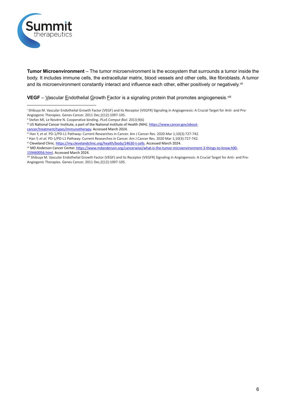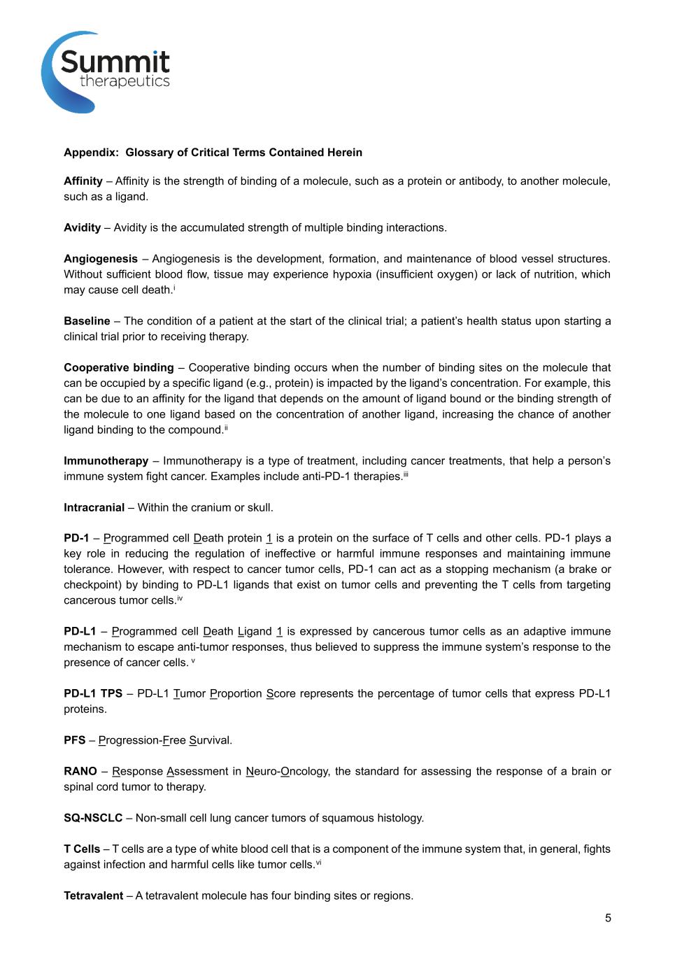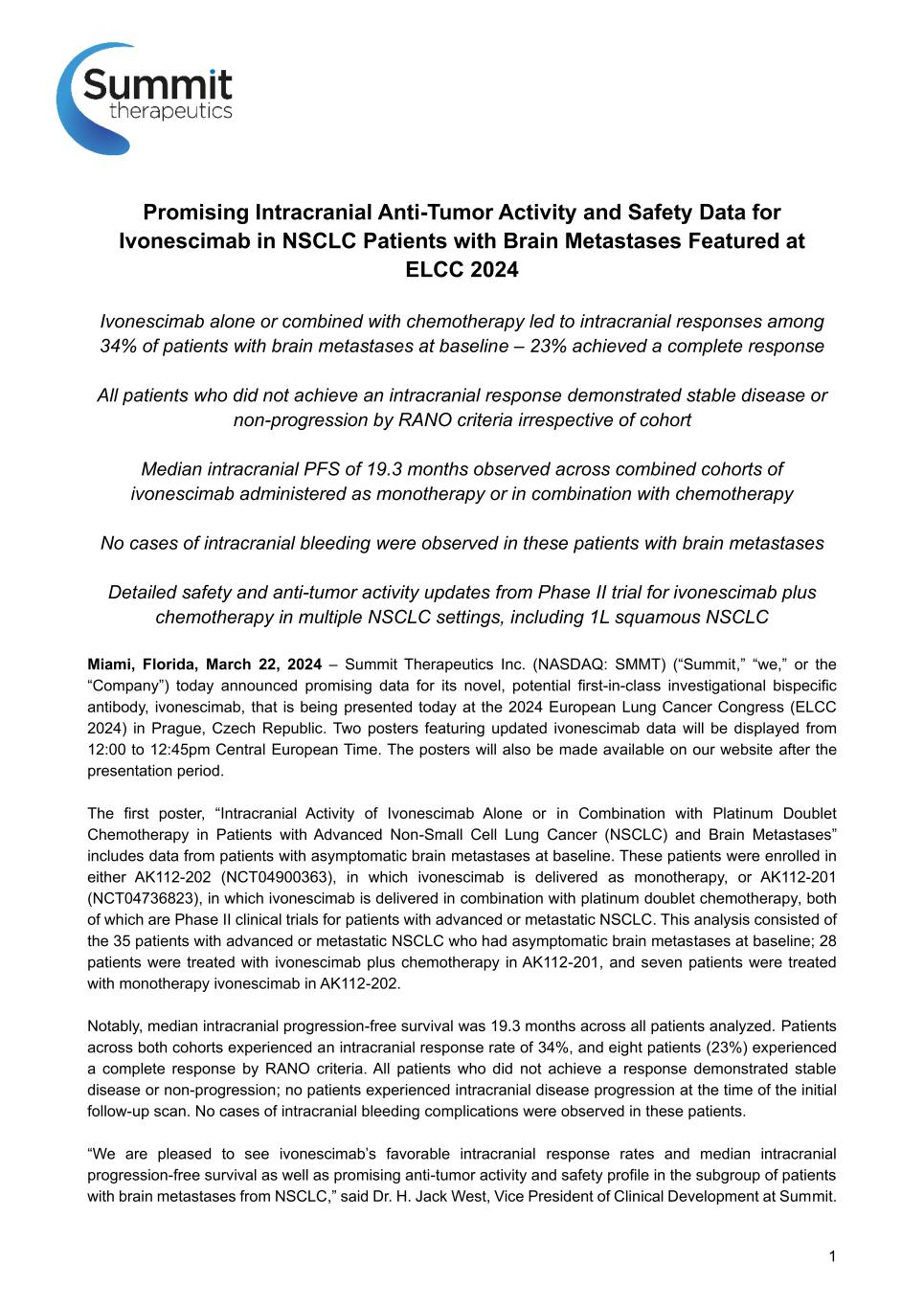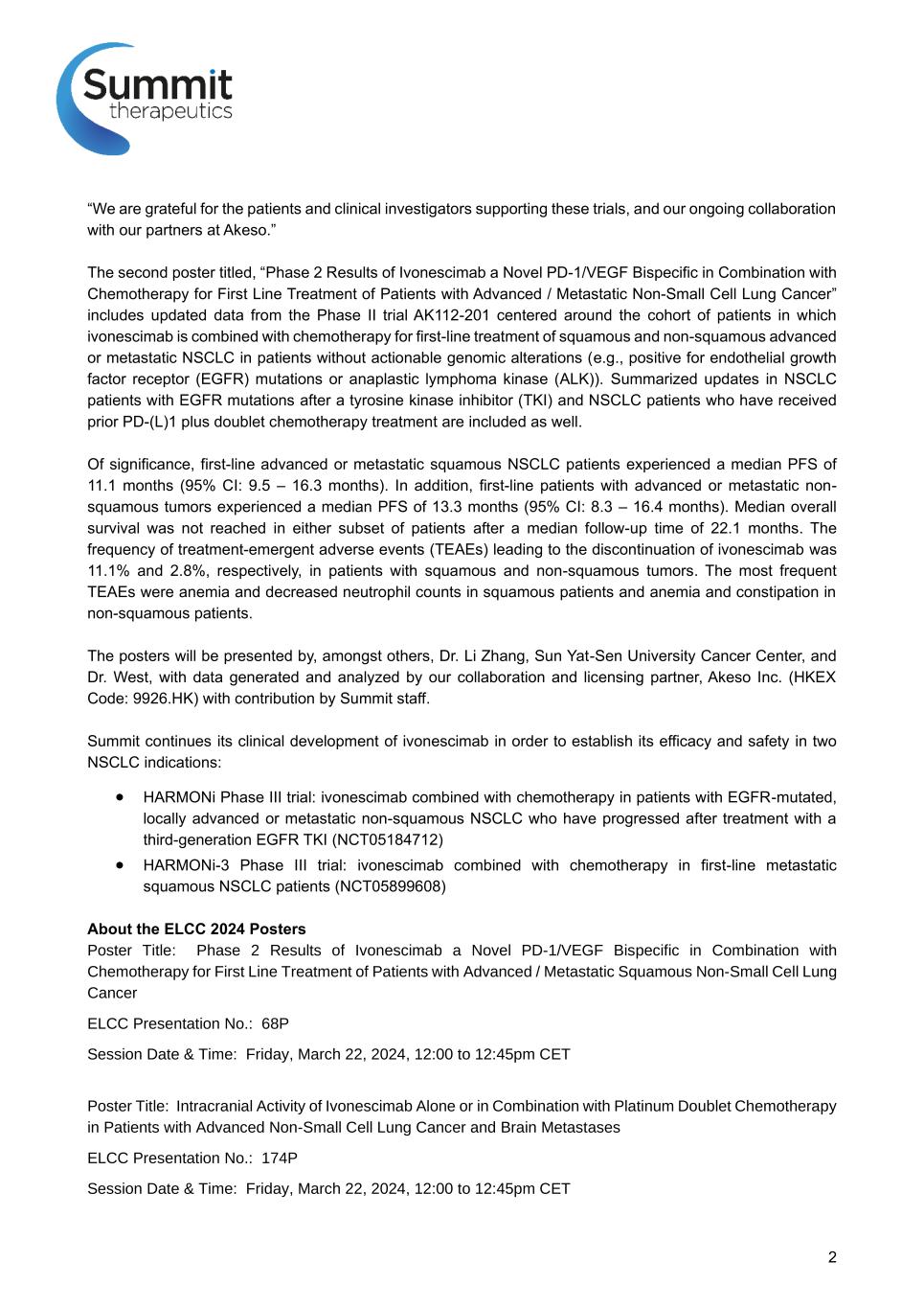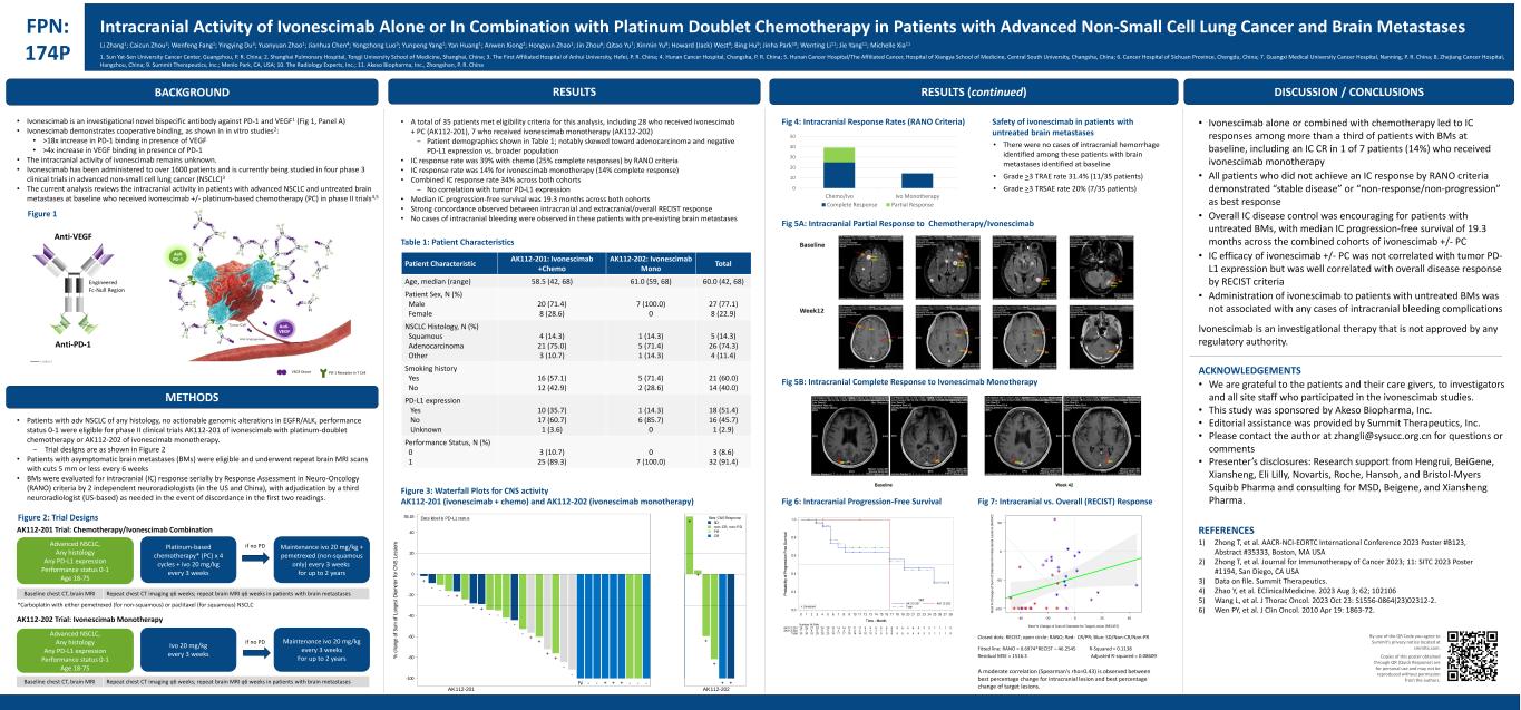 BACKGROUND FPN: 174P Intracranial Activity of Ivonescimab Alone or In Combination with Platinum Doublet Chemotherapy in Patients with Advanced Non-Small Cell Lung Cancer and Brain Metastases • Ivonescimab is an investigational novel bispecific antibody against PD-1 and VEGF1 (Fig 1, Panel A) • Ivonescimab demonstrates cooperative binding, as shown in in vitro studies2: • >18x increase in PD-1 binding in presence of VEGF • >4x increase in VEGF binding in presence of PD-1 • The intracranial activity of ivonescimab remains unknown. • Ivonescimab has been administered to over 1600 patients and is currently being studied in four phase 3 clinical trials in advanced non-small cell lung cancer (NSCLC)3 • The current analysis reviews the intracranial activity in patients with advanced NSCLC and untreated brain metastases at baseline who received ivonescimab +/- platinum-based chemotherapy (PC) in phase II trials4,5 METHODS • Patients with adv NSCLC of any histology, no actionable genomic alterations in EGFR/ALK, performance status 0-1 were eligible for phase II clinical trials AK112-201 of ivonescimab with platinum-doublet chemotherapy or AK112-202 of ivonescimab monotherapy. − Trial designs are as shown in Figure 2 • Patients with asymptomatic brain metastases (BMs) were eligible and underwent repeat brain MRI scans with cuts 5 mm or less every 6 weeks • BMs were evaluated for intracranial (IC) response serially by Response Assessment in Neuro-Oncology (RANO) criteria by 2 independent neuroradiologists (in the US and China), with adjudication by a third neuroradiologist (US-based) as needed in the event of discordance in the first two readings. • Ivonescimab alone or combined with chemotherapy led to IC responses among more than a third of patients with BMs at baseline, including an IC CR in 1 of 7 patients (14%) who received ivonescimab monotherapy • All patients who did not achieve an IC response by RANO criteria demonstrated “stable disease” or “non-response/non-progression” as best response • Overall IC disease control was encouraging for patients with untreated BMs, with median IC progression-free survival of 19.3 months across the combined cohorts of ivonescimab +/- PC • IC efficacy of ivonescimab +/- PC was not correlated with tumor PD- L1 expression but was well correlated with overall disease response by RECIST criteria • Administration of ivonescimab to patients with untreated BMs was not associated with any cases of intracranial bleeding complications Ivonescimab is an investigational therapy that is not approved by any regulatory authority. ACKNOWLEDGEMENTS • We are grateful to the patients and their care givers, to investigators and all site staff who participated in the ivonescimab studies. • This study was sponsored by Akeso Biopharma, Inc. • Editorial assistance was provided by Summit Therapeutics, Inc. • Please contact the author at zhangli@sysucc.org.cn for questions or comments • Presenter’s disclosures: Research support from Hengrui, BeiGene, Xiansheng, Eli Lilly, Novartis, Roche, Hansoh, and Bristol-Myers Squibb Pharma and consulting for MSD, Beigene, and Xiansheng Pharma. REFERENCES 1) Zhong T, et al. AACR-NCI-EORTC International Conference 2023 Poster #B123, Abstract #35333, Boston, MA USA 2) Zhong T, et al. Journal for Immunotherapy of Cancer 2023; 11: SITC 2023 Poster #1194, San Diego, CA USA 3) Data on file. Summit Therapeutics. 4) Zhao Y, et al. EClinicalMedicine. 2023 Aug 3; 62; 102106 5) Wang L, et al. J Thorac Oncol. 2023 Oct 23: S1556-0864(23)02312-2. 6) Wen PY, et al. J Clin Oncol. 2010 Apr 19: 1863-72. By use of the QR Code you agree to Summit’s privacy notice located at smmttx.com. Copies of this poster obtained through QR (Quick Response) are for personal use and may not be reproduced without permission from the authors. Figure 2: Trial Designs Platinum-based chemotherapy* (PC) x 4 cycles + ivo 20 mg/kg every 3 weeks Maintenance ivo 20 mg/kg + pemetrexed (non-squamous only) every 3 weeks for up to 2 years Advanced NSCLC, Any histology Any PD-L1 expression Performance status 0-1 Age 18-75 if no PD AK112-201 Trial: Chemotherapy/Ivonescimab Combination Repeat chest CT imaging q6 weeks; repeat brain MRI q6 weeks in patients with brain metastasesBaseline chest CT, brain MRI *Carboplatin with either pemetrexed (for non-squamous) or paclitaxel (for squamous) NSCLC Ivo 20 mg/kg every 3 weeks Maintenance ivo 20 mg/kg every 3 weeks For up to 2 years Advanced NSCLC, Any histology Any PD-L1 expression Performance status 0-1 Age 18-75 if no PD AK112-202 Trial: Ivonescimab Monotherapy DISCUSSION / CONCLUSIONS Table 1: Patient Characteristics • A total of 35 patients met eligibility criteria for this analysis, including 28 who received ivonescimab + PC (AK112-201), 7 who received ivonescimab monotherapy (AK112-202) − Patient demographics shown in Table 1; notably skewed toward adenocarcinoma and negative PD-L1 expression vs. broader population • IC response rate was 39% with chemo (25% complete responses) by RANO criteria • IC response rate was 14% for ivonescimab monotherapy (14% complete response) • Combined IC response rate 34% across both cohorts − No correlation with tumor PD-L1 expression • Median IC progression-free survival was 19.3 months across both cohorts • Strong concordance observed between intracranial and extracranial/overall RECIST response • No cases of intracranial bleeding were observed in these patients with pre-existing brain metastases Patient Characteristic AK112-201: Ivonescimab +Chemo AK112-202: Ivonescimab Mono Total Age, median (range) 58.5 (42, 68) 61.0 (59, 68) 60.0 (42, 68) Patient Sex, N (%) Male Female 20 (71.4) 8 (28.6) 7 (100.0) 0 27 (77.1) 8 (22.9) NSCLC Histology, N (%) Squamous Adenocarcinoma Other 4 (14.3) 21 (75.0) 3 (10.7) 1 (14.3) 5 (71.4) 1 (14.3) 5 (14.3) 26 (74.3) 4 (11.4) Smoking history Yes No 16 (57.1) 12 (42.9) 5 (71.4) 2 (28.6) 21 (60.0) 14 (40.0) PD-L1 ex