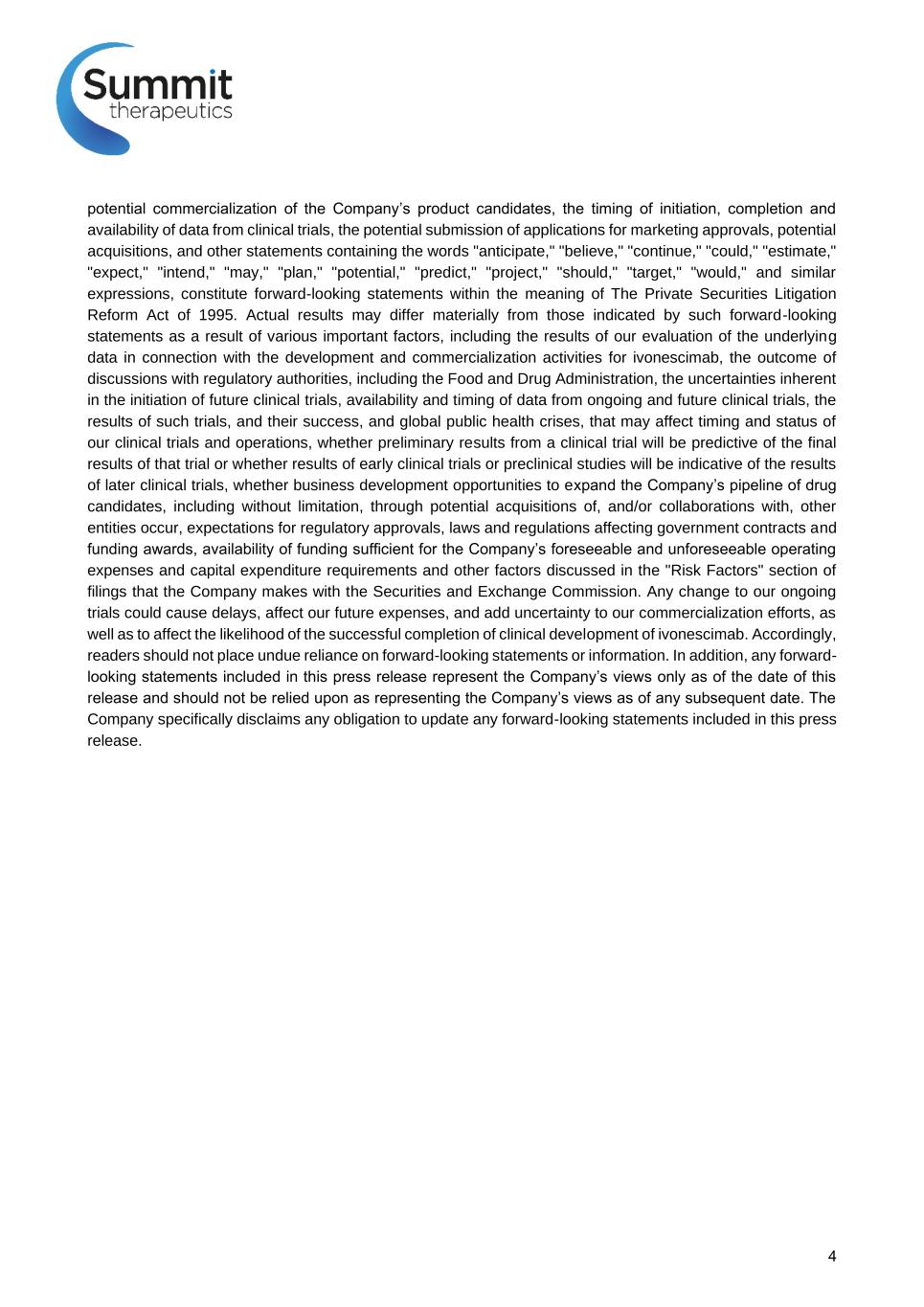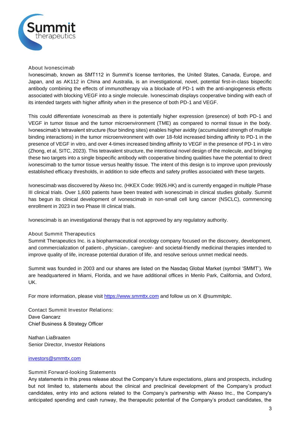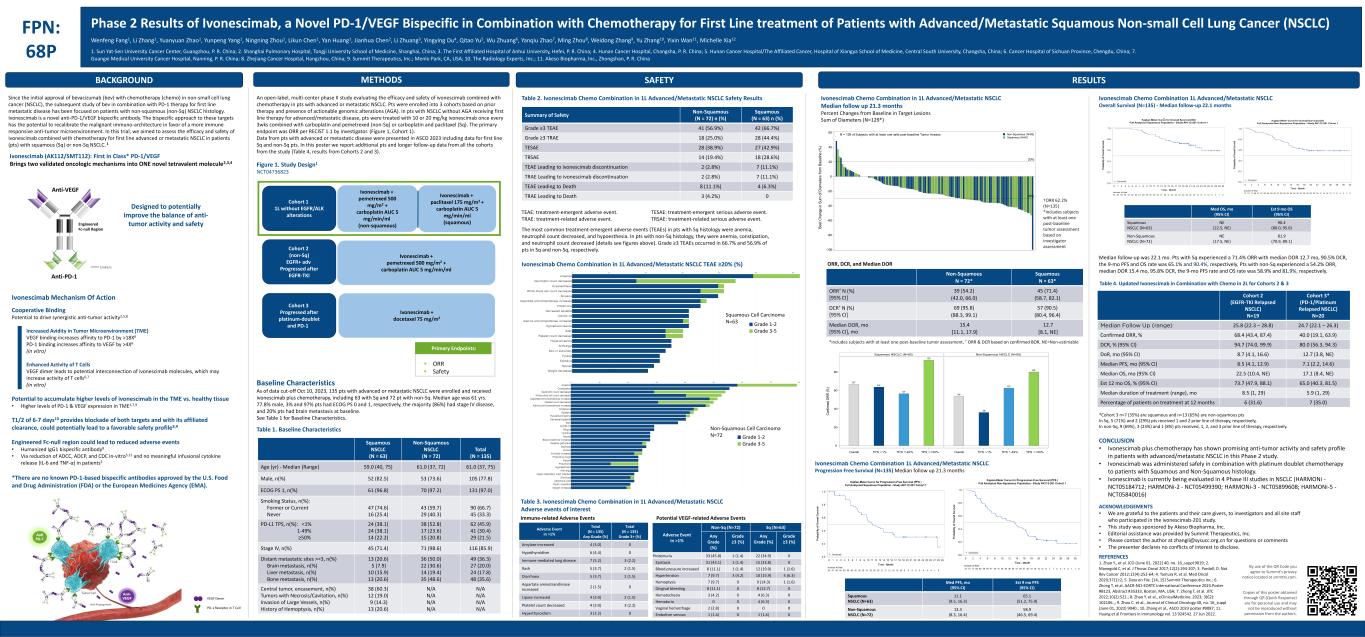 BACKGROUND FPN: 68P Phase 2 Results of Ivonescimab, a Novel PD-1/VEGF Bispecific in Combination with Chemotherapy for First Line treatment of Patients with Advanced/Metastatic Squamous Non-small Cell Lung Cancer (NSCLC) By use of the QR Code you agree to Summit’s privacy notice located at smmttx.com. Copies of this poster obtained through QR (Quick Response) are for personal use and may not be reproduced without permission from the authors. RESULTSMETHODS SAFETY Wenfeng Fang1, Li Zhang1, Yuanyuan Zhao1, Yunpeng Yang1, Ningning Zhou1, Likun Chen1, Yan Huang1, Jianhua Chen2, Li Zhuang3, Yingying Du4, Qitao Yu5, Wu Zhuang6, Yanqiu Zhao7, Ming Zhou8, Weidong Zhang9, Yu Zhang10, Yixin Wan11, Michelle Xia12 1. Sun Yat-Sen University Cancer Center, Guangzhou, P. R. China; 2. Shanghai Pulmonary Hospital, Tongji University School of Medicine, Shanghai, China; 3. The First Affiliated Hospital of Anhui University, Hefei, P. R. China; 4. Hunan Cancer Hospital, Changsha, P. R. China; 5. Hunan Cancer Hospital/The Affiliated Cancer, Hospital of Xiangya School of Medicine, Central South University, Changsha, China; 6. Cancer Hospital of Sichuan Province, Chengdu, China; 7. Guangxi Medical University Cancer Hospital, Nanning, P. R. China; 8. Zhejiang Cancer Hospital, Hangzhou, China; 9. Summit Therapeutics, Inc.; Menlo Park, CA, USA; 10. The Radiology Experts, Inc.; 11. Akeso Biopharma, Inc., Zhongshan, P. R. China Table 1. Baseline Characteristics Table 2. Ivonescimab Chemo Combination in 1L Advanced/Metastatic NSCLC Safety Results Squamous NSCLC (N = 63) Non-Squamous NSCLC (N = 72) Total (N = 135) Age (yr) - Median (Range) 59.0 (40, 75) 61.0 (37, 72) 61.0 (37, 75) Male, n(%) 52 (82.5) 53 (73.6) 105 (77.8) ECOG PS 1, n(%) 61 (96.8) 70 (97.2) 131 (97.0) Smoking Status, n(%): Former or Current Never 47 (74.6) 16 (25.4) 43 (59.7) 29 (40.3) 90 (66.7) 45 (33.3) PD-L1 TPS, n(%): <1% 1-49% ≥50% 24 (38.1) 24 (38.1) 14 (22.2) 38 (52.8) 17 (23.6) 15 (20.8) 62 (45.9) 41 (30.4) 29 (21.5) Stage IV, n(%) 45 (71.4) 71 (98.6) 116 (85.9) Distant metastatic sites >=3, n(%) Brain metastasis, n(%) Liver metastasis, n(%) Bone metastasis, n(%) 13 (20.6) 5 (7.9) 10 (15.9) 13 (20.6) 36 (50.0) 22 (30.6) 14 (19.4) 35 (48.6) 49 (36.3) 27 (20.0) 24 (17.8) 48 (35.6) Central tumor, encasement, n(%) Tumors with Necrosis/Cavitation, n(%) Invasion of Large Vessels, n(%) History of Hemoptysis, n(%) 38 (60.3) 12 (19.0) 9 (14.3) 13 (20.6) N/A N/A N/A N/A N/A N/A N/A N/A Summary of Safety Non-Squamous (N = 72) n (%) Squamous (N = 63) n (%) Grade ≥3 TEAE 41 (56.9%) 42 (66.7%) Grade ≥3 TRAE 18 (25.0%) 28 (44.4%) TESAE 28 (38.9%) 27 (42.9%) TRSAE 14 (19.4%) 18 (28.6%) TEAE Leading to ivonescimab discontinuation 2 (2.8%) 7 (11.1%) TRAE Leading to ivonescimab discontinuation 2 (2.8%) 7 (11.1%) TEAE Leading to Death 8 (11.1%) 4 (6.3%) TRAE Leading to Death 3 (4.2%) 0 TEAE: treatment-emergent adverse event. TRAE: treatment-related adverse event. TESAE: treatment-emergent serious adverse event. TRSAE: treatment-related serious adverse event. Adverse Event in >1% Total (N = 135) Any Grade (%) Total (N = 135) Grade 3+ (%) Amylase increased 4 (3.0) 0 Hypothyroidism 6 (4.4) 0 Immune-mediated lung disease 7 (5.2) 3 (2.2) Rash 5 (3.7) 2 (1.5) Diarrhoea 5 (3.7) 2 (1.5) Aspartate aminotransferase increased 2 (1.5) 0 Lipase increased 4 (3.0) 2 (1.5) Platelet count decreased 4 (3.0) 3 (2.2) Hyperthyroidism 3 (2.2) 0 Adverse Event in >1% Non-Sq (N=72) Sq (N=63) Any Grade (%) Grade ≥3 (%) Any Grade (%) Grade ≥3 (%) Proteinuria 33 (45.8) 1 (1.4) 22 (34.9) 0 Epistaxis 31 (43.1) 1 (1.4) 15 (23.8) 0 Blood pressure increased 8 (11.1) 1 (1.4) 12 (19.0) 1 (1.6) Hypertension 7 (9.7) 3 (4.2) 10 (15.9) 4 (6.3) Hemoptysis 7 (9.7) 0 9 (14.3) 1 (1.6) Gingival bleeding 8 (11.1) 0 8 (12.7) 0 Hematochezia 3 (4.2) 0 4 (6.3) 0 Hematuria 0 0 4 (6.3) 0 Vaginal hemorrhage 2 (2.8) 0 0 0 Embolism venous 1 (1.4) 0 1 (1.6) 0 Immune-related Adverse Events Potential VEGF-related Adverse Events -30% 20% -100 -80 -60 -40 -20 0 20 40 60 B e s t C h a n g e in S u m o f D ia m e te rs f ro m B a s e lin e ( % ) Squamous (N=60) Non-Squamous (N=69)N = 129 of Subjects with at least one valid post-baseline Tumor Assessment Non-Squamous N = 72* Squamous N = 63* ORR† N (%) [95% CI] 39 (54.2) (42.0, 66.0) 45 (71.4) (58.7, 82.1) DCR† N (%) [95% CI] 69 (95.8) (88.3, 99.1) 57 (90.5) (80.4, 96.4) Median DOR, mo [95% CI], mo 15.4 [11.1, 17.9] 12.7 [8.1, NE] Since the initial approval of bevacizumab (bev) with chemotherapy (chemo) in non-small cell lung cancer (NSCLC), the subsequent study of bev in combination with PD-1 therapy for first line metastatic disease has been focused on patients with non-squamous (non-Sq) NSCLC histology. Ivonescimab is a novel anti-PD-1/VEGF bispecific antibody. The bispecific approach to these targets has the potential to recalibrate the malignant immuno-architecture in favor of a more immune responsive anti-tumor microenvironment. In this trial, we aimed to assess the efficacy and safety of ivonescimab combined with chemotherapy for first line advanced or metastatic NSCLC in patients (pts) with squamous (Sq) or non-Sq NSCLC. 1 Ivonescimab (AK112/SMT112): First in Class* PD-1/VEGF Brings two validated oncologic mechanisms into ONE novel tetravalent molecule2,3,4 Designed to potentially improve the balance of anti- tumor activity and safety Ivonescimab Mechanism Of Action Cooperative Binding Potential to drive synergistic anti-tumor activity2,5,8 Increased Avidity in Tumor Microenvironment (TME) VEGF binding increases affinity to PD-1 by >18X6 PD-1 binding increases affinity to VEGF by >4X6 (in vitro) Enhanced Activity of T Cells VEGF dimer leads to potential interconnection of ivonescimab molecules, which may increase activity of T cells6,7 (in vitro) Potential to accumulate higher levels of ivonescimab in the TME vs. healthy tissue • Higher levels of PD-1 & VEGF expression in TME1,7,9 T1/2 of 6-7 days10 provides blockade of both targets and with its aff