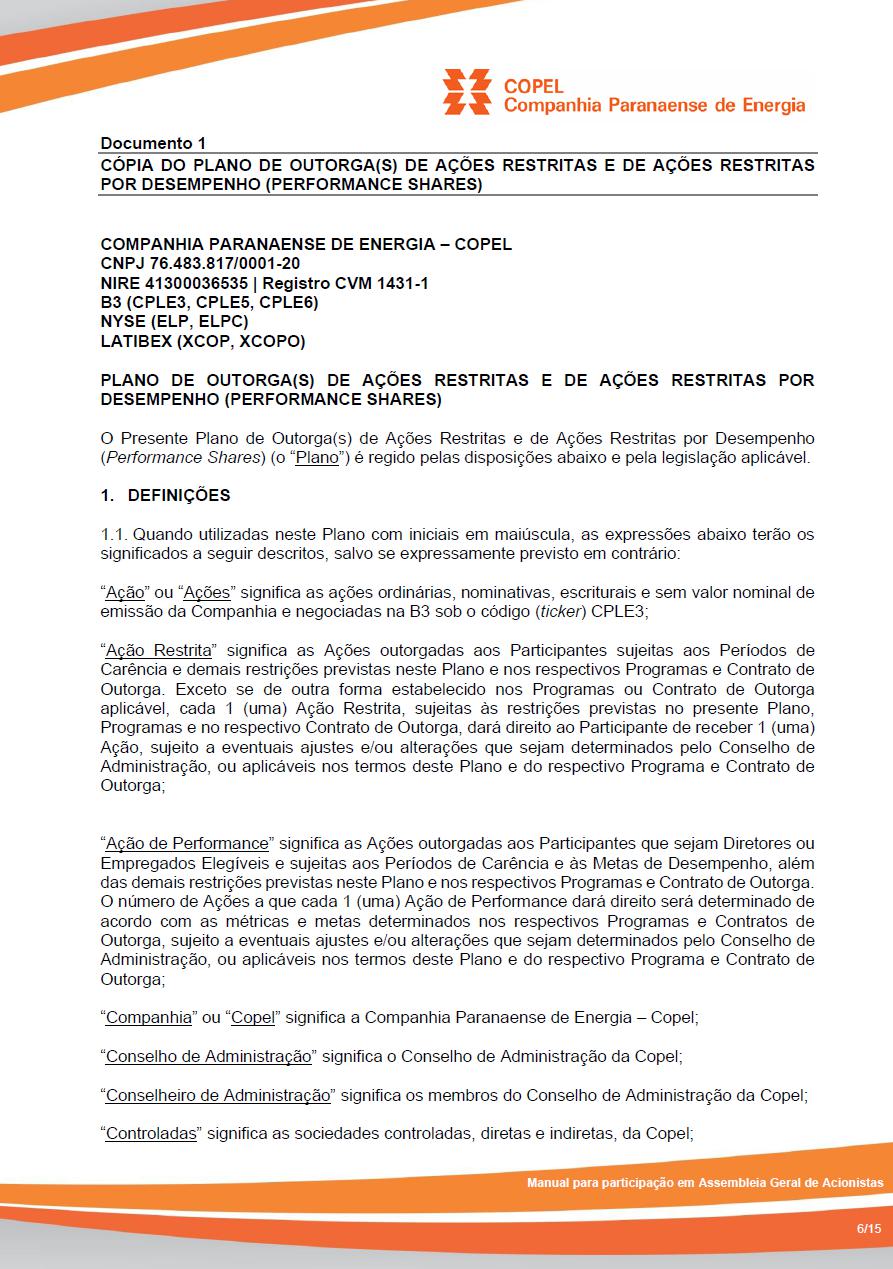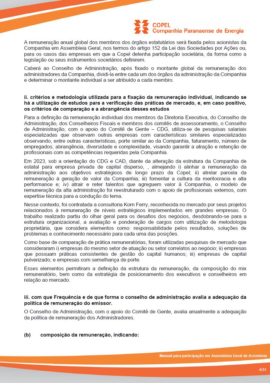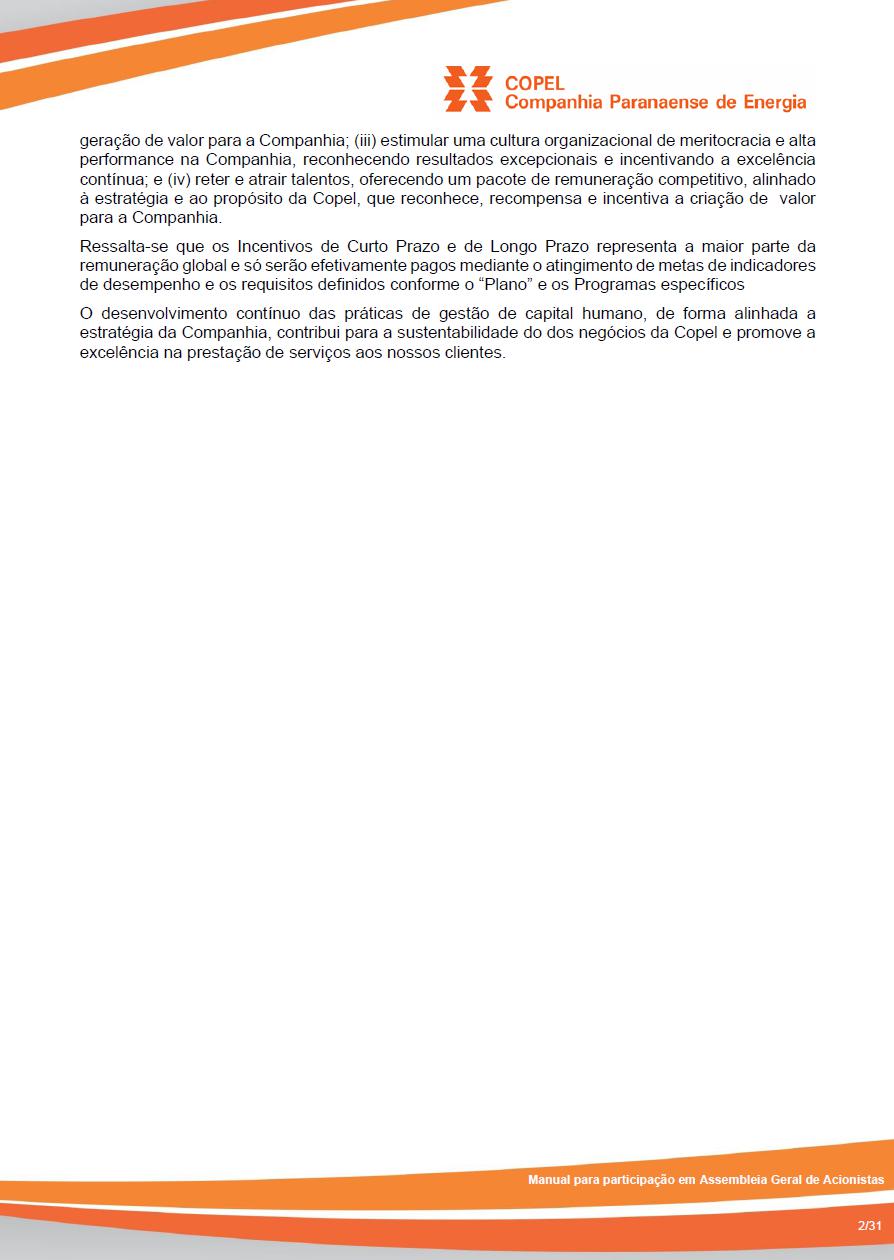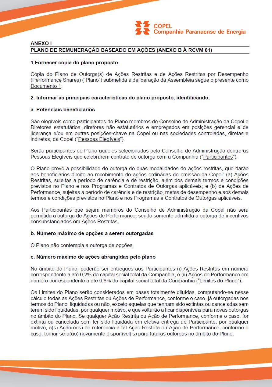 It is with immense pleasure that I present to you this document containing the Management's Proposal and Manual for participation In General Shareholders’ Meetings of the Companhia Paranaense de Energia - Copel, with general guidance for an effective participation and exercise of the vote.