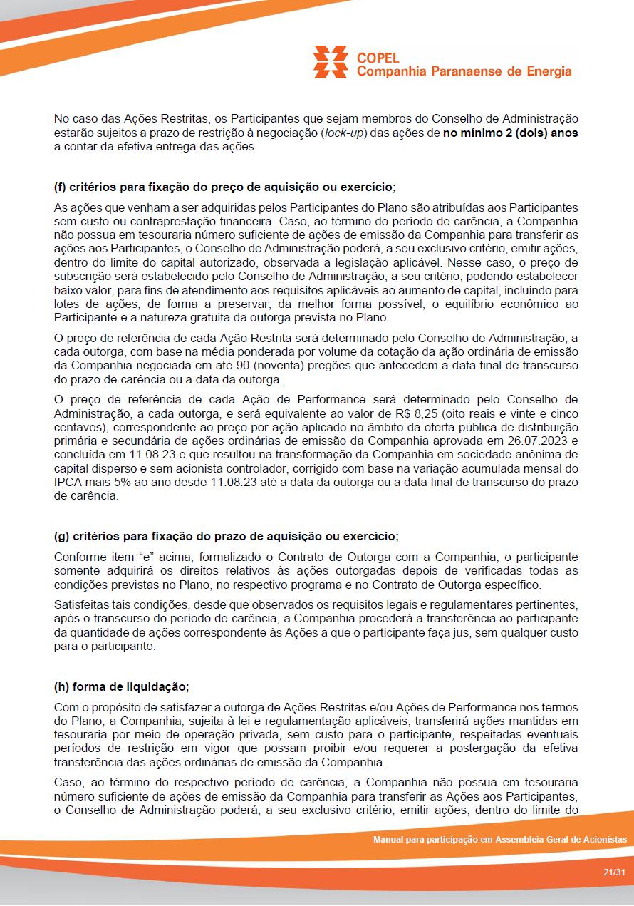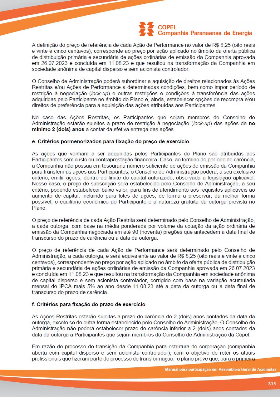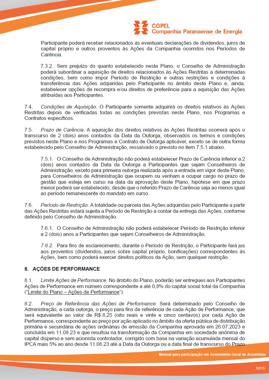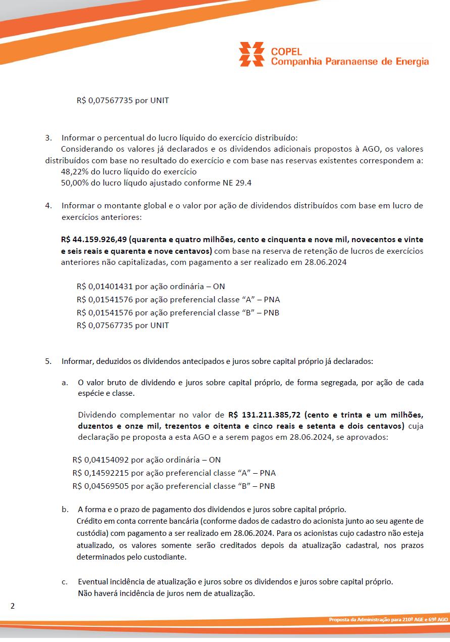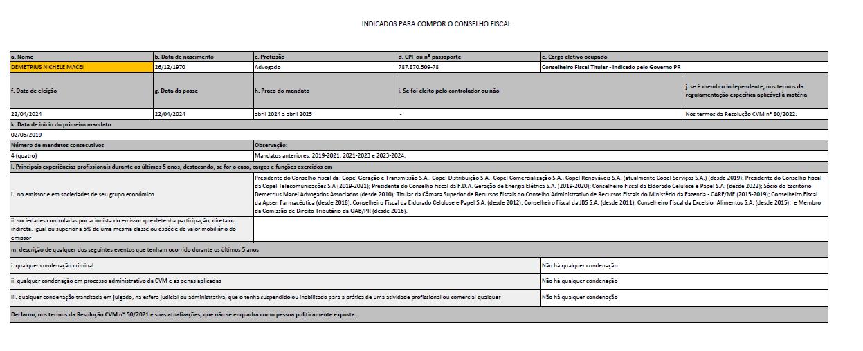 Any request for inclusion of candidates in the Distance Voting Bulletin of the AGM must be submitted to the Company by March 28, 2024 by means of a written request sent to the Investor Relations Officer, to the electronic address acionistas@copel.com, as provided for in CVM Resolution no. 81/2022, observing the requirements provided for in the same instruction.