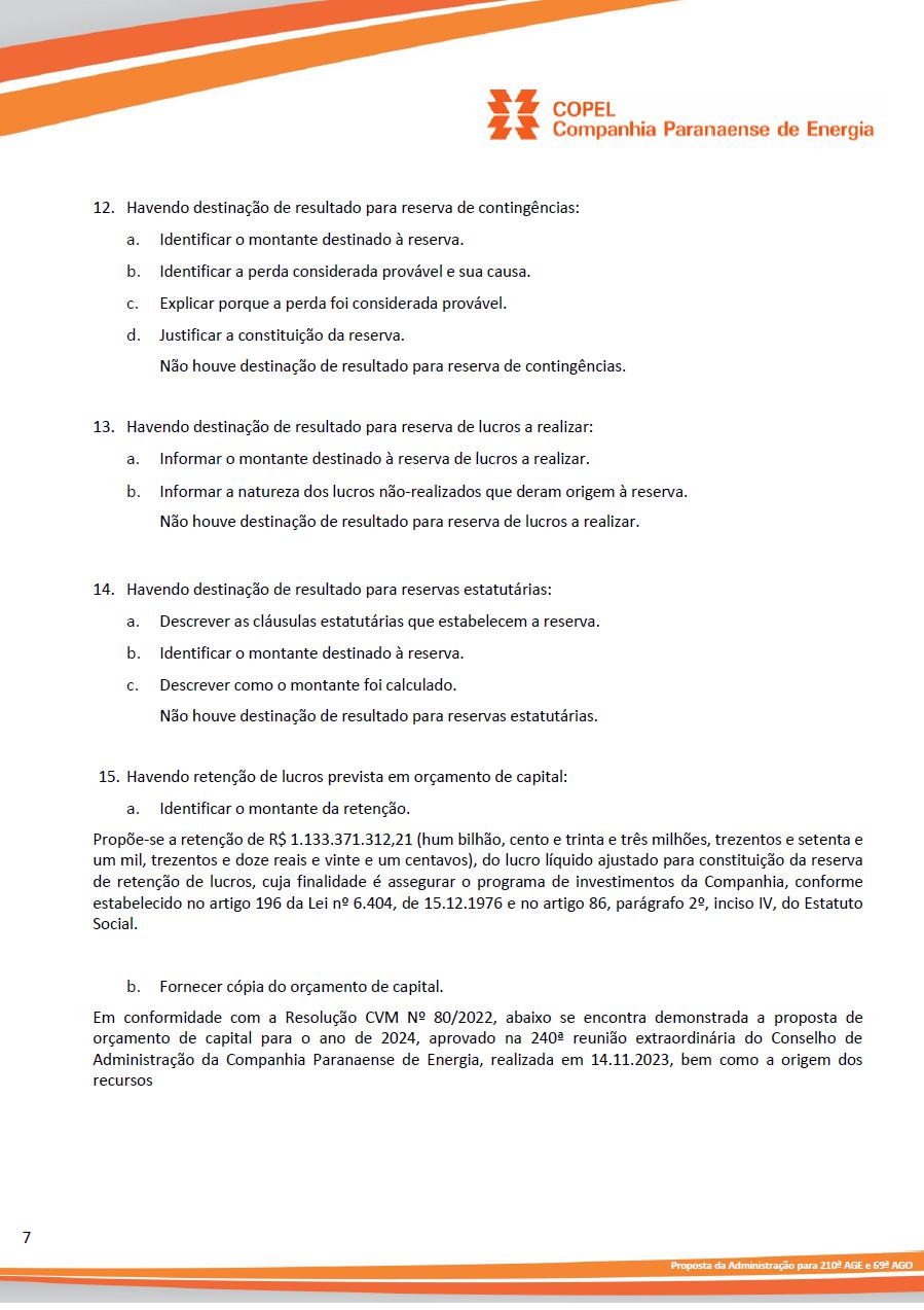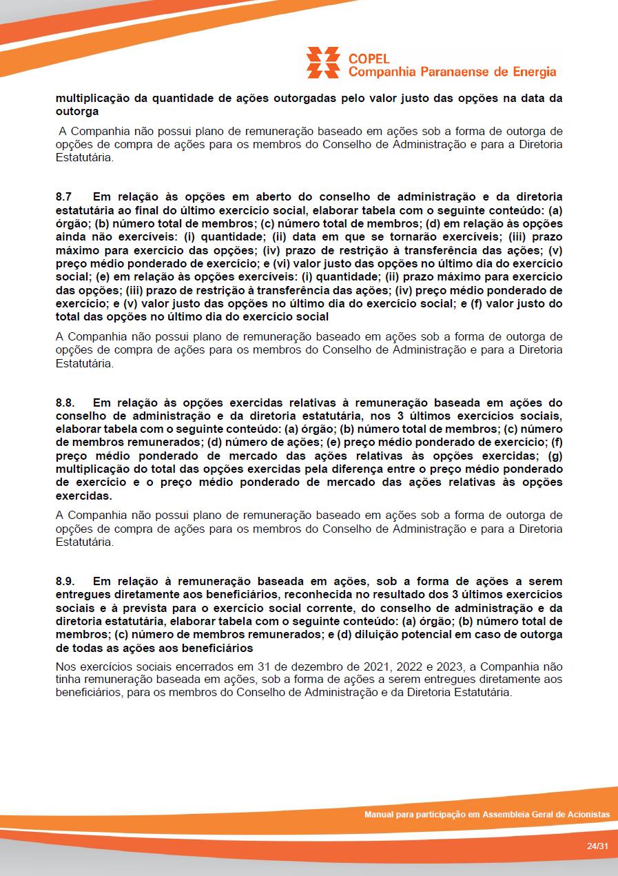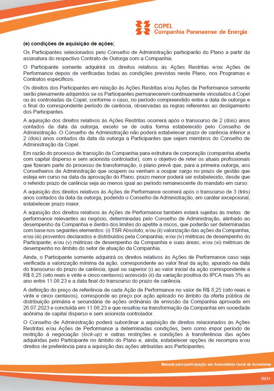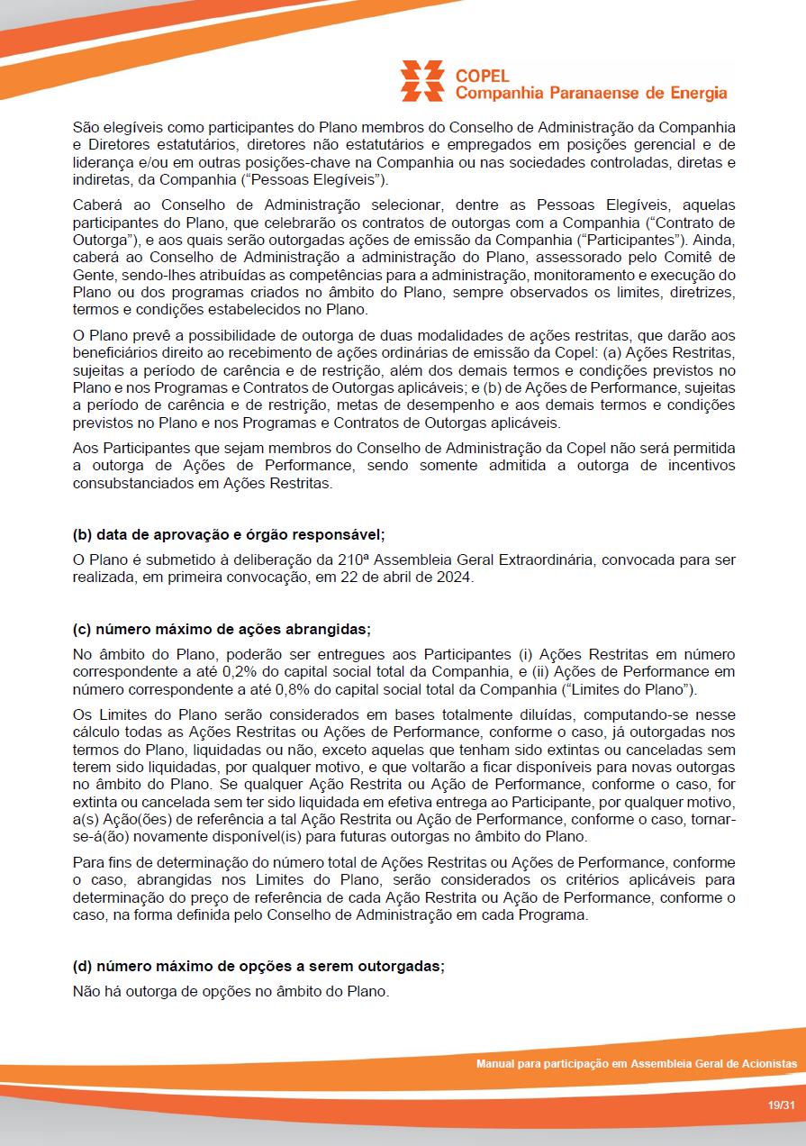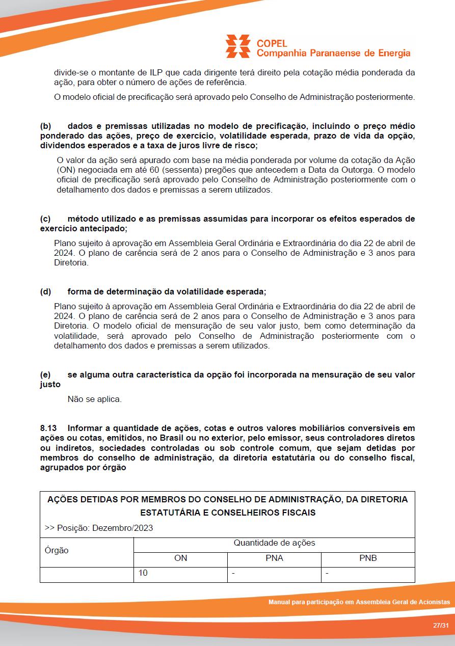Any request for inclusion of candidates in the Distance Voting Bulletin of the AGM must be submitted to the Company by March 28, 2024 by means of a written request sent to the Investor Relations Officer, to the electronic address acionistas@copel.com, as provided for in CVM Resolution no. 81/2022, observing the requirements provided for in the same instruction.