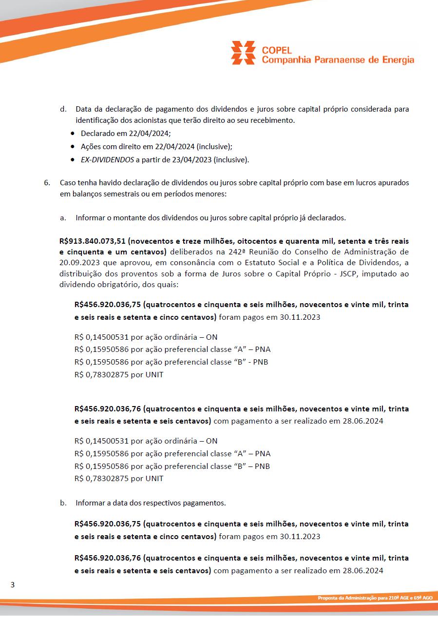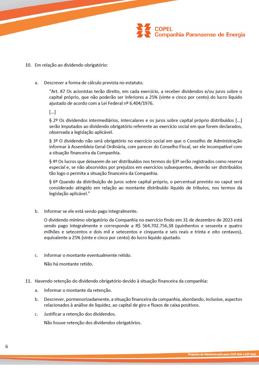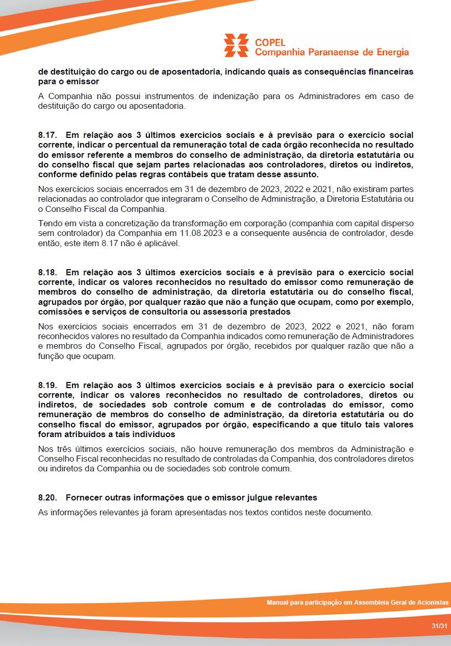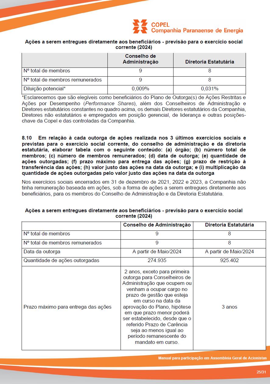 Any request for inclusion of candidates in the Distance Voting Bulletin of the AGM must be submitted to the Company by March 28, 2024 by means of a written request sent to the Investor Relations Officer, to the electronic address acionistas@copel.com, as provided for in CVM Resolution no. 81/2022, observing the requirements provided for in the same instruction.