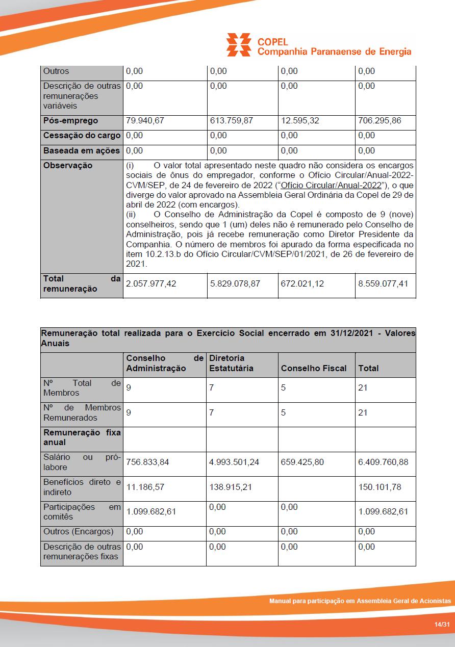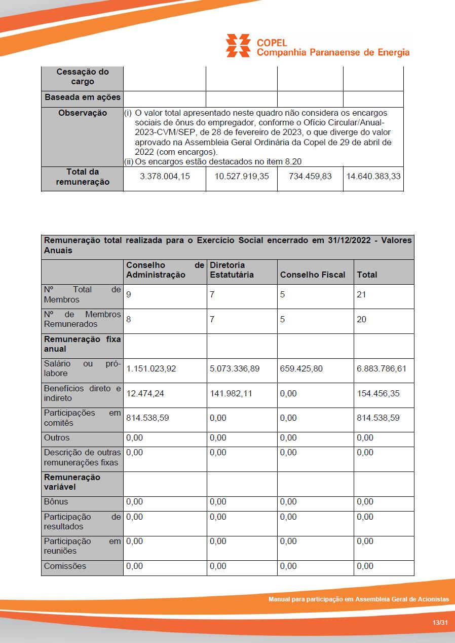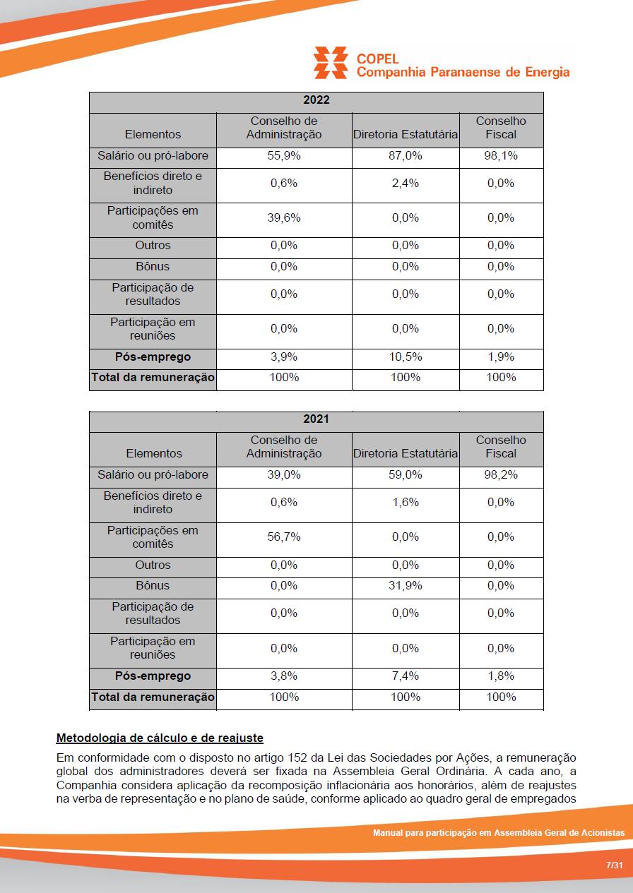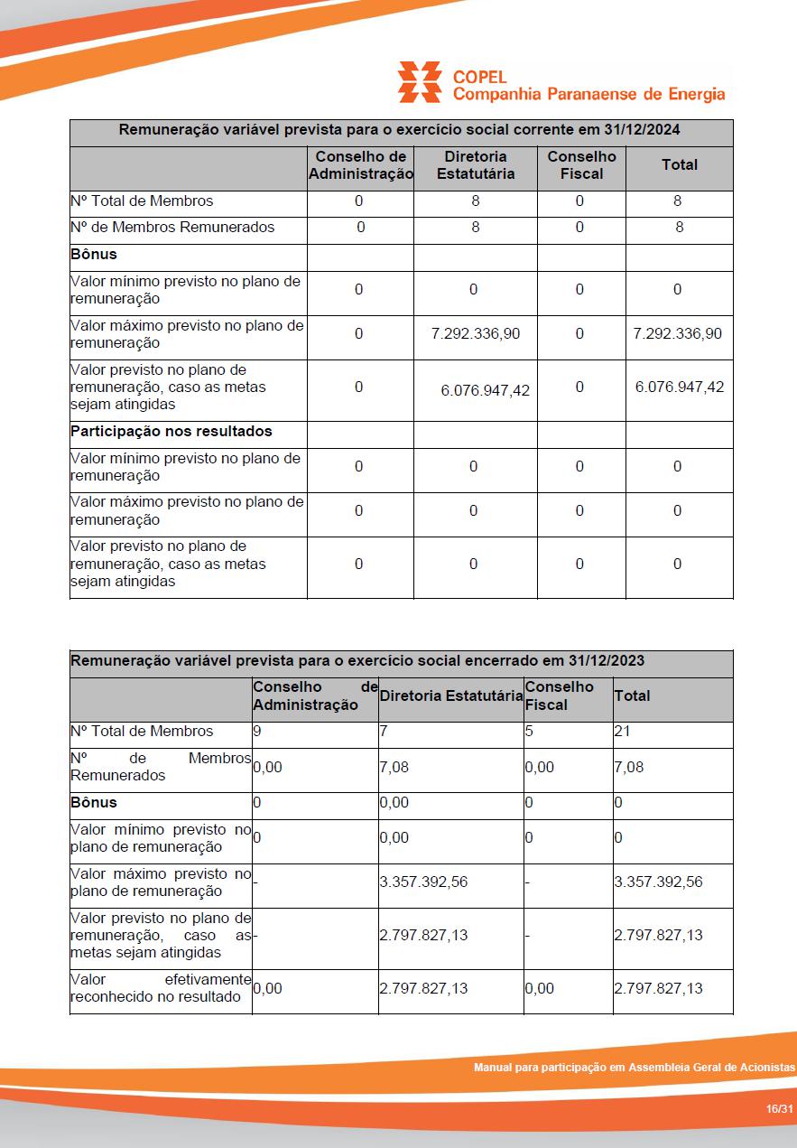 The General Meeting, in accordance with article 152 of Federal Law 6,404/1976, defines the annual remuneration of Copel's Directors, Officers, Audit Board Members and members of Statutory Committees.