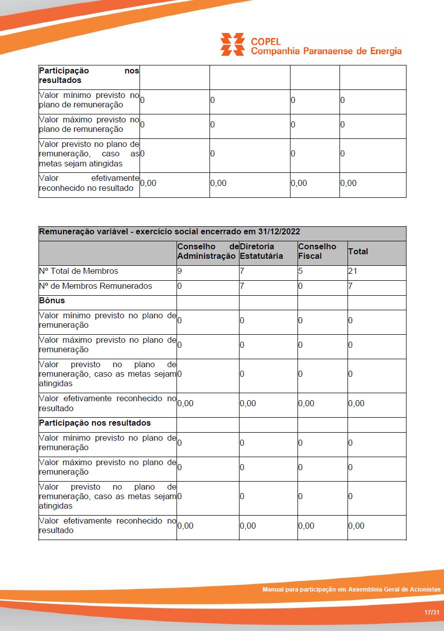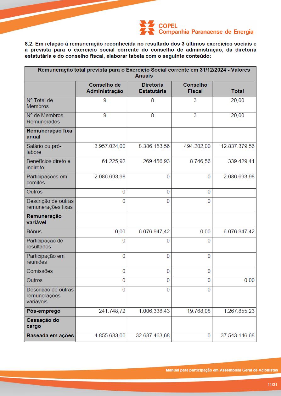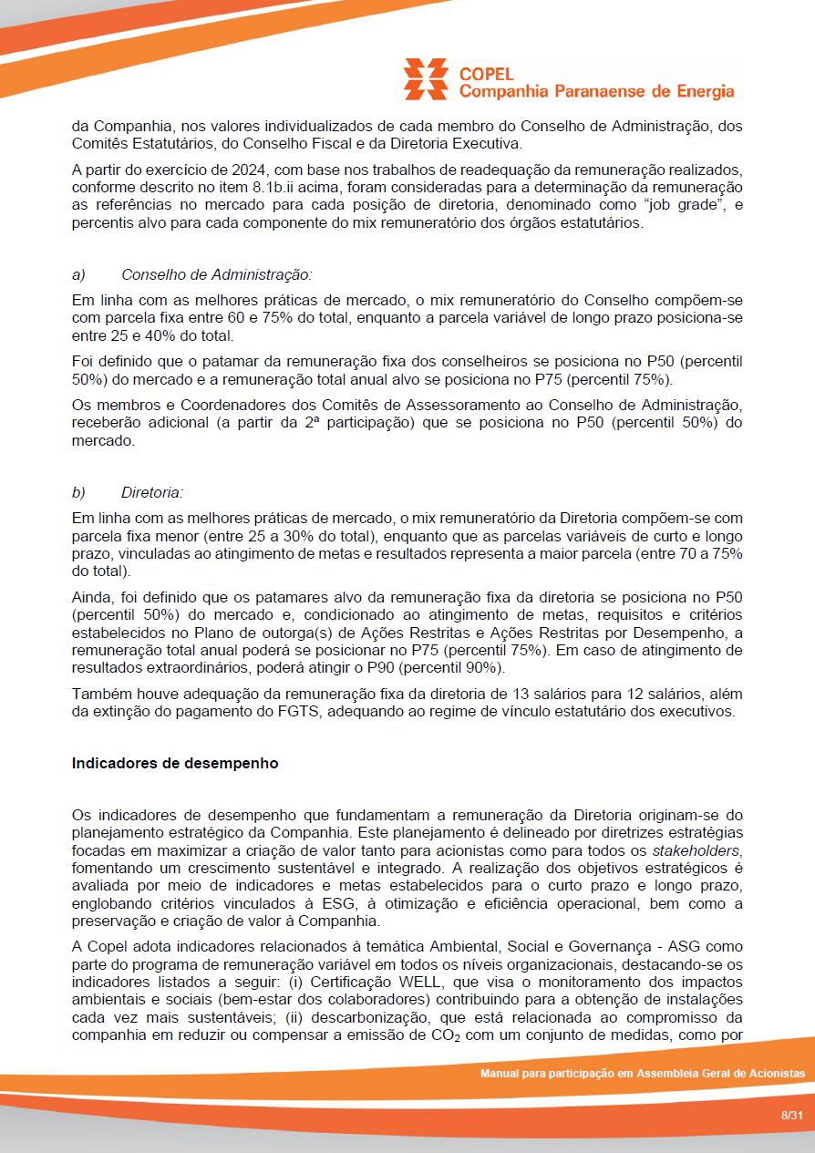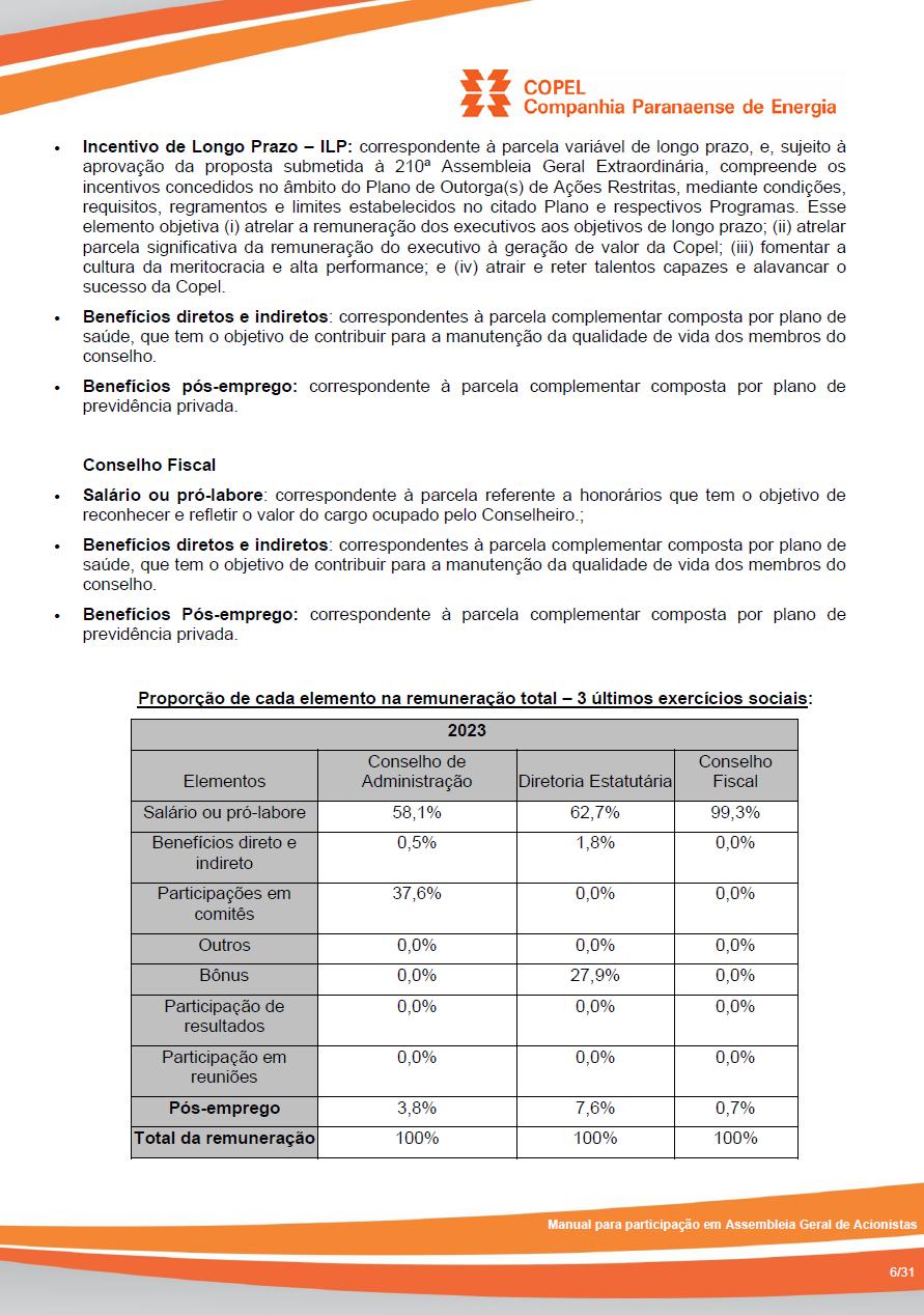 The General Meeting, in accordance with article 152 of Federal Law 6,404/1976, defines the annual remuneration of Copel's Directors, Officers, Audit Board Members and members of Statutory Committees.
