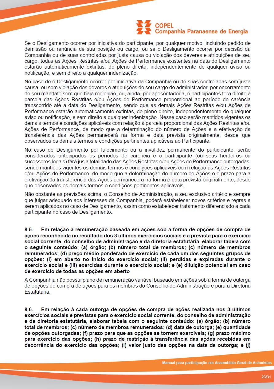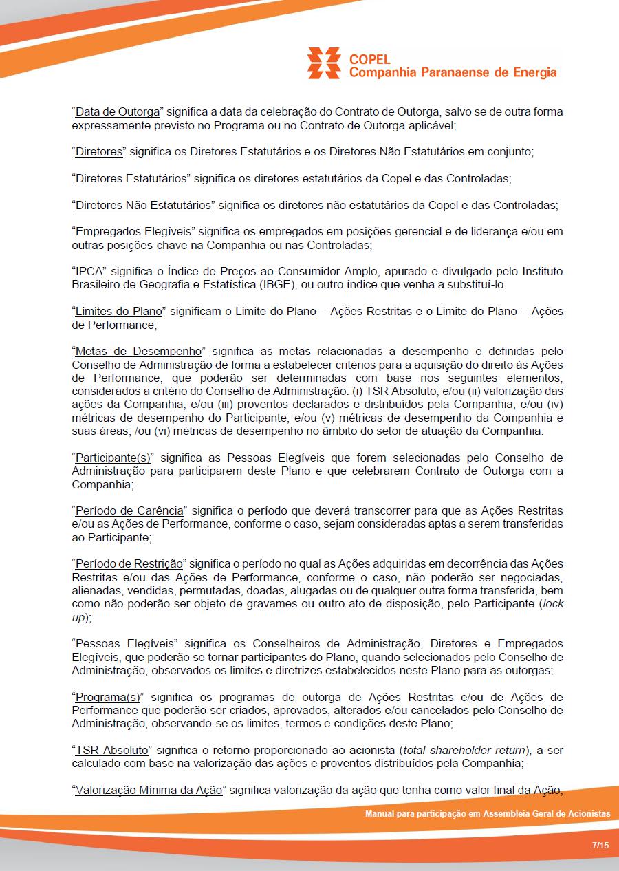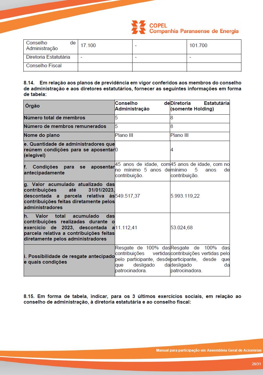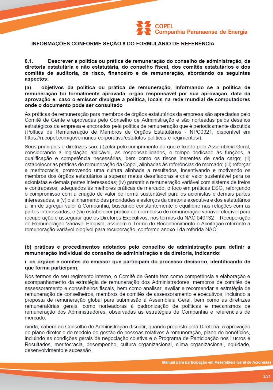 The General Meeting, in accordance with article 152 of Federal Law 6,404/1976, defines the annual remuneration of Copel's Directors, Officers, Audit Board Members and members of Statutory Committees.