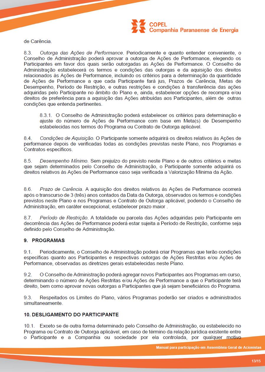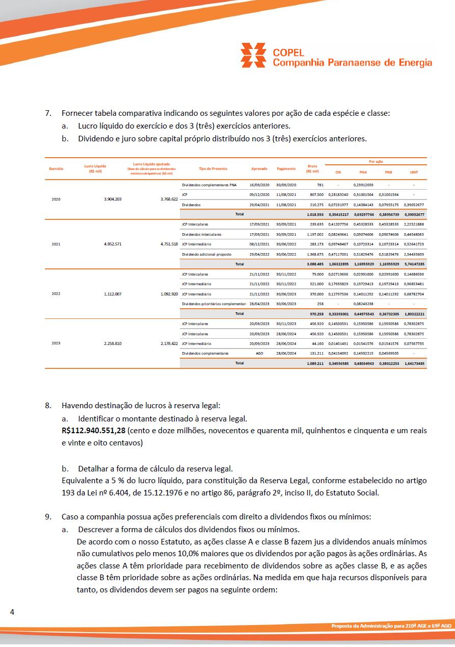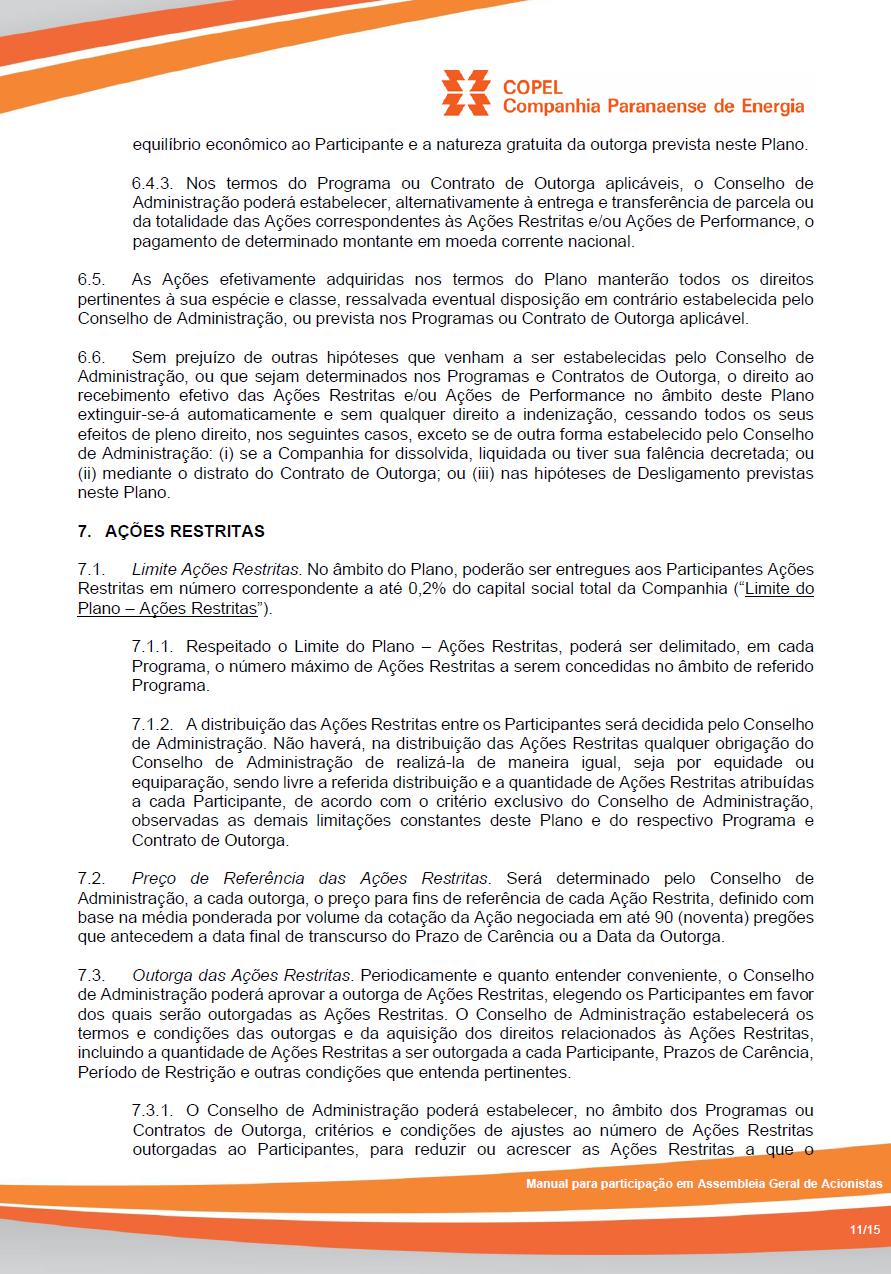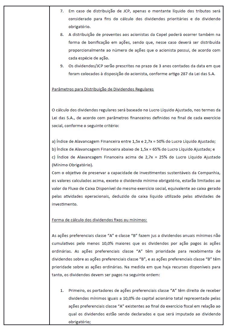 In this agenda item, shareholders holding ordinary shares and shareholders holding preferred shares have the right to vote. Pursuant to Article 6 of the Company's bylaws, no shareholder or group of shareholders, Brazilian or foreign, public or private, may exercise voting rights in excess of the percentage equivalent to 10% (ten percent) of the total number of shares into which Copel's voting capital is divided, regardless of their stake in the share capital.