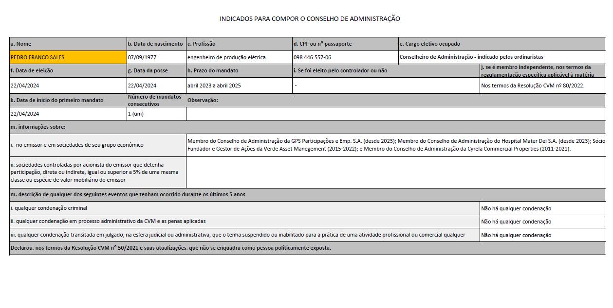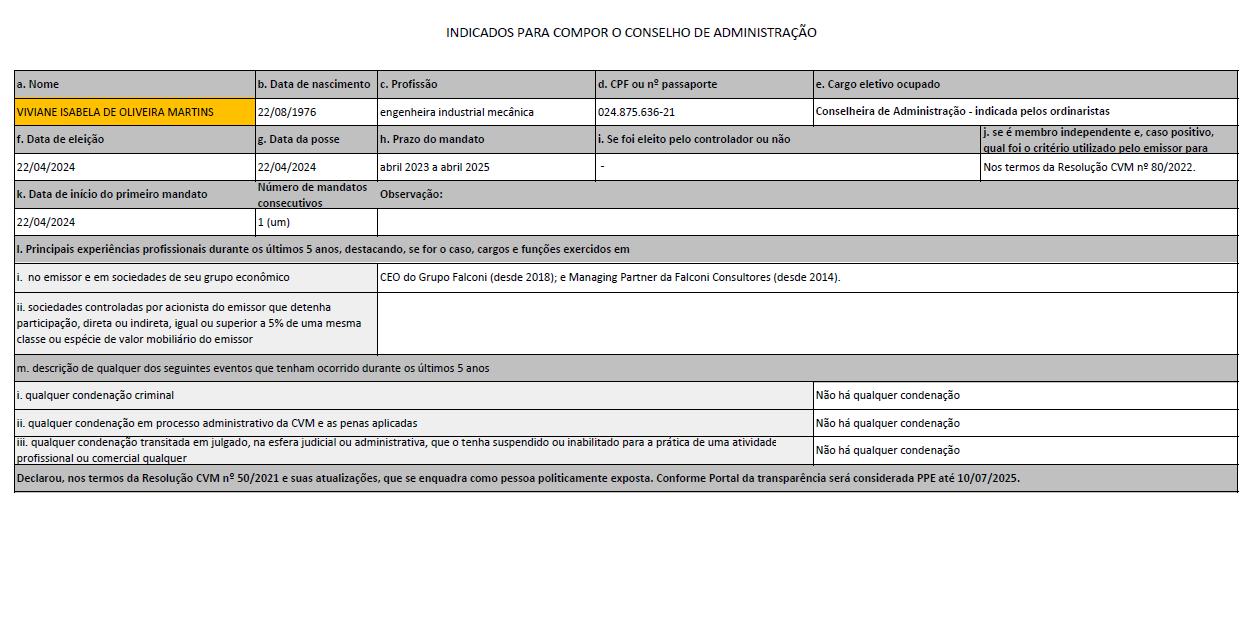 Pursuant to CVM Resolution no. 81/2022, the shareholders nominated for election/re-election the following members of the Supervisory Board for the 2024/2025 term of office: