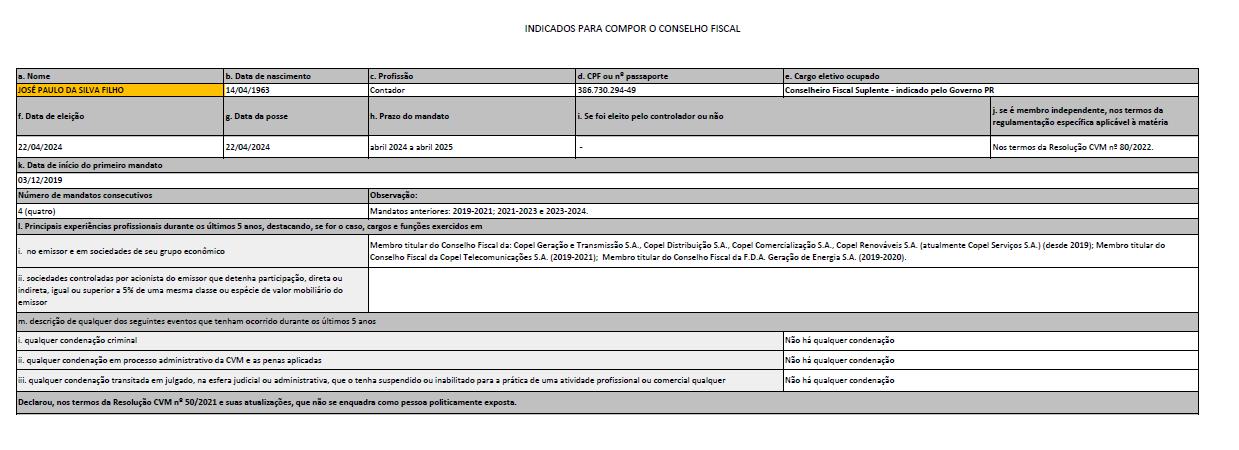 According to Annex II to this Proposal, the information on the candidates for election to Copel's Supervisory Board is available under the terms of items 7.3 to 7.6 of the Reference Form provided for in Annex C of CVM Resolution no. 80/2022.