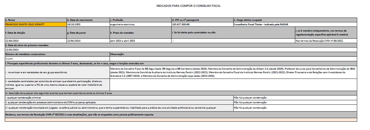 · FRANCISCO OLINTO VELO SCHMITT - Nominated by the shareholder Radar Gestora de Recursos Ltda.