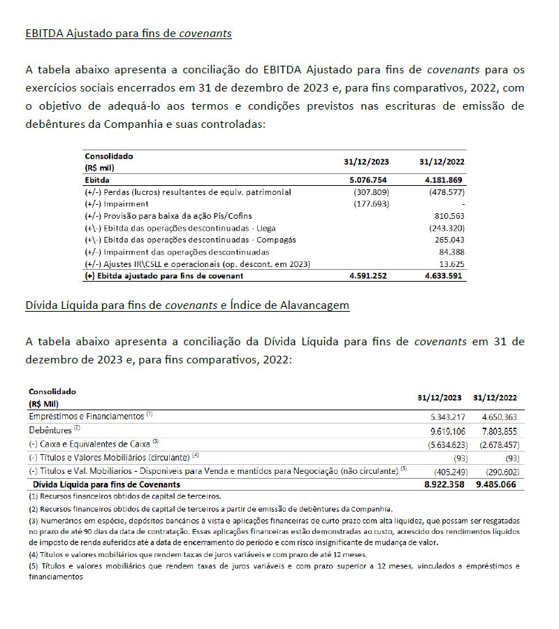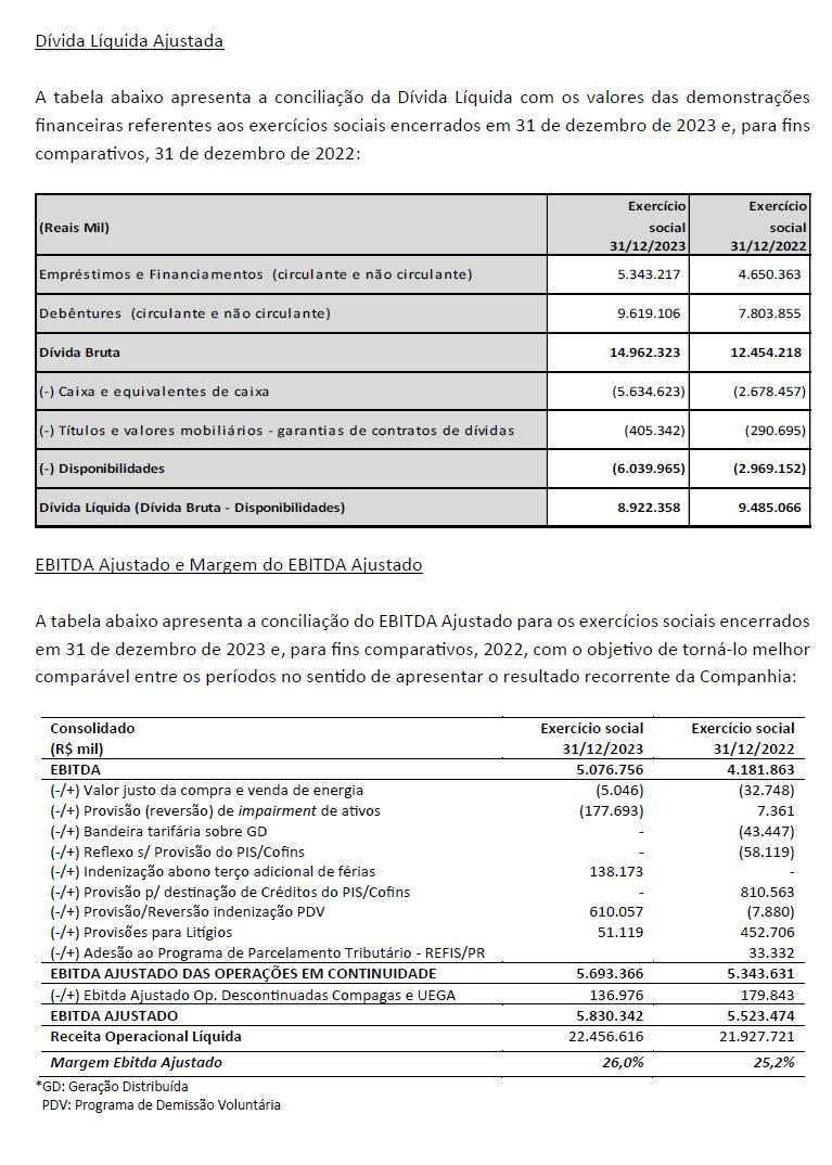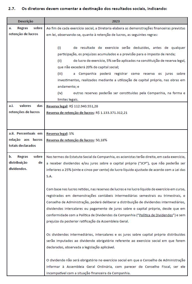 In 2023, the Financial Leverage Ratio was 1.94, so the proposed regular dividend is 50% of the adjusted net profit, totaling R$1,089,211.72 (one billion, eighty-nine million, two hundred and eleven thousand, three hundred and eighty-five reais, seventy-two cents). 385.72 (one billion, eighty-nine million, two hundred and eleven thousand, three hundred and eighty-five reais and seventy-two cents), of which R$958,000,000.00 (nine hundred and fifty-eight million reais) was already approved at the 242nd Ordinary Meeting of the Board of Directors, on September 20, 2023. The supplement, of R$131,211,385.72 (one hundred and thirty-one million, two hundred and eleven thousand, three hundred and eighty-five reais and seventy-two cents), is being proposed for resolution at the Annual General Meeting, as well as the ratification of the amount already approved at the 242nd Ordinary Meeting of the Board of Directors.