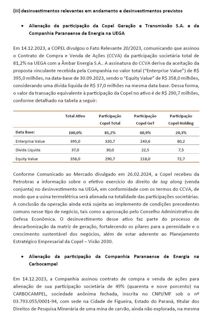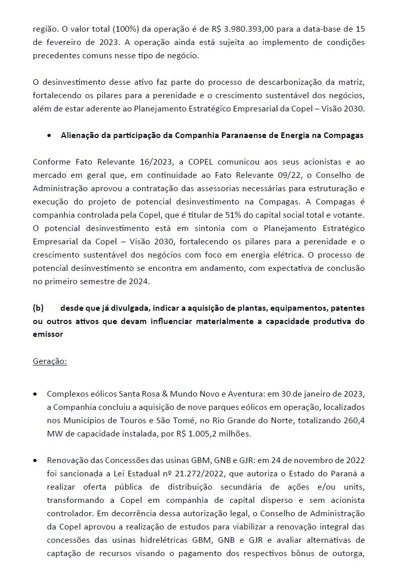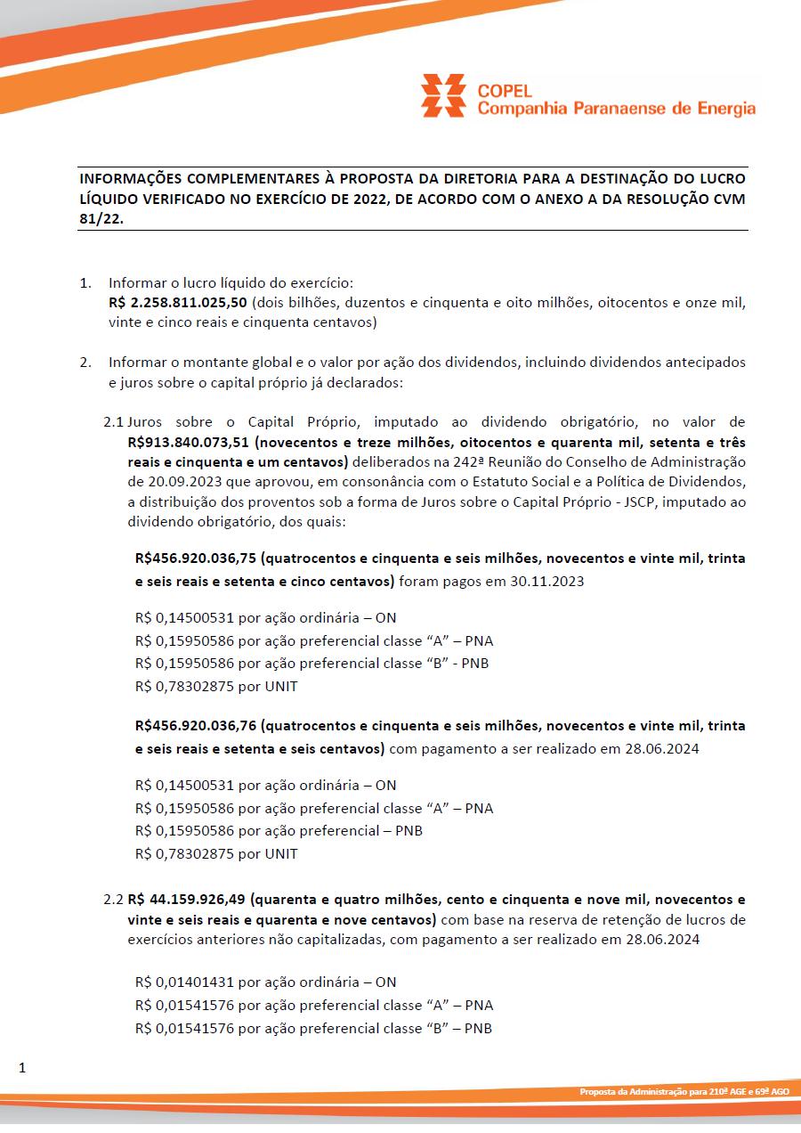 All the information and documents referred to in this Proposal and provided for in articles 10 to 13 of CVM Resolution 81/2022 are available to shareholders on its website (ri.copel.com) and on the website of the Brazilian Securities and Exchange Commission - CVM (gov.br/cvm), and were also included in the Annexes to this Proposal.