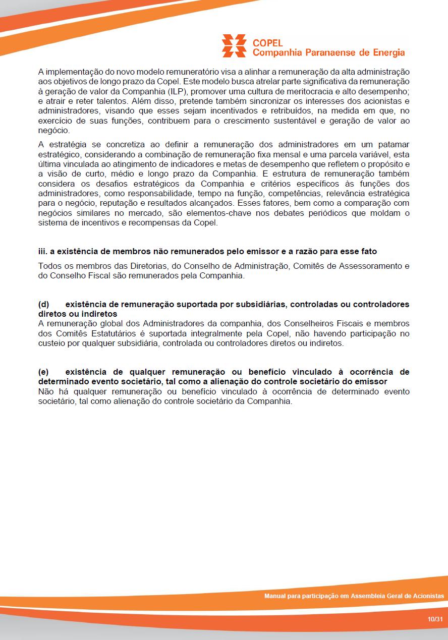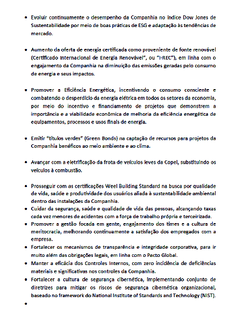In this way, we sought to improve the remuneration structure with the objectives of: (i) aligning the interests of executives and key positions with Copel's long-term strategic goals, promoting a direct connection between the remuneration strategy and the Company's sustainable success; (ii) linking a significant portion of remuneration to the generation of value for the Company; (iii) stimulating an organizational culture of meritocracy and high performance in the Company, recognizing exceptional results and encouraging continuous excellence; and (iv) retaining and attracting talent, offering a competitive remuneration package, aligned with Copel's strategy and purpose, which recognizes, rewards and encourages the creation of value for the Company.