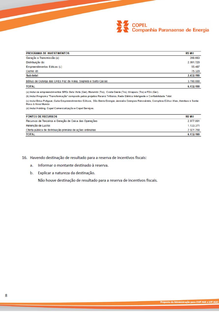 used to (i) ensure the Company's investment program and (ii) pay the grant bonus for the renewal of the concession for Foz do Areia, Segredo and Salto Caxias power plants. Among other sources, the capital budget provides for the retention of a portion of the net profit for the year in the amount of R$1,133,371,312.21 (one billion, one hundred and thirty-three million, three hundred and seventy-one thousand, three hundred and twelve reais and twenty-one cents) as part of the resources for implementing the capital budget. A copy of the capital budget is part of Annex IV to this proposal.