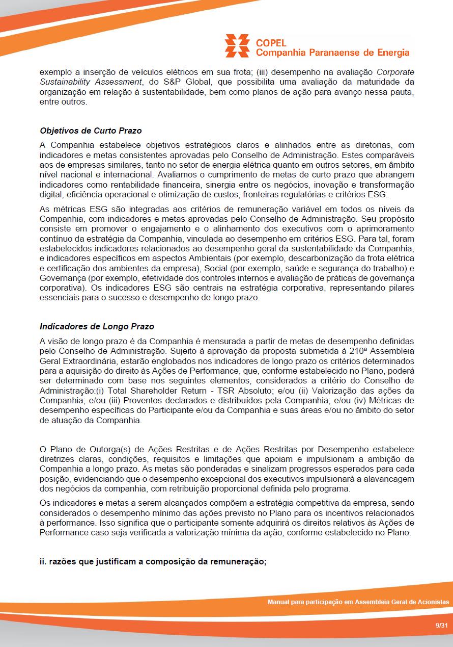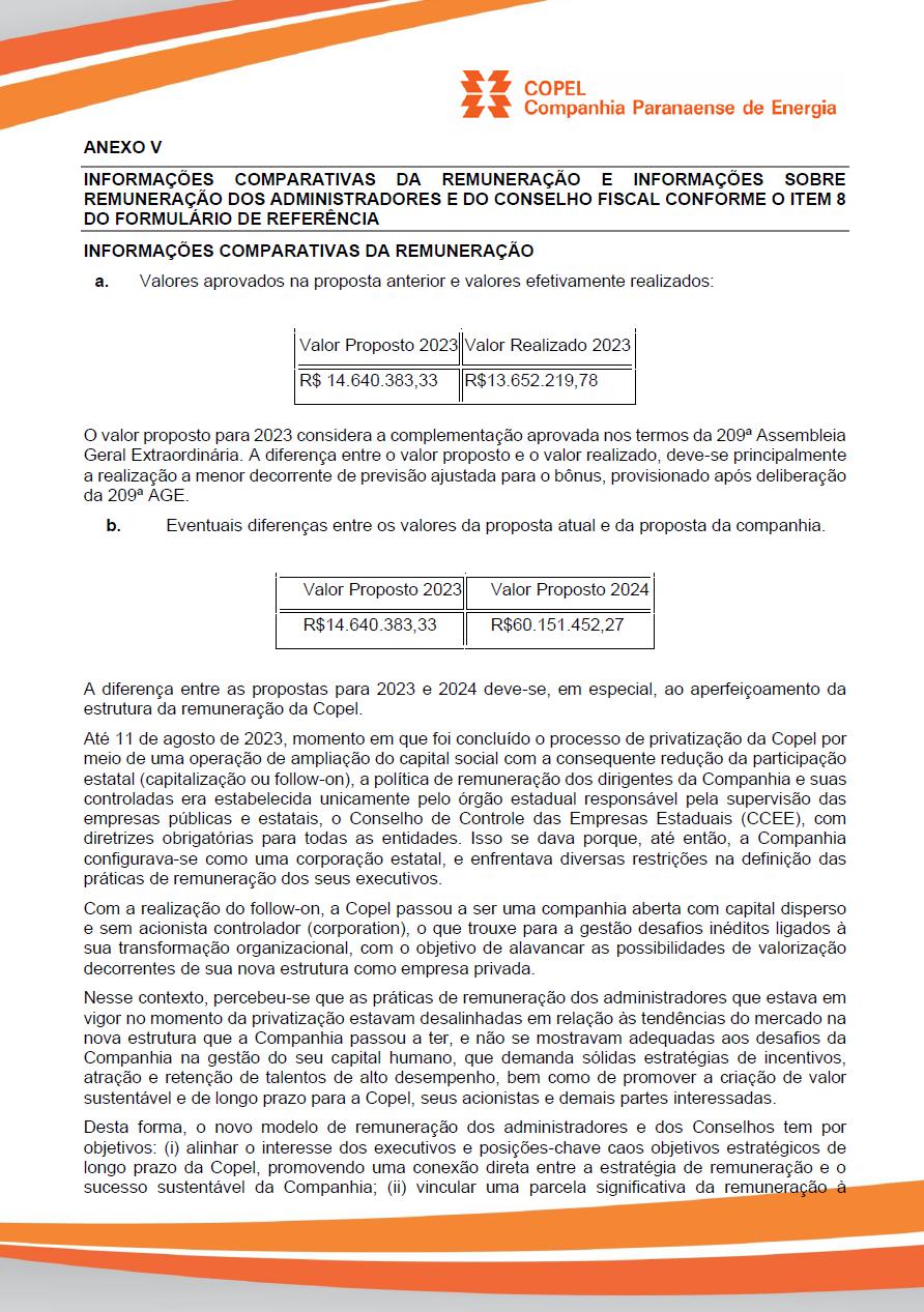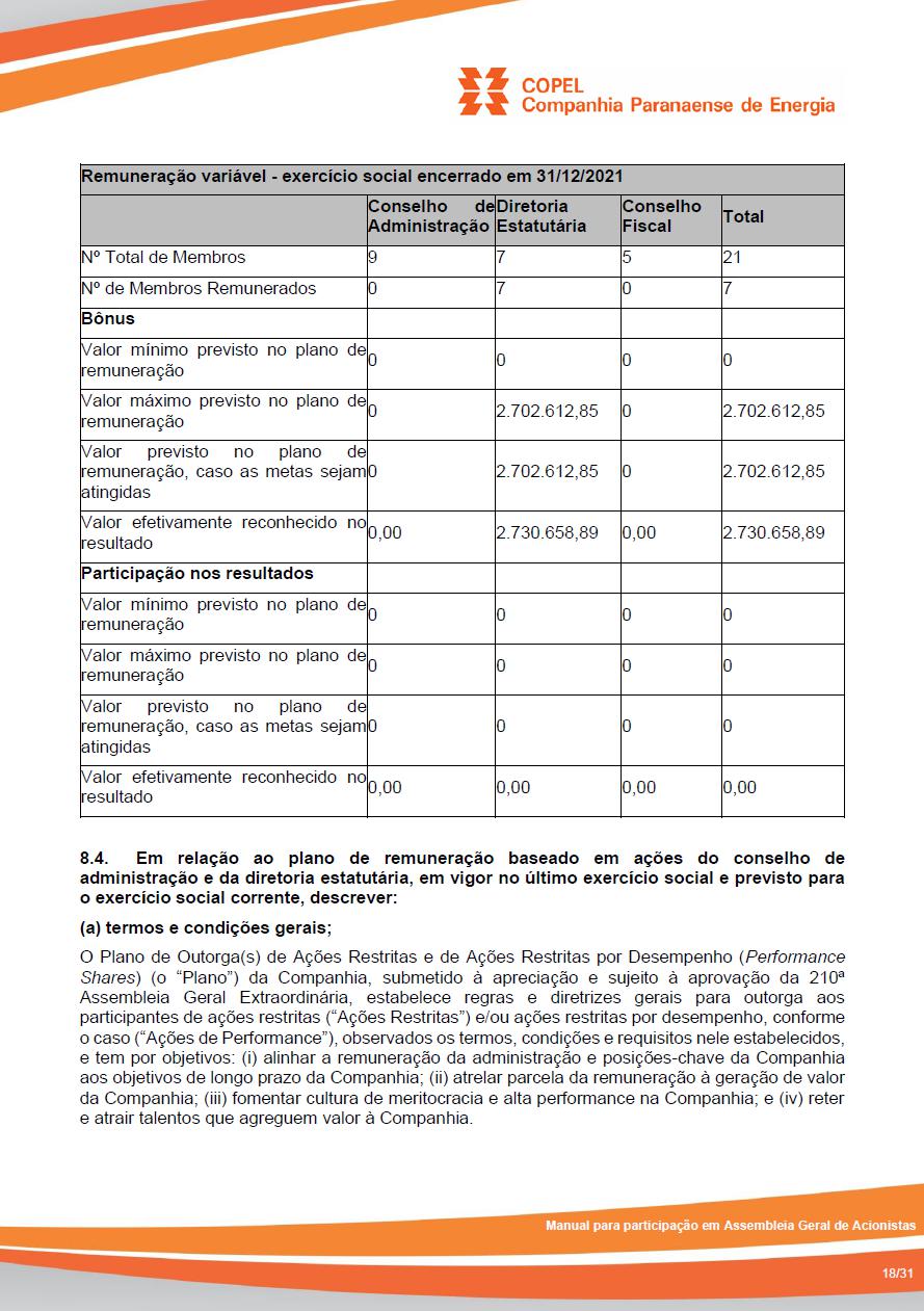 The Management proposes to the General Meeting the approval of an amount for the remuneration of Copel's senior managers, which includes the revision of the fixed portion and the short-term variable portion, as well as the adoption of a long-term incentive - ILP, the latter comprising the Restricted Shares and Performance-based Restricted Shares Granting Plan, which was approved by the 210th EGM.