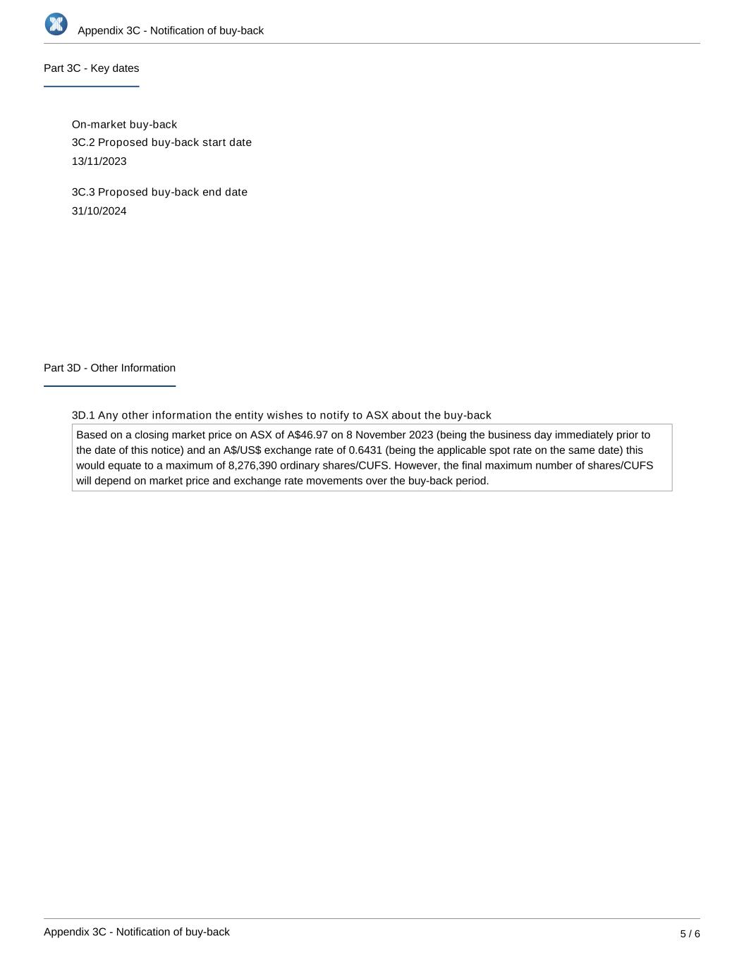 | | Update - Notification of buy-back - JHX |
