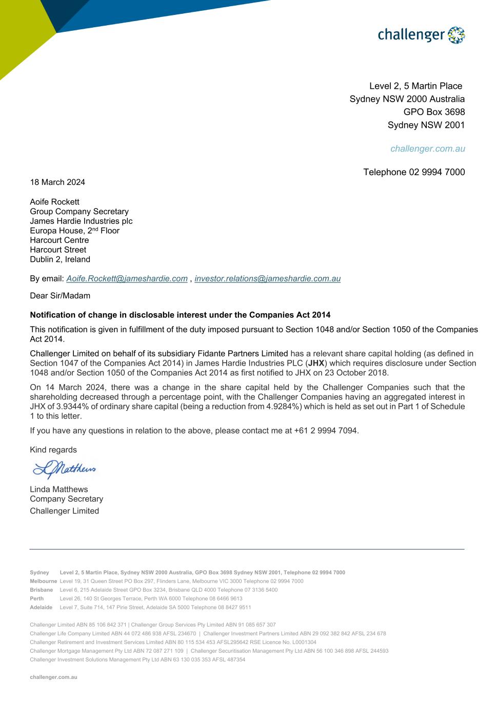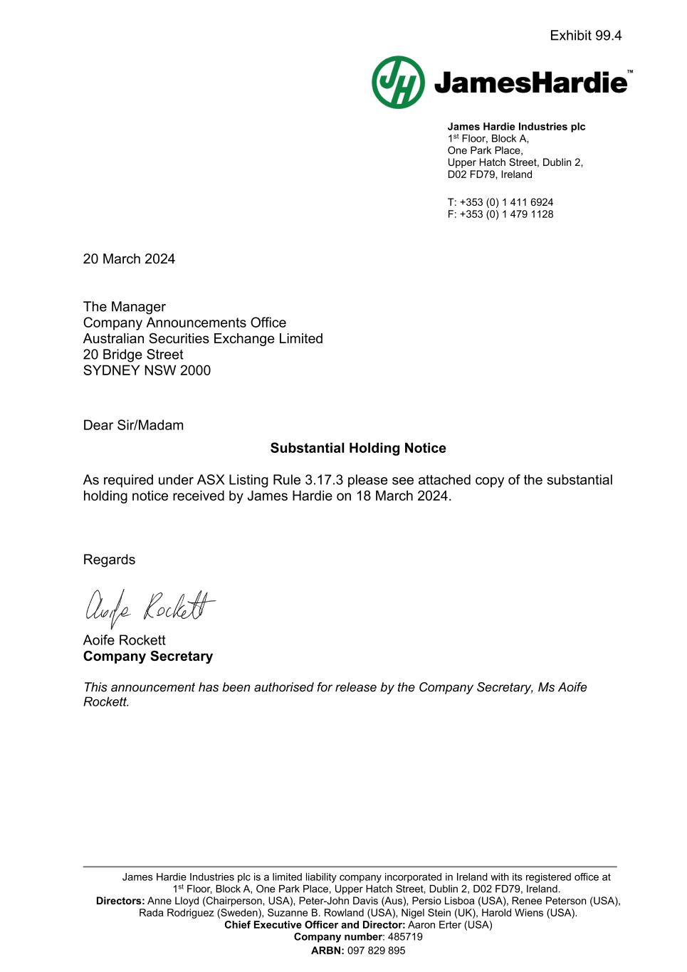 Forward-looking statements are based on the Company’s current expectations, estimates and assumptions and because forward-looking statements address future results, events and conditions, they, by their very nature, involve inherent risks and uncertainties, many of which are unforeseeable and beyond the Company’s control. Such known and unknown risks, uncertainties and other factors may cause actual results, performance or other achievements to differ materially from the anticipated results, performance or achievements expressed, projected or implied by these forward-looking statements. These factors, some of which are discussed under “Risk Factors” in Section 3 of the Form 20-F filed with the Securities and Exchange Commission on 16 May 2023, include, but are not limited to: all matters relating to or arising out of the prior manufacture of products that contained asbestos by current and former Company subsidiaries; required contributions to AICF, any shortfall in AICF funding and the effect of currency exchange rate movements on the amount recorded in the Company’s financial statements as an asbestos liability; compliance with and changes in tax laws and treatments; competition and product pricing in the markets in which the Company operates; the consequences of product failures or defects; exposure to environmental, asbestos, putative consumer class action or other legal proceedings; general economic and market conditions; the supply and cost of raw materials; possible increases in competition and the potential that competitors could copy the Company’s products; compliance with and changes in environmental and health and safety laws; risks of conducting business internationally; compliance with and changes in laws and regulations; currency exchange risks; dependence on customer preference and the concentration of the Company’s customer base; dependence on residential and commercial construction markets; the effect of adverse changes in climate or weather patterns; use of accounting estimates; and all other risks identified in the Company’s reports filed with Australian, Irish and US securities regulatory agencies and exchanges (as appropriate). The Company cautions you that the foregoing list of factors is not exhaustive and that other risks and uncertainties may cause actual results to differ materially from those referenced in the Company’s forward-looking statements. Forward-looking statements speak only as of the date they are made and are statements of the Company’s current expectations concerning future results, events and conditions. The Company assumes no obligation to update any forward-looking statements or information except as required by law.
