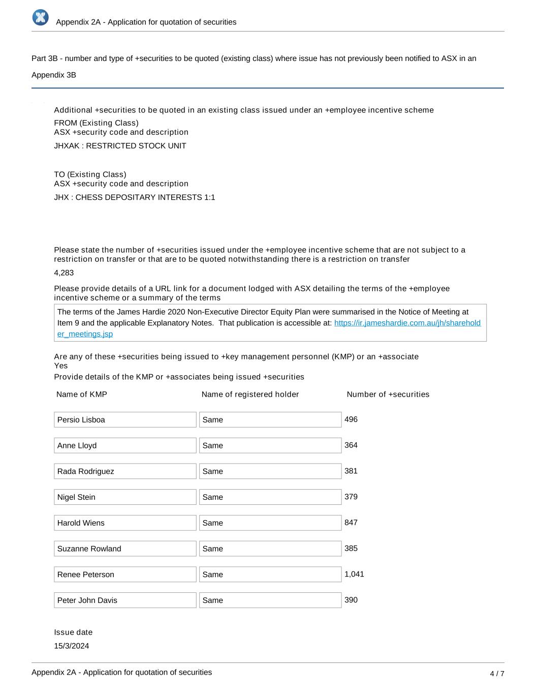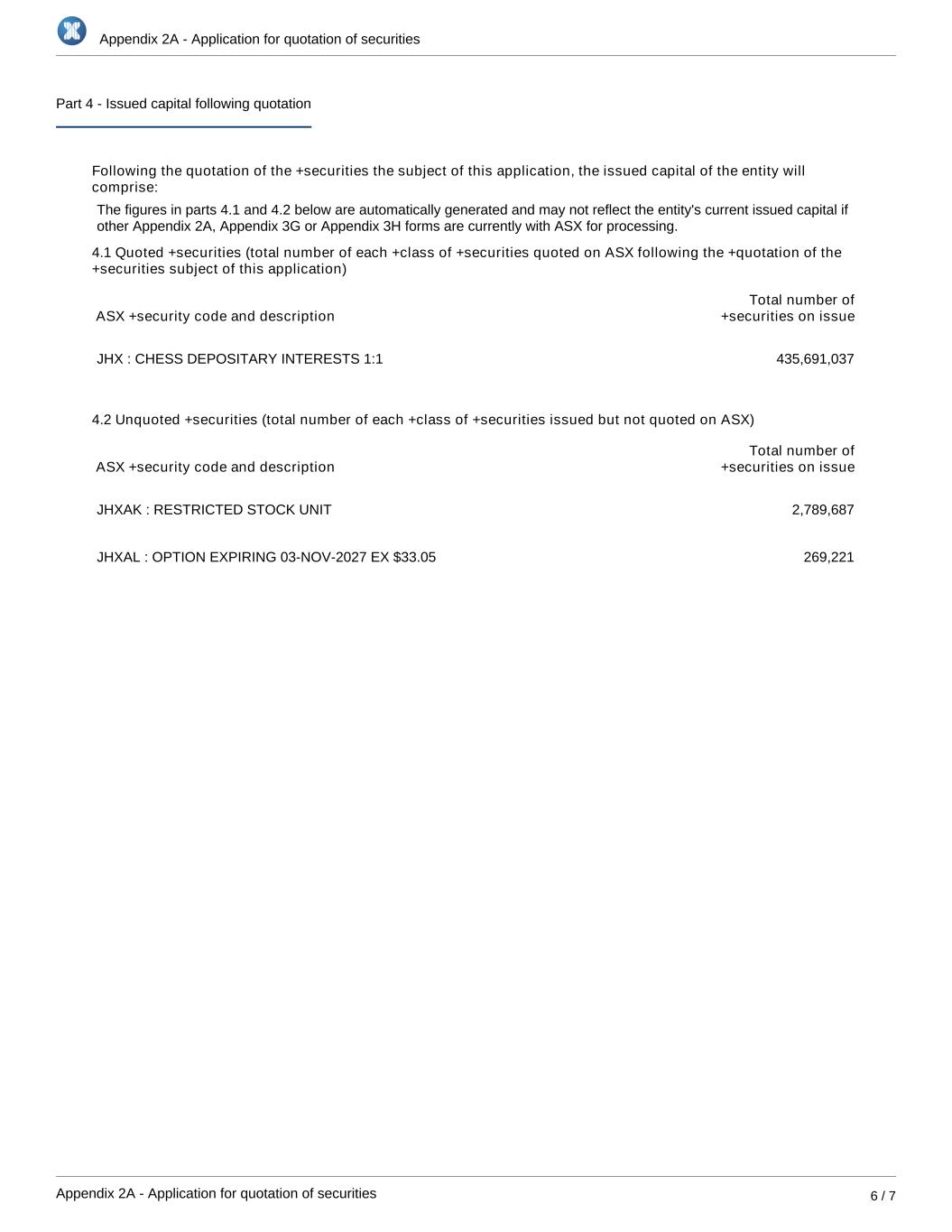 | | Application for quotation of securities - JHX |