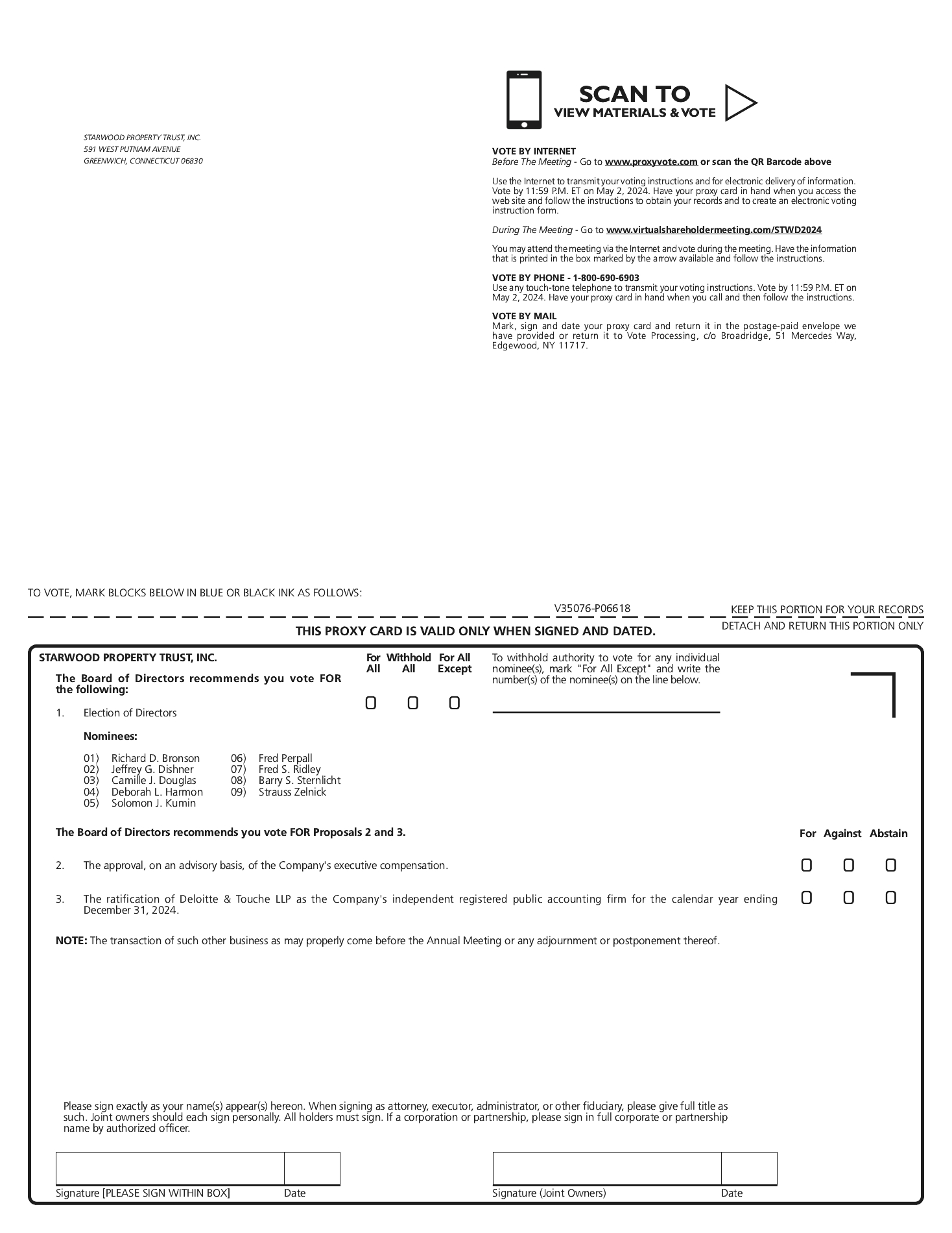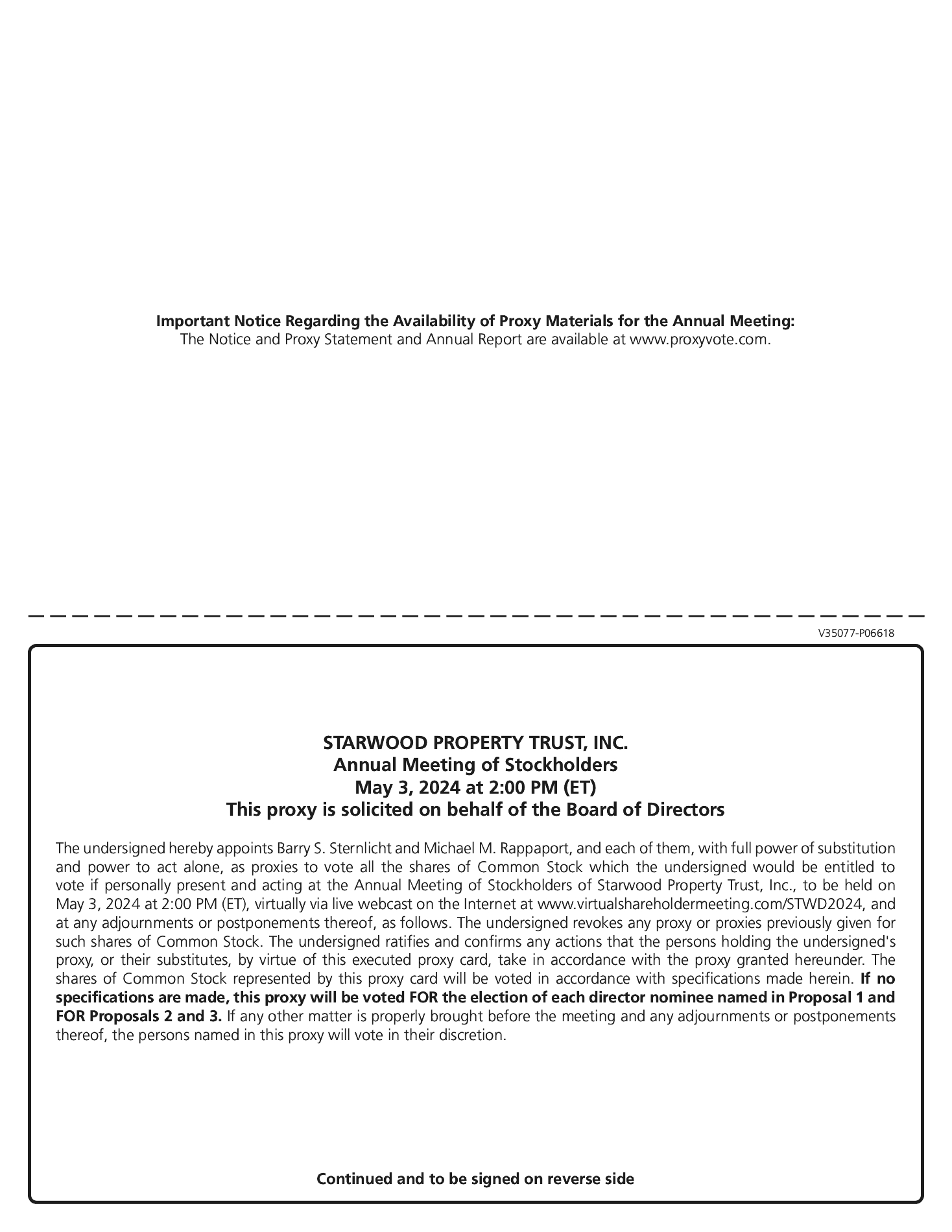 The Board has four standing committees: an Audit Committee, a Nominating and Corporate Governance Committee, a Compensation Committee and an Investment Committee. The current charters for each of the Audit Committee, Nominating and Corporate Governance Committee and Compensation Committee are available on the Company’s website, www.starwoodpropertytrust.com, under the heading “Investor Relations” and the subheading “Corporate Governance.” Further, the Company will provide copies of these charters, without charge, to any shareholder upon written request to the Company’s Secretary at Starwood Property Trust, Inc., 591 West Putnam Avenue, Greenwich, Connecticut 06830.