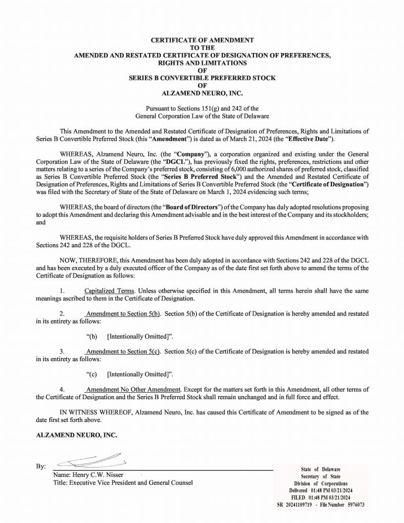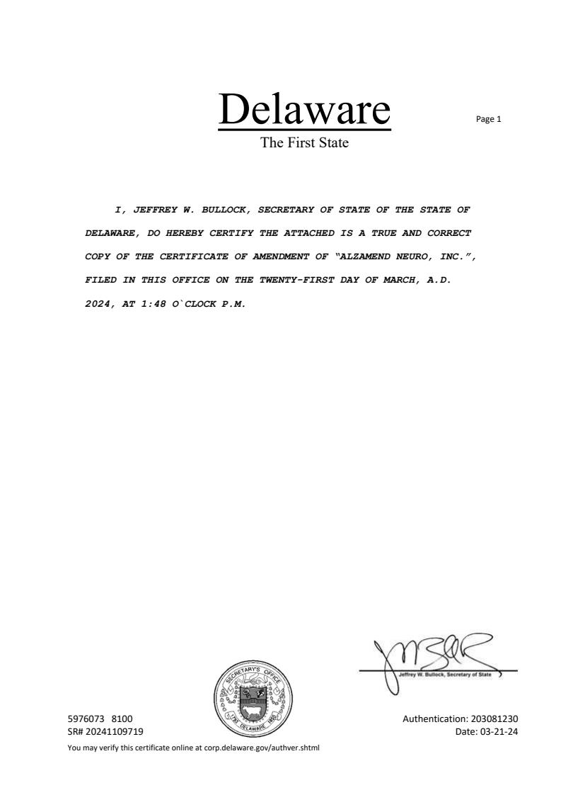 DelawareThe First StatePage 1 5976073 8100Authentication: 203081230SR# 20241109719Date: 03-21-24You may verify this certificate online at corp.delaware.gov/authver.shtmlI, JEFFREY W. BULLOCK, SECRETARY OF STATE OF THE STATE OF DELAWARE, DO HEREBY CERTIFY THE ATTACHED IS A TRUE AND CORRECT COPY OF THE CERTIFICATE OF AMENDMENT OF "ALZAMEND NEURO, INC.", FILED IN THIS OFFICE ON THE TWENTY-FIRST DAY OF MARCH, A.D. 2024, AT 1:48 O`CLOCK P.M.